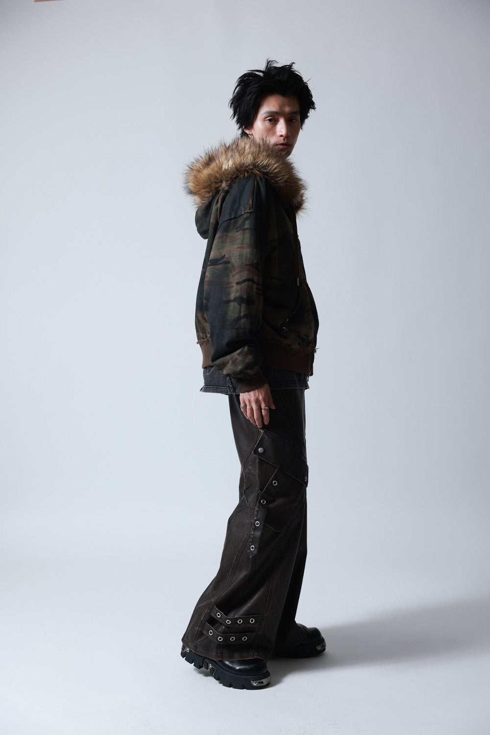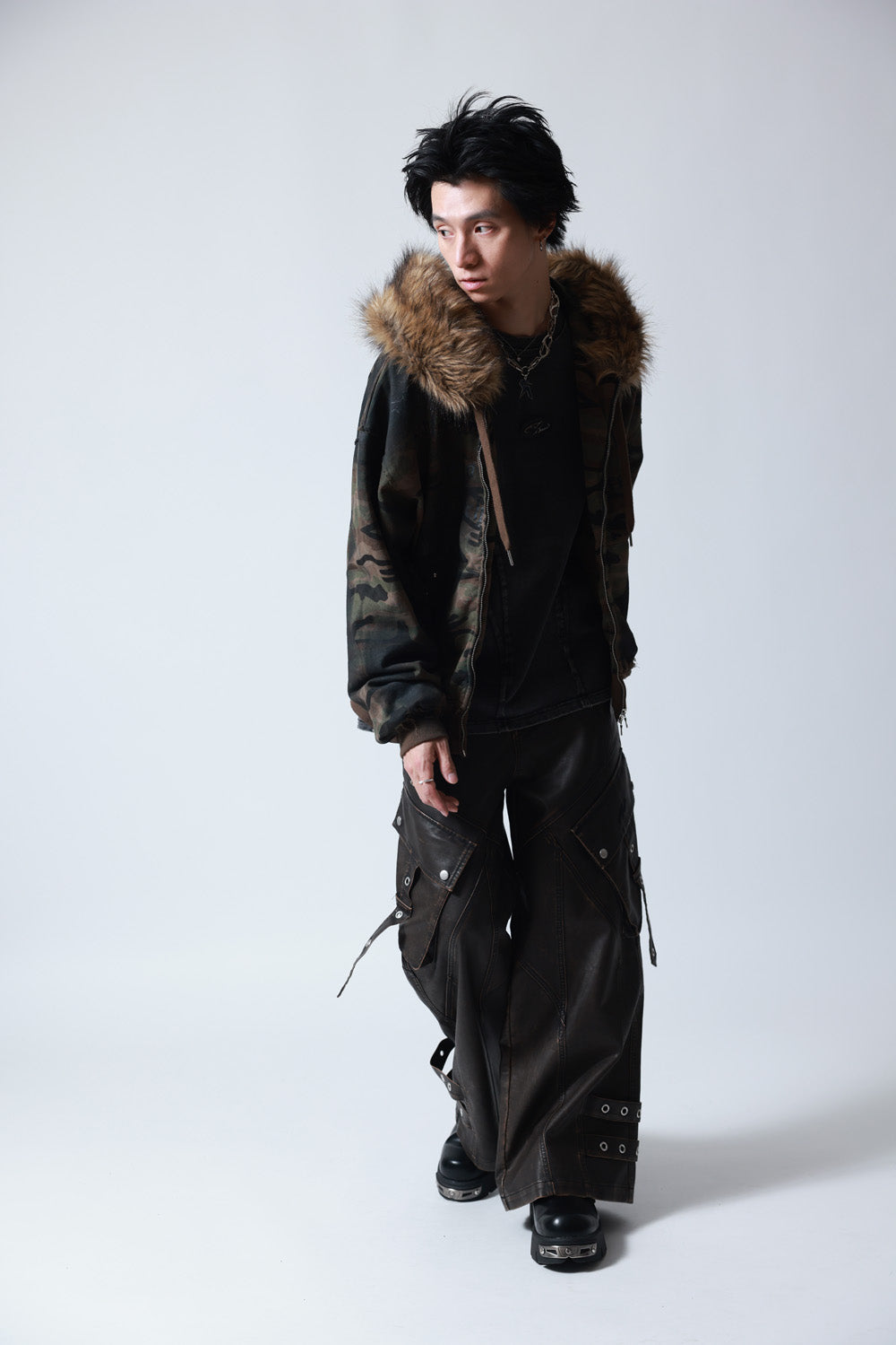 ボリュームのあるフェイクファーで首元のアクセントを強調し、短めの着丈とワイドな身幅はでトレンドをキープしつつエッジの効いたスタイリングを完成させます。