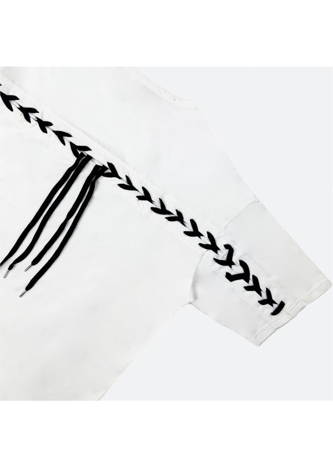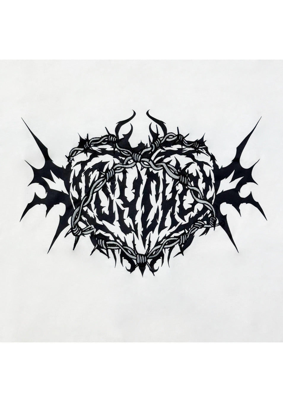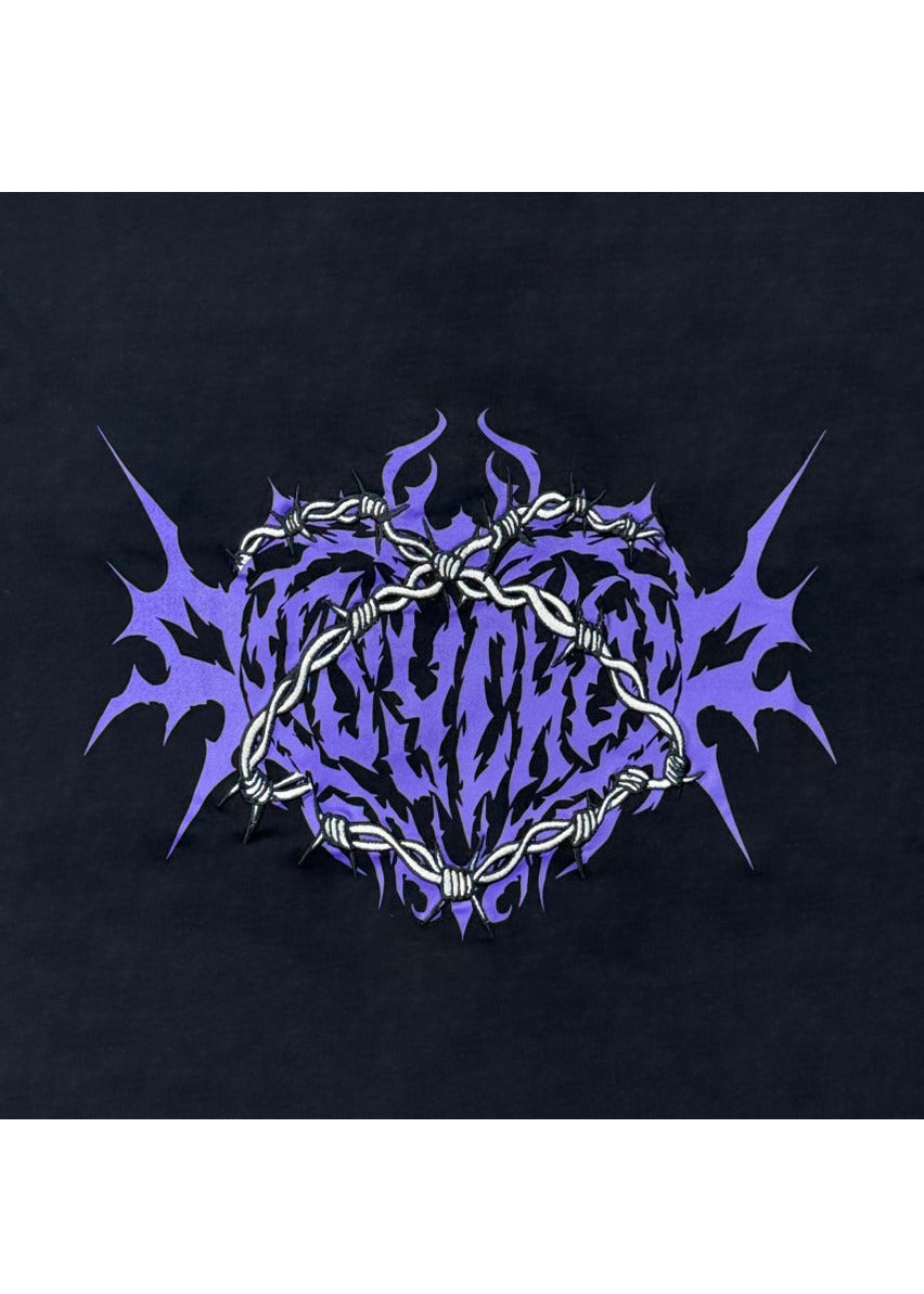 フロントはトライバルに有刺鉄線をはりめぐらせたハードなハートロゴ、袖先から背中にかけてレースアップデザインを施したテクニカルなデザインが個性爆発のTEEです。ハードさの中に可愛さが入り混じったPSYCHO NATIONらしいデザインが目を惹くアイテムです。