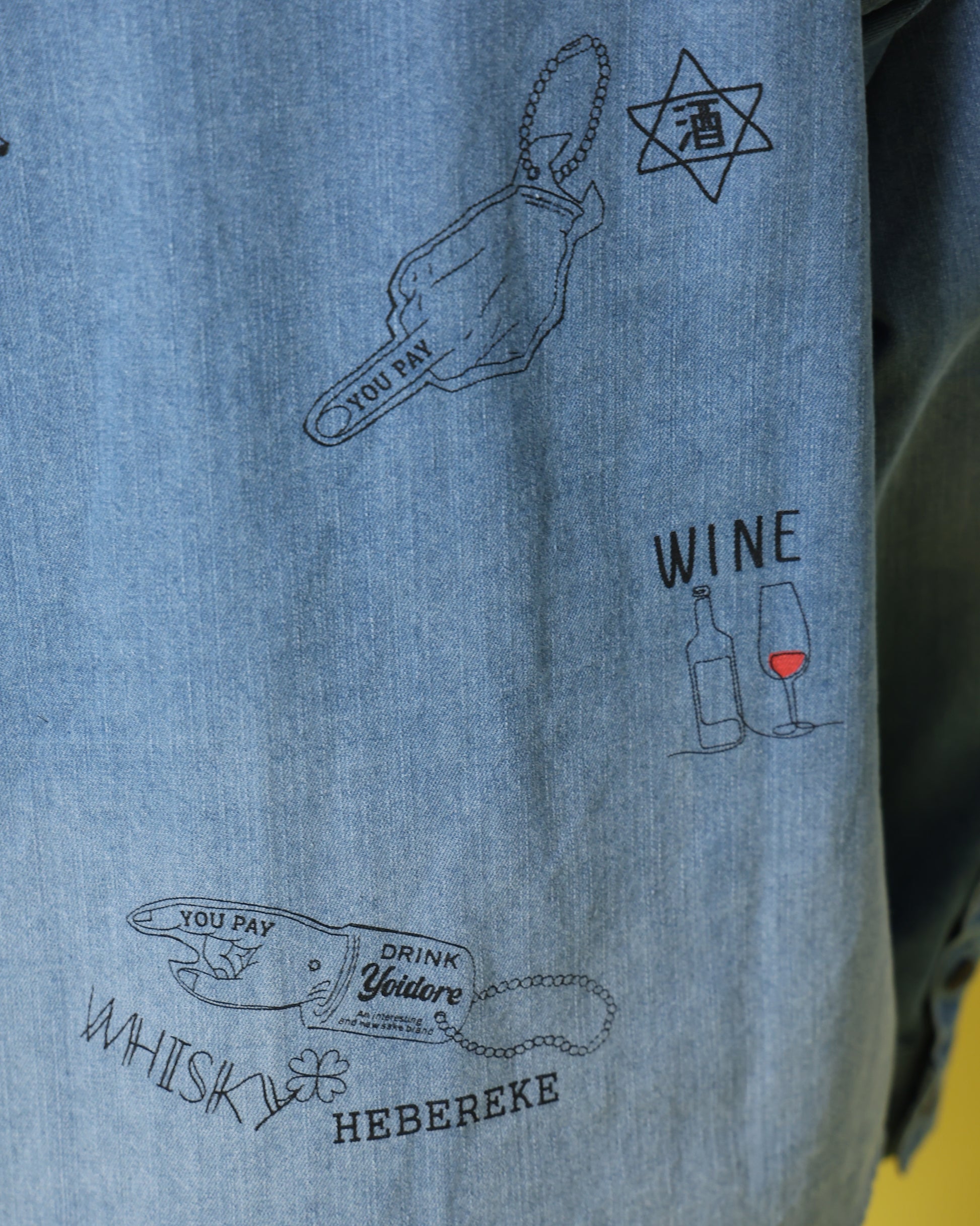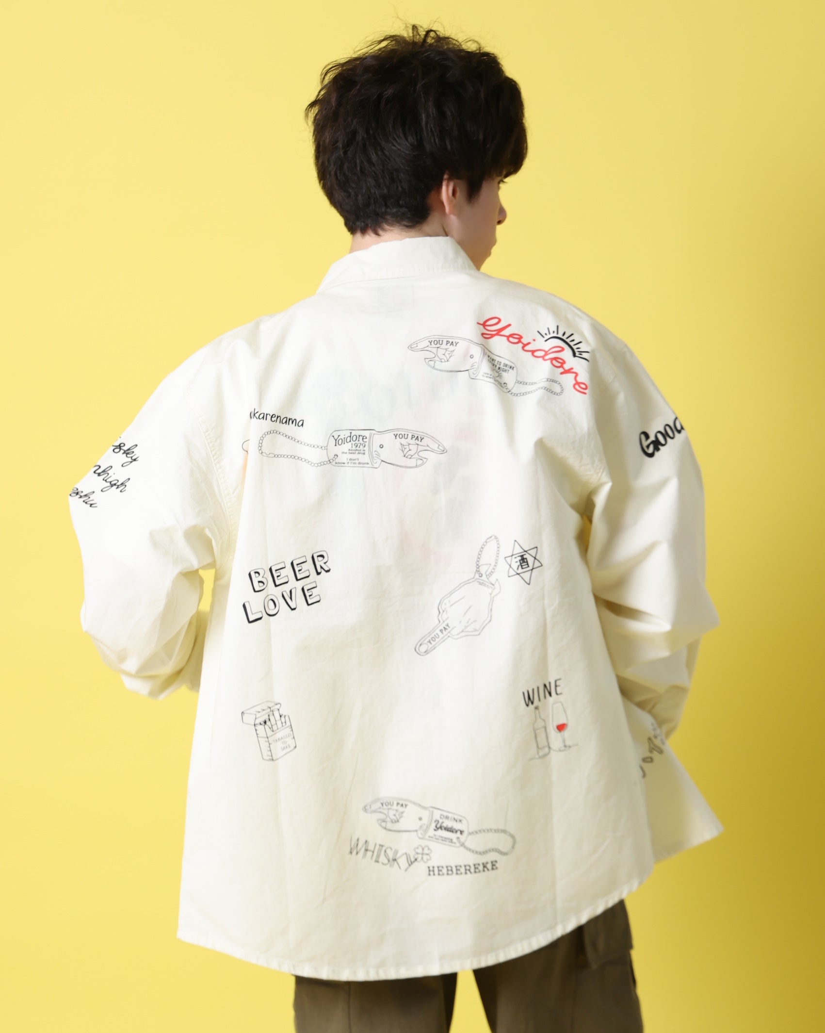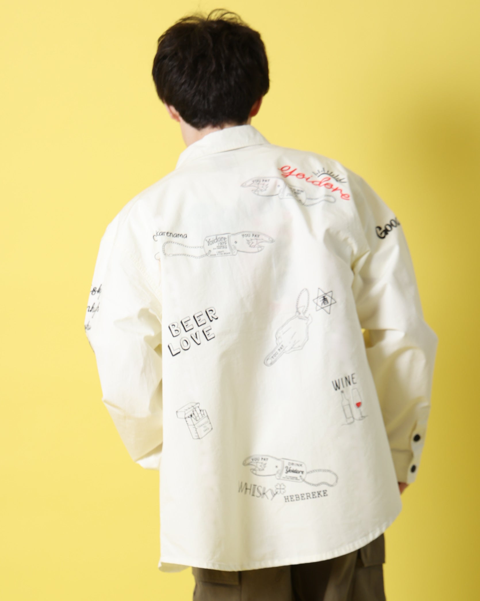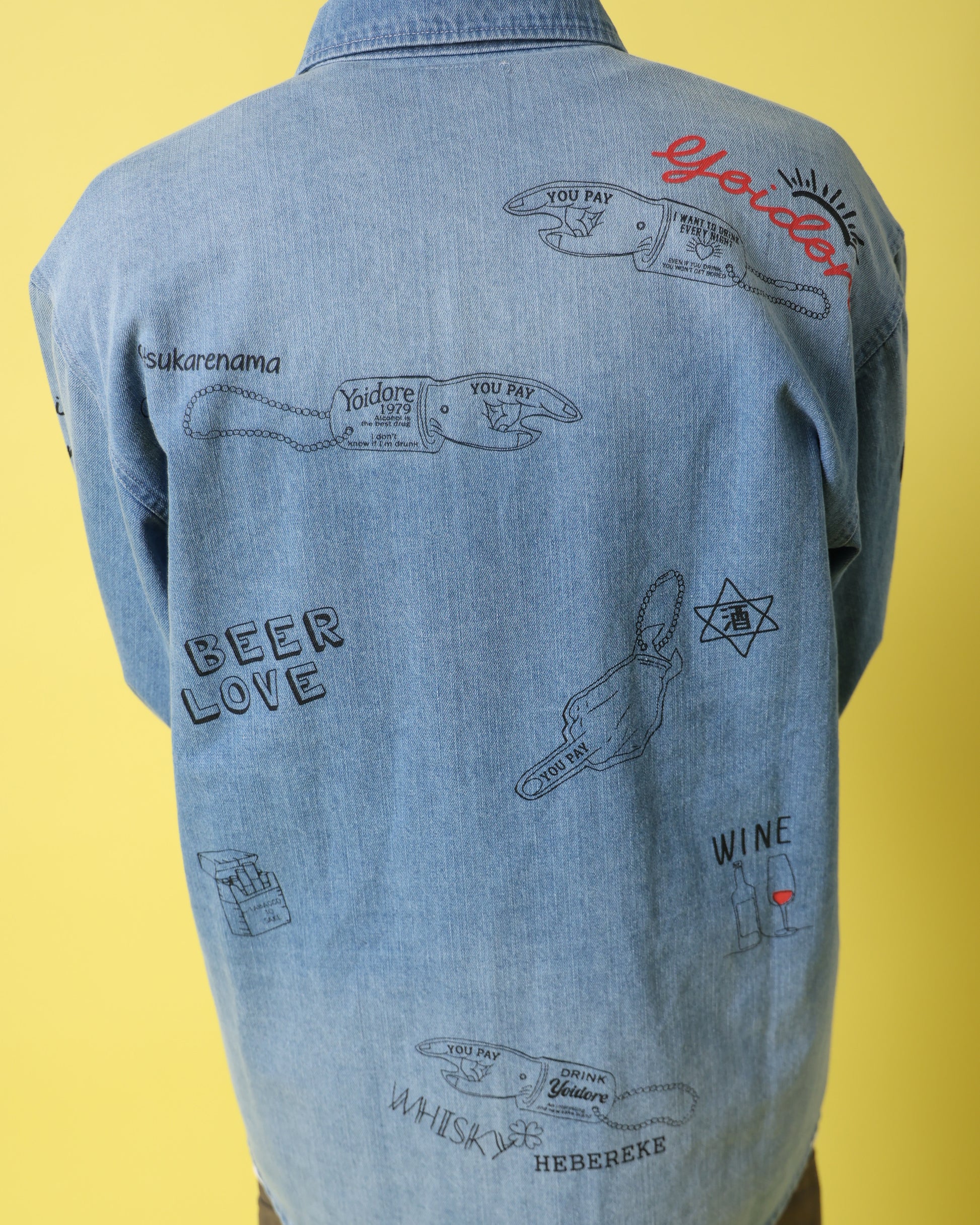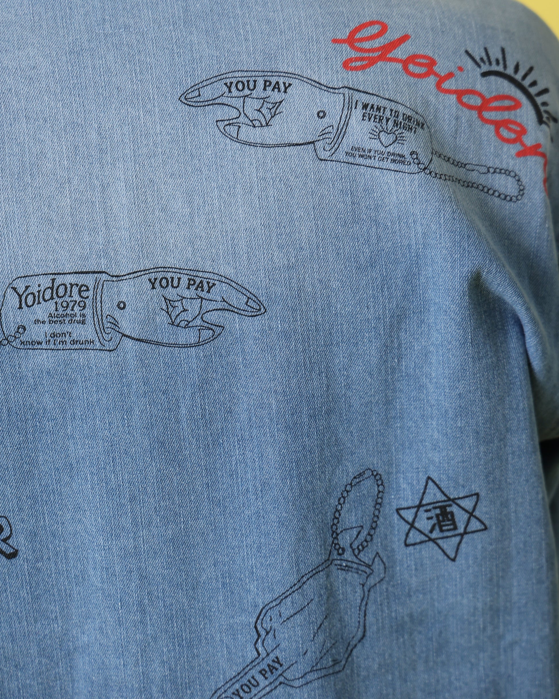 手型のヴィンテージ栓抜きイラストと様々なYOIDOREワードをらくがき風に随所にちりばめたワークテイストなシャツです。