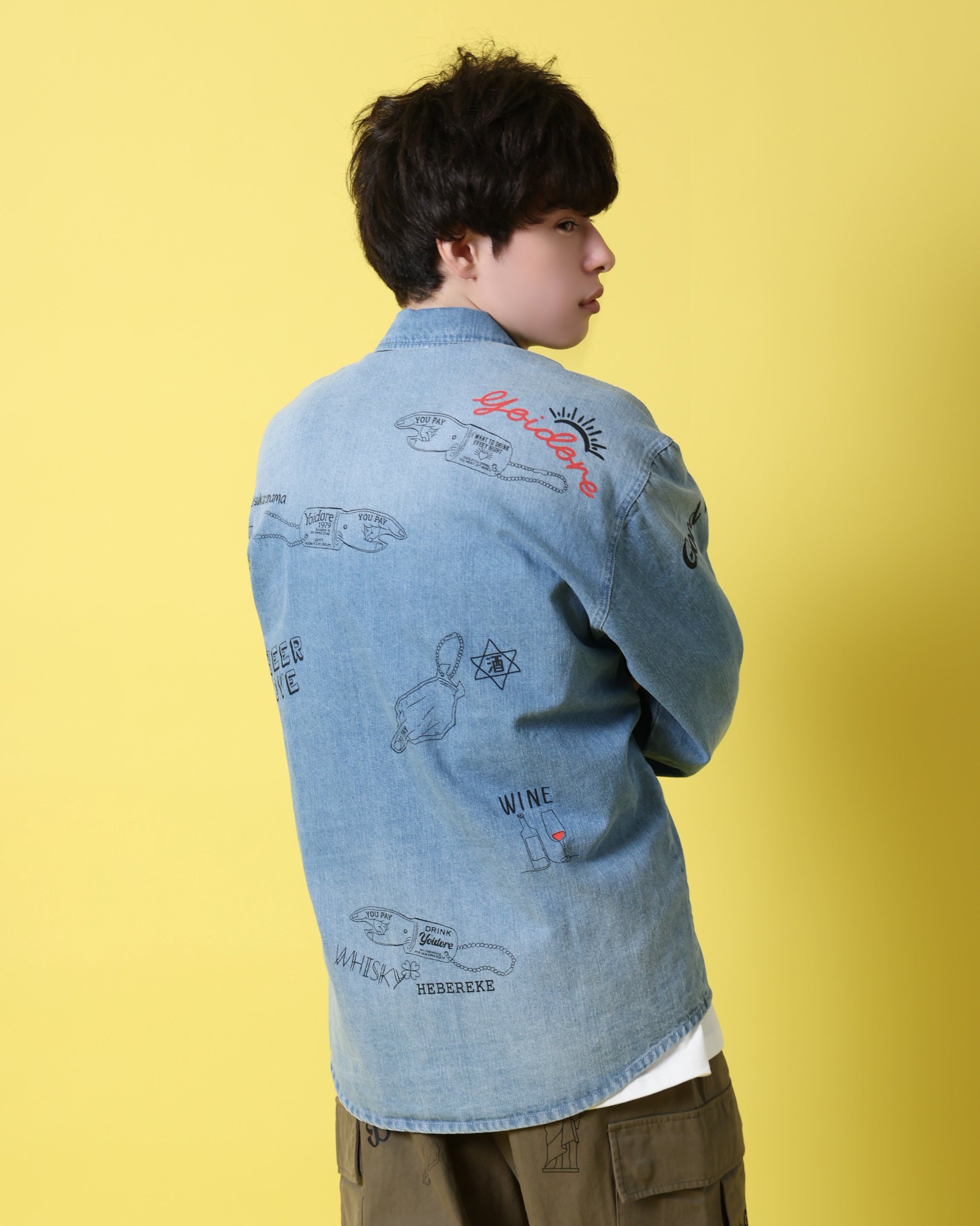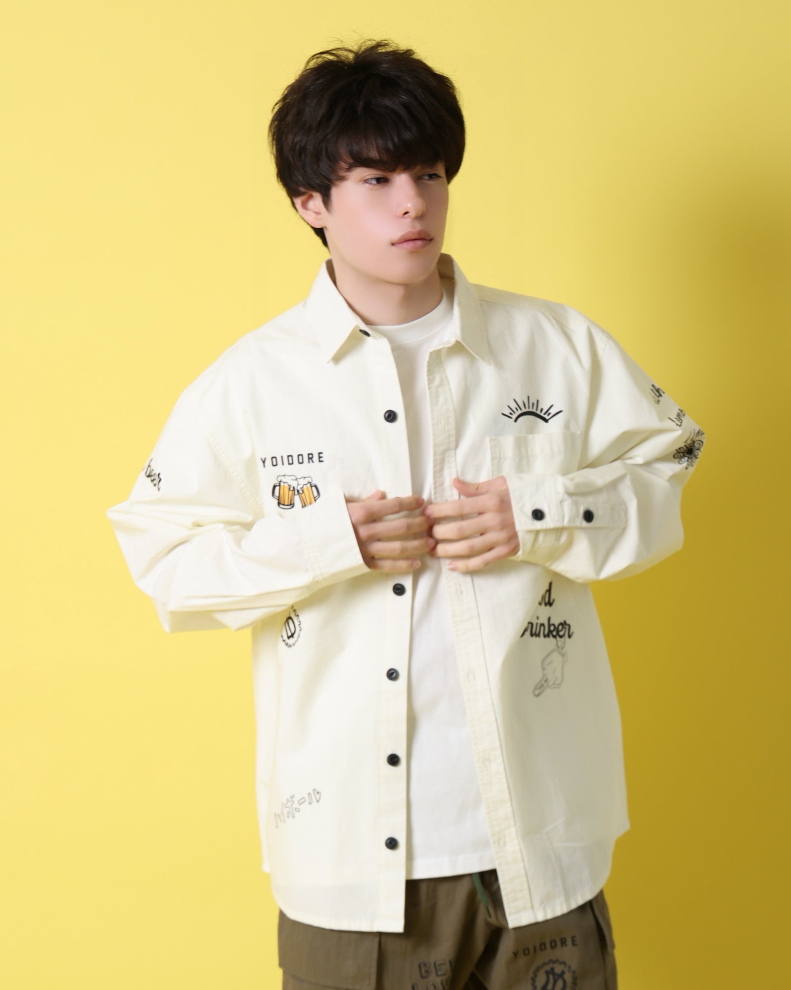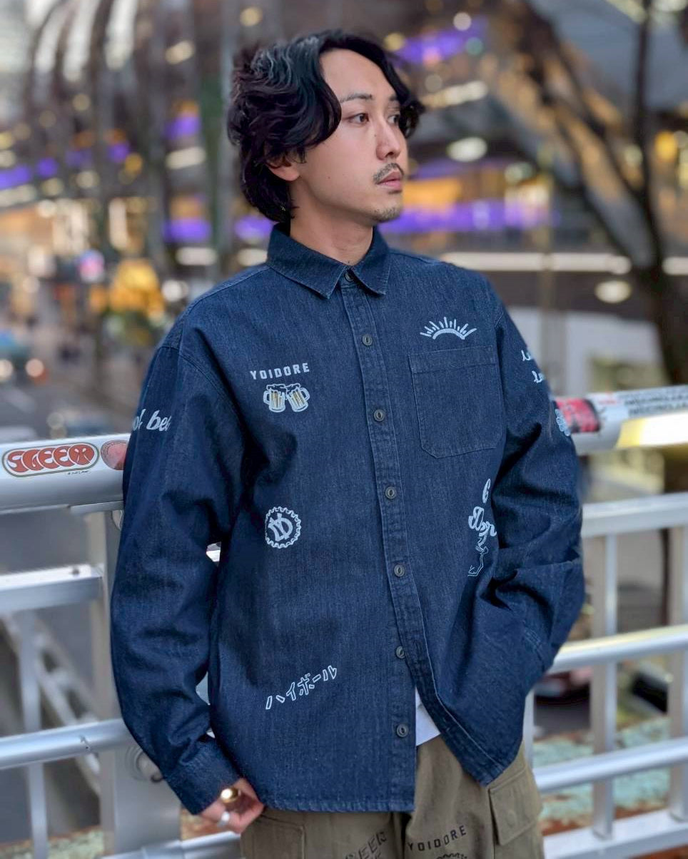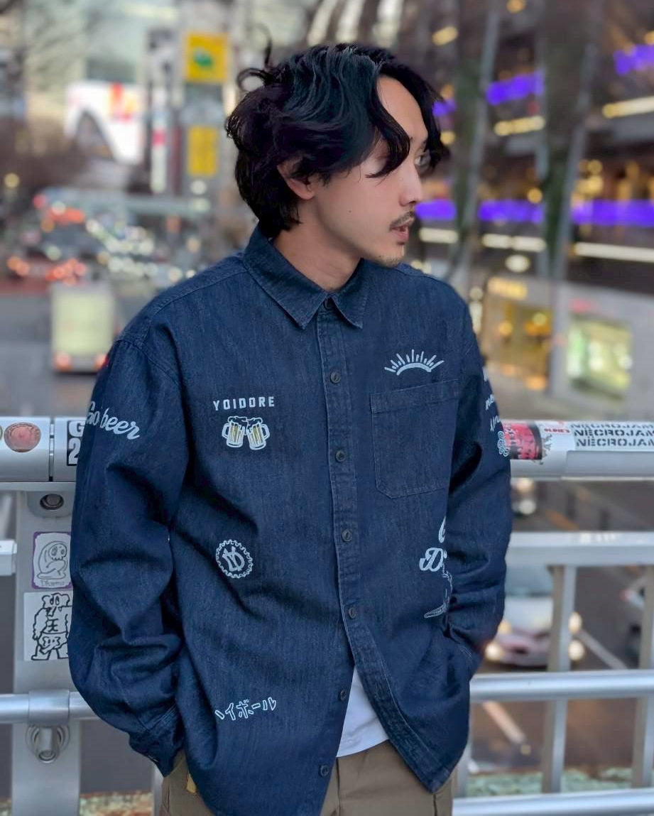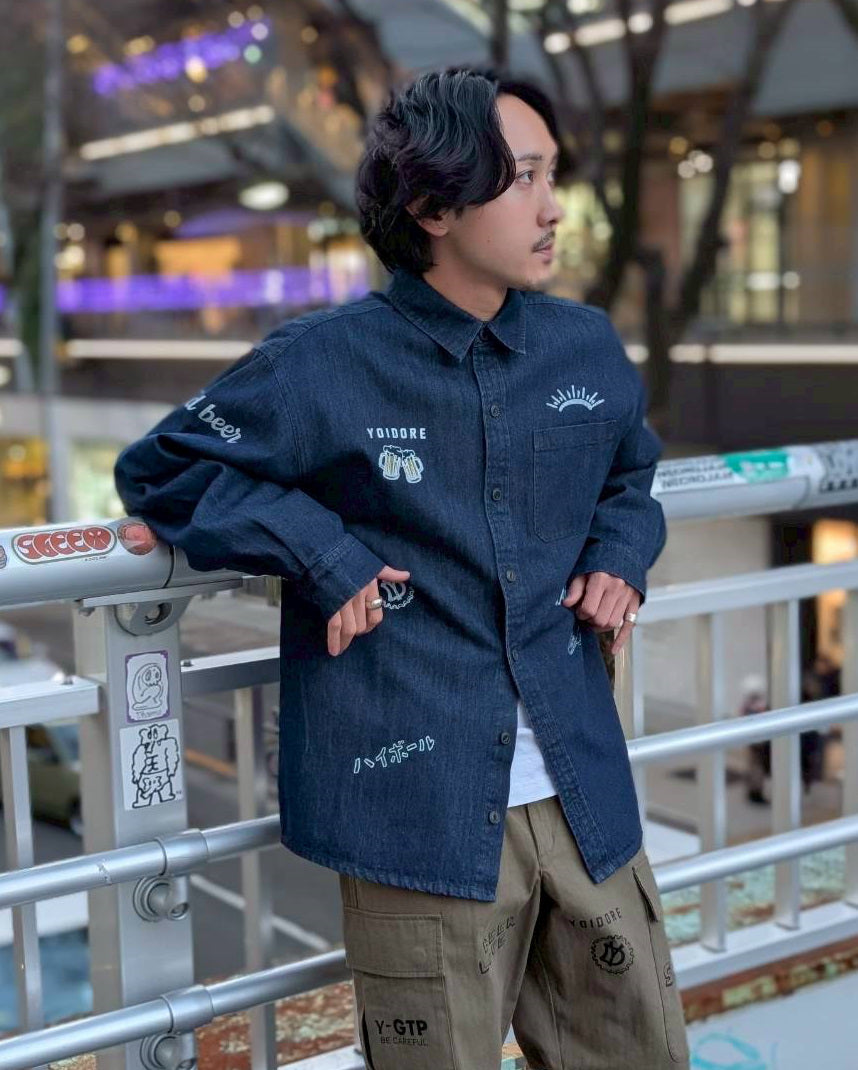手型のヴィンテージ栓抜きイラストと様々なYOIDOREワードをらくがき風に随所にちりばめたワークテイストなシャツです。