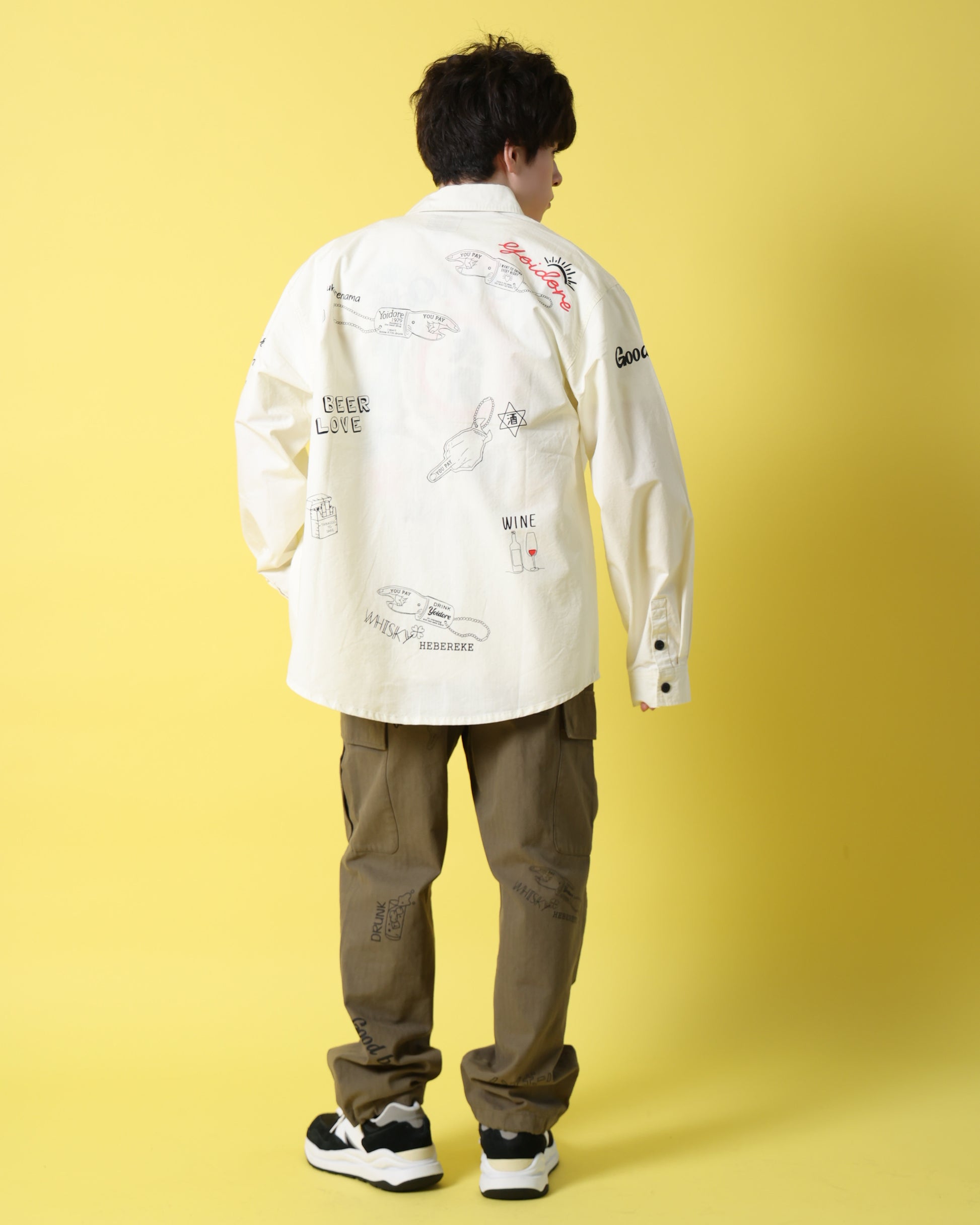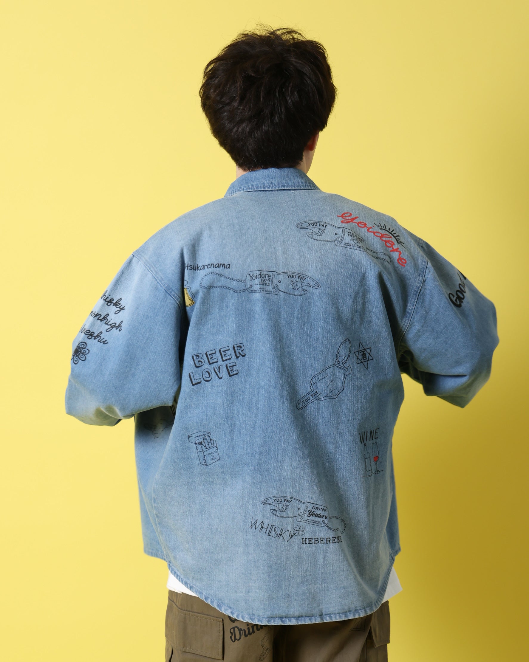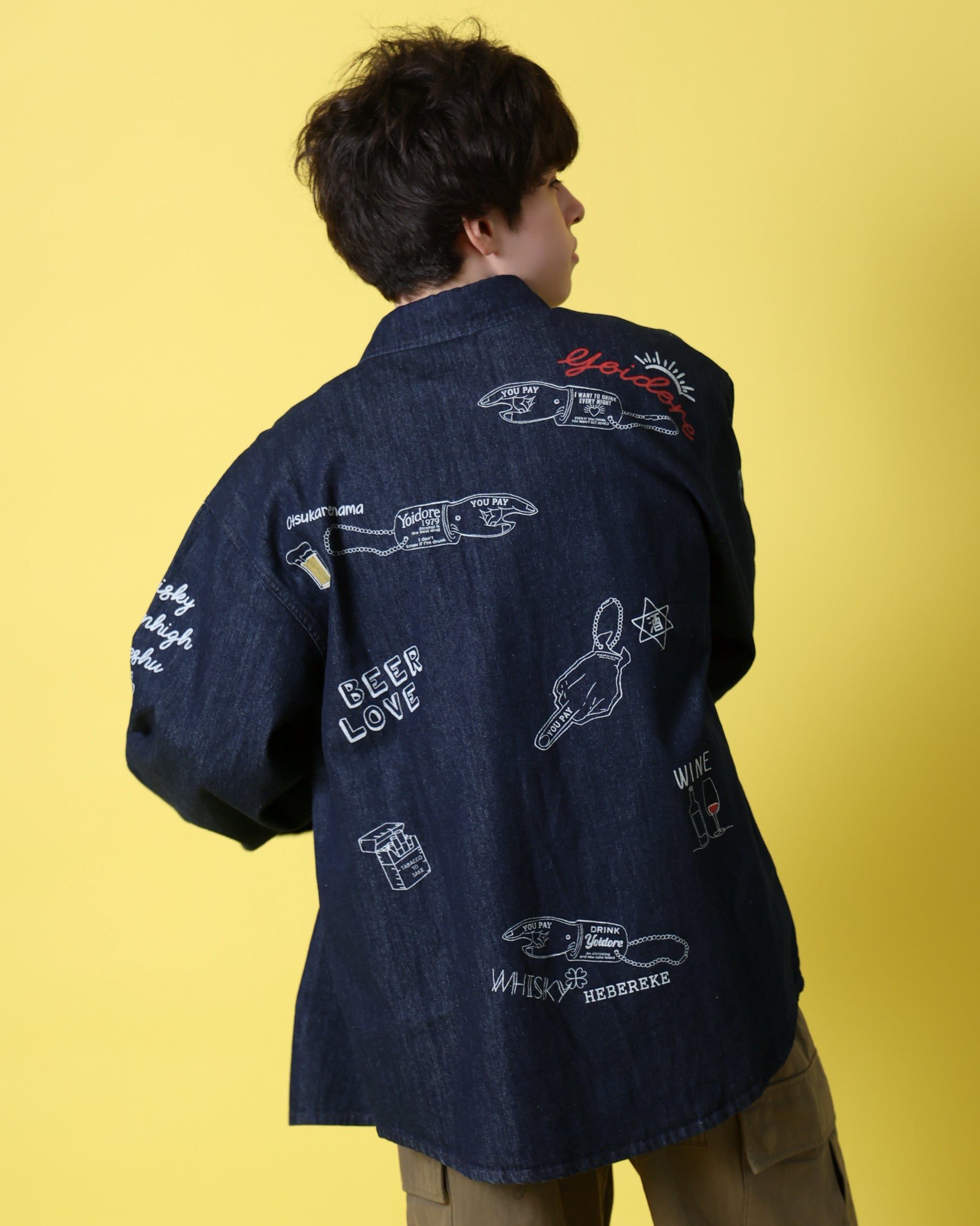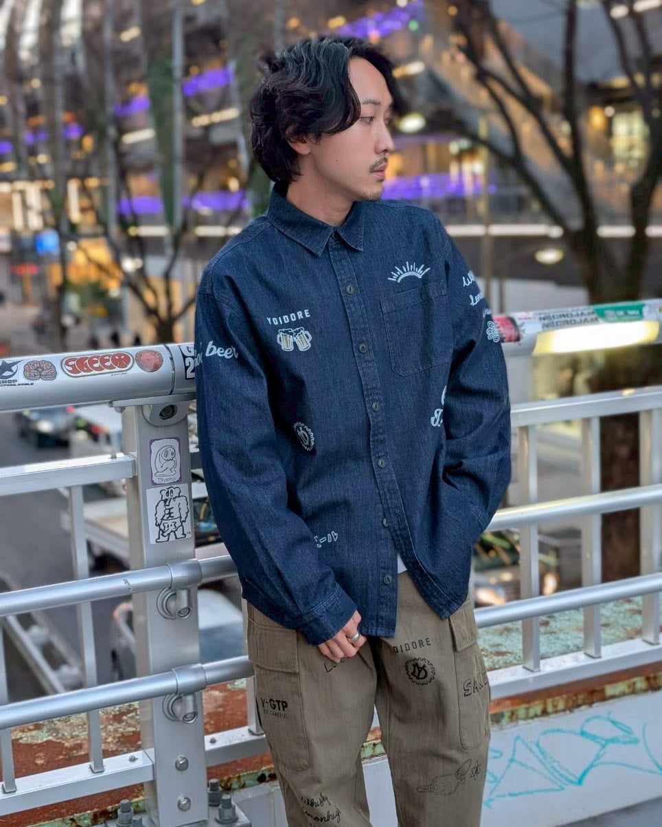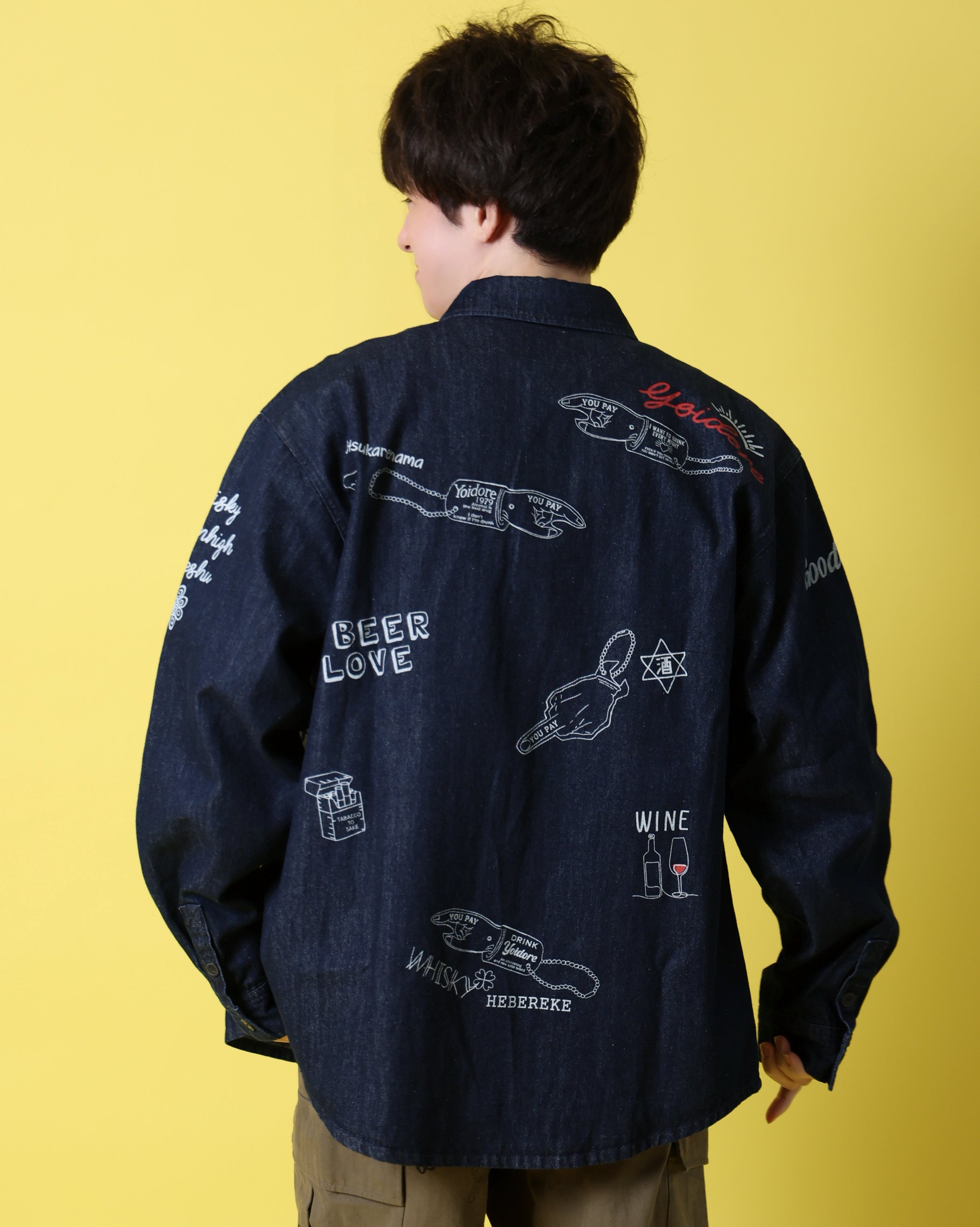 手型のヴィンテージ栓抜きイラストと様々なYOIDOREワードをらくがき風に随所にちりばめたワークテイストなシャツです。