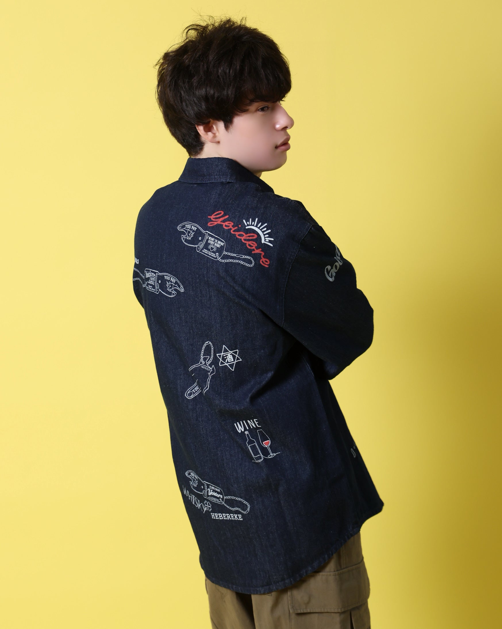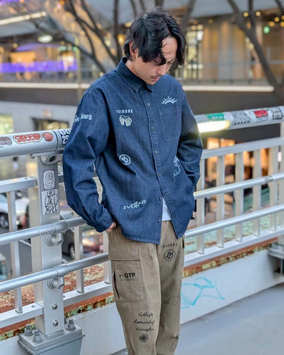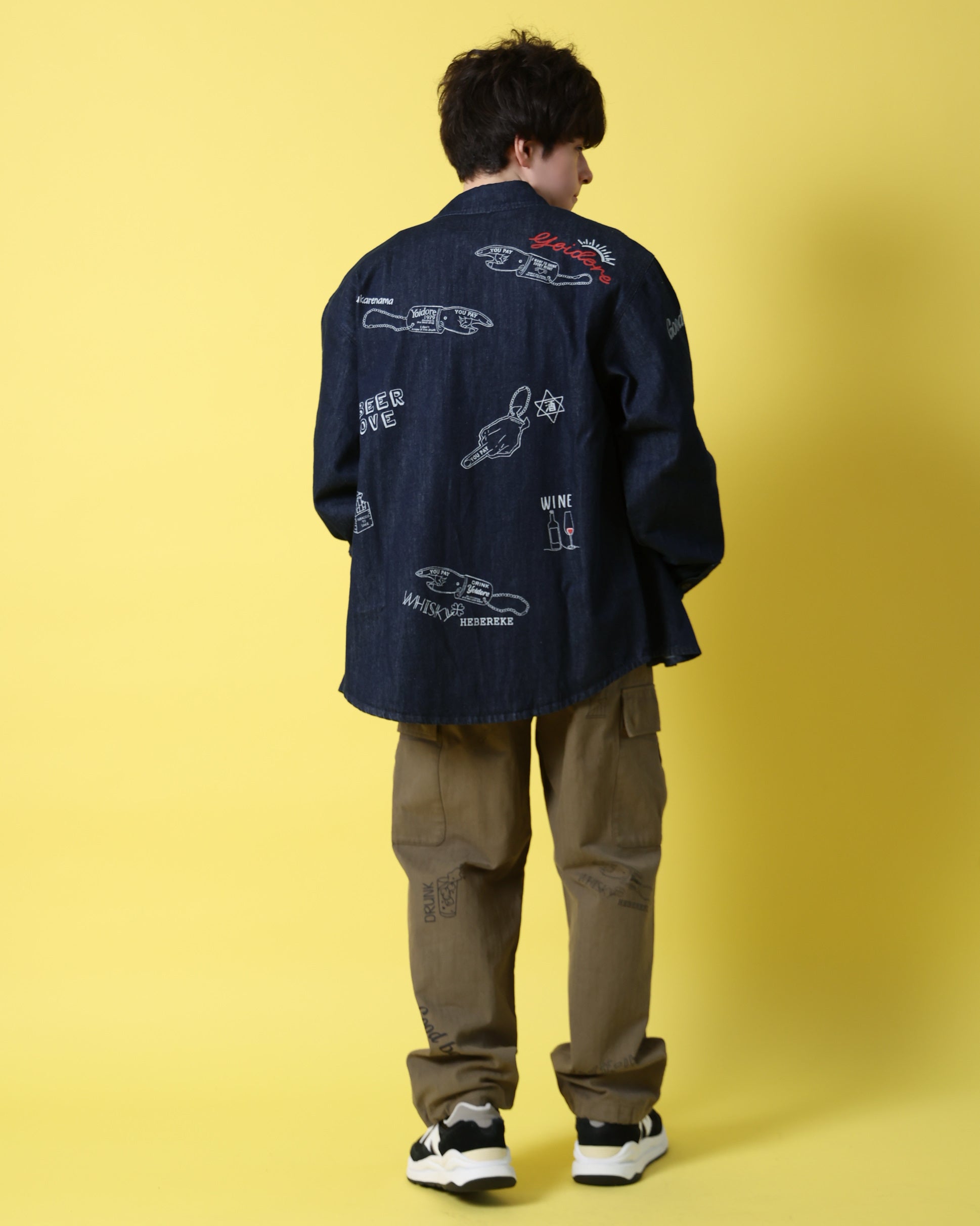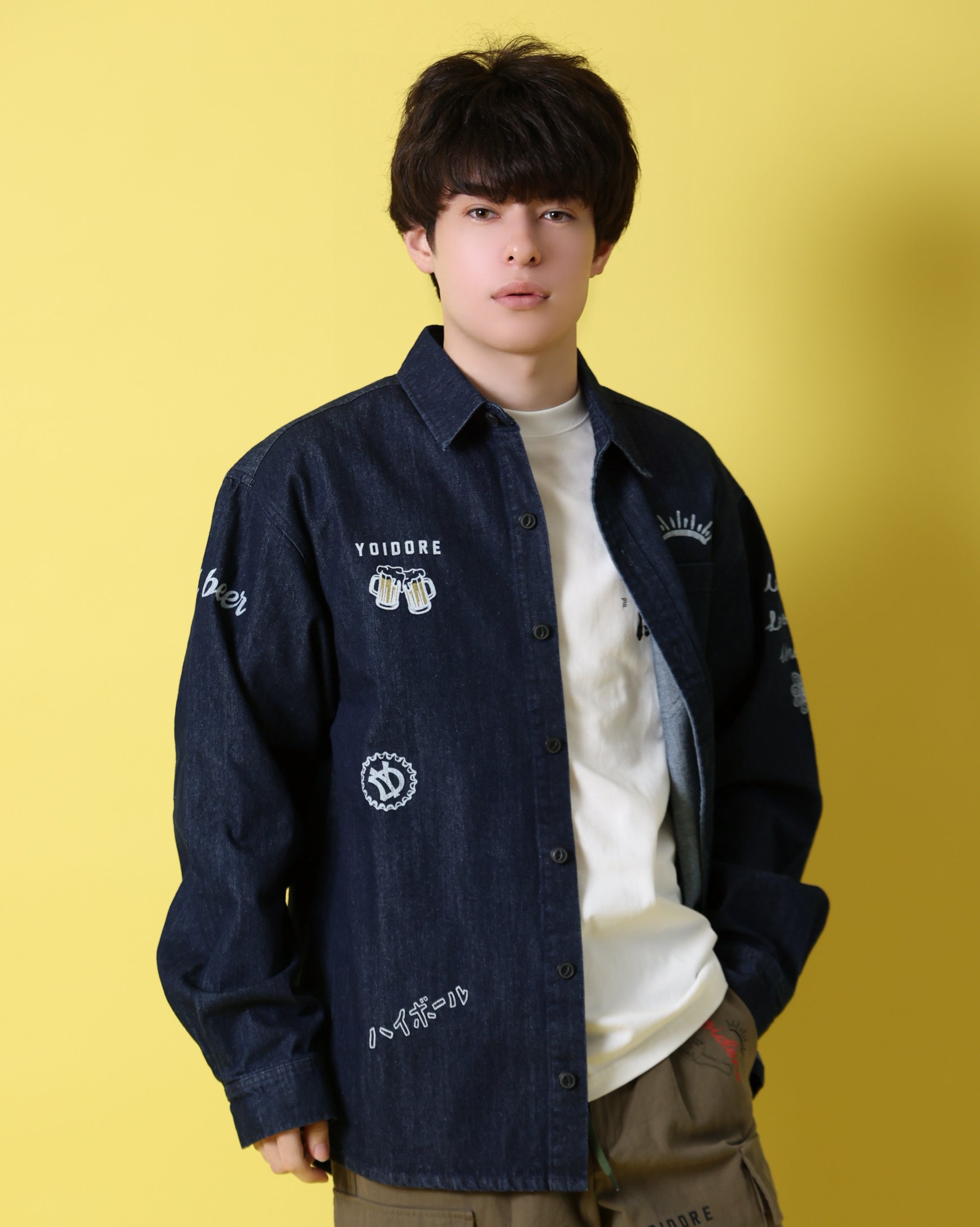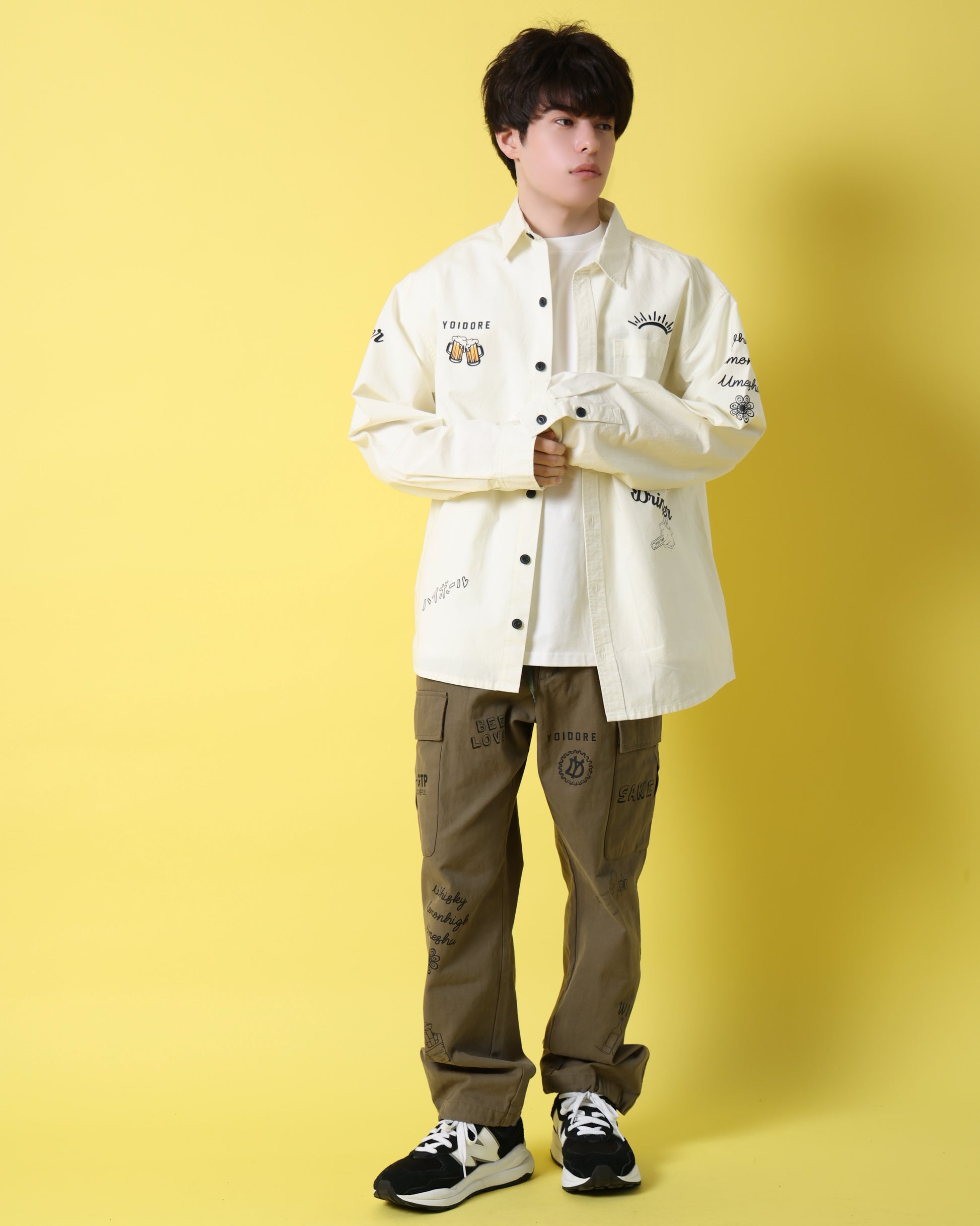 手型のヴィンテージ栓抜きイラストと様々なYOIDOREワードをらくがき風に随所にちりばめたワークテイストなシャツです。