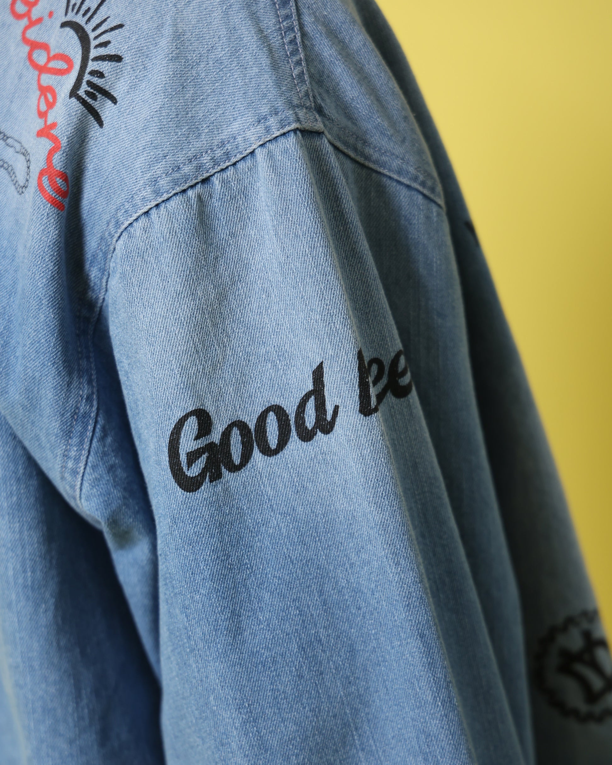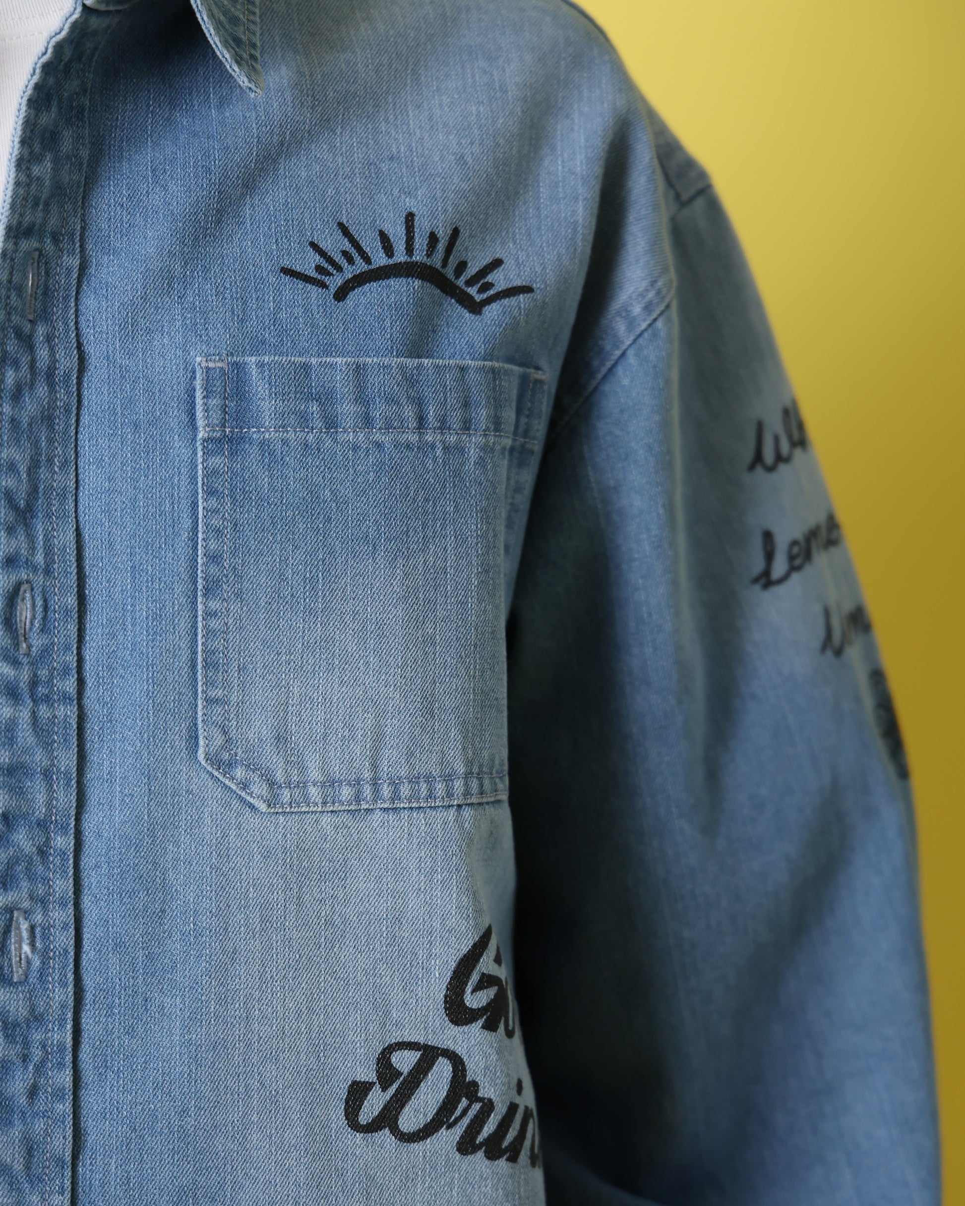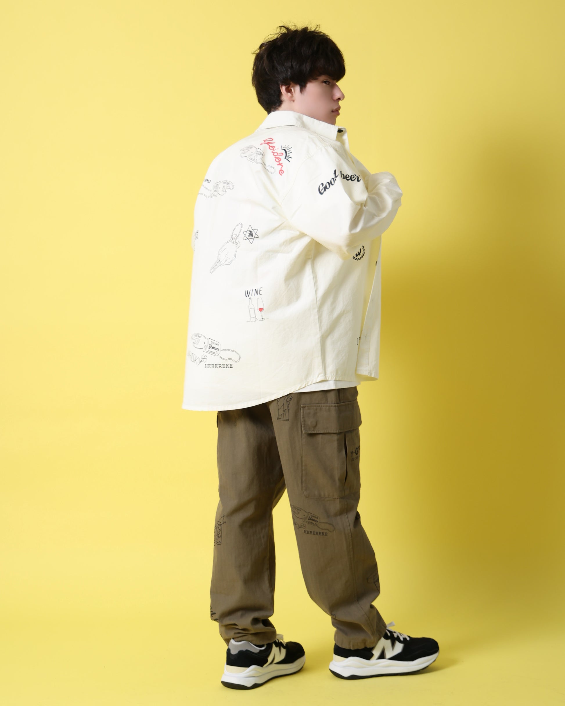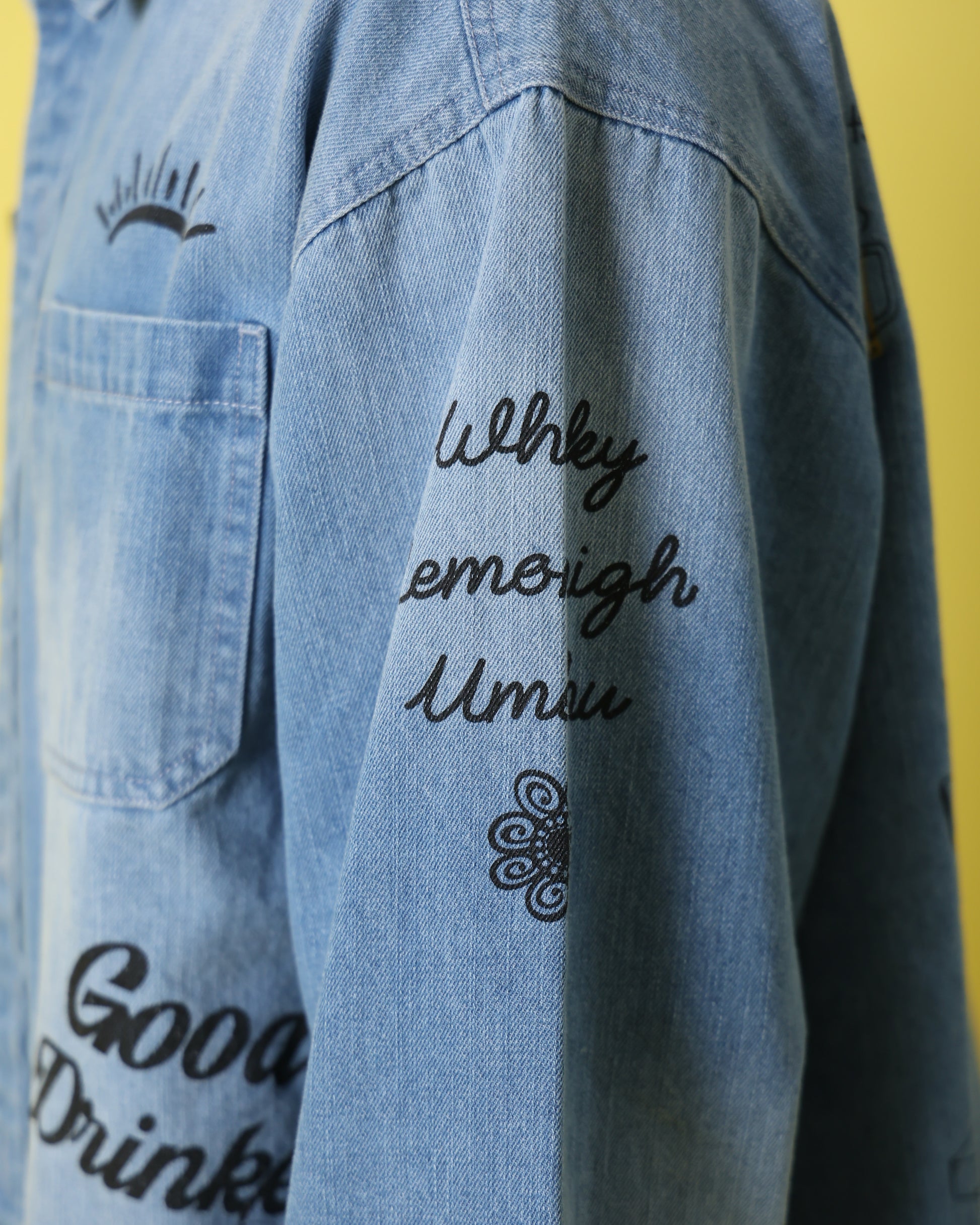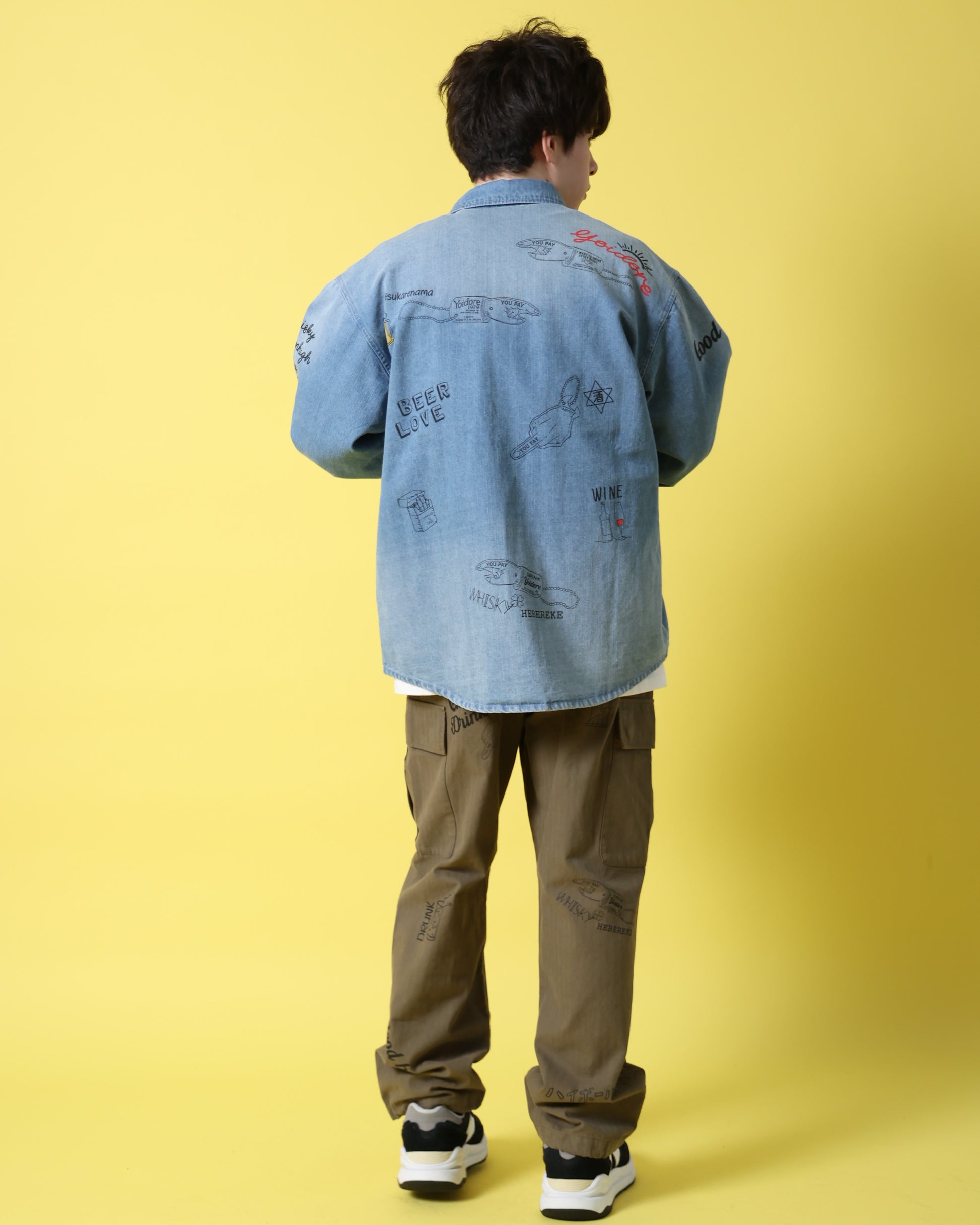 手型のヴィンテージ栓抜きイラストと様々なYOIDOREワードをらくがき風に随所にちりばめたワークテイストなシャツです。