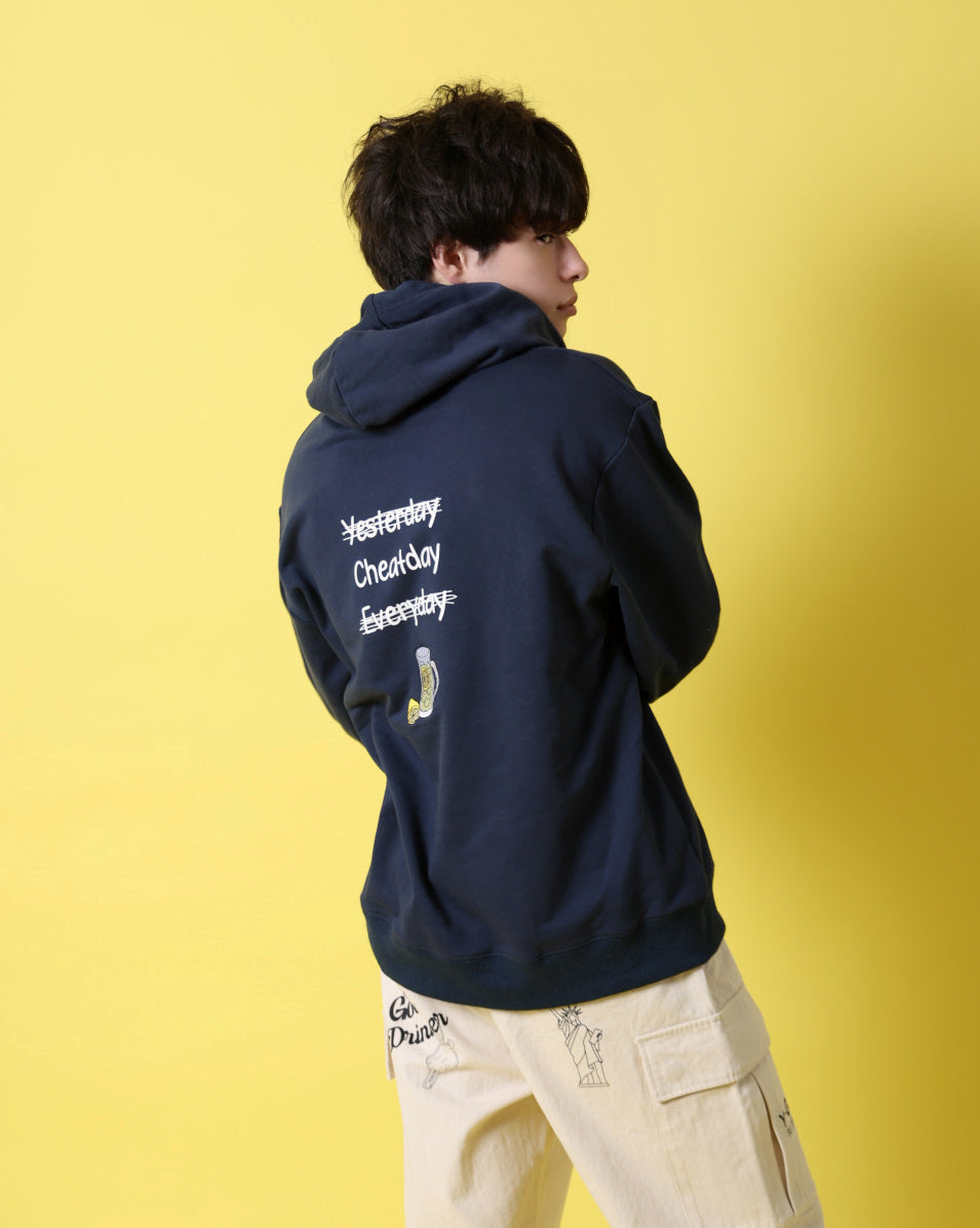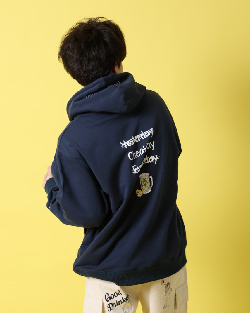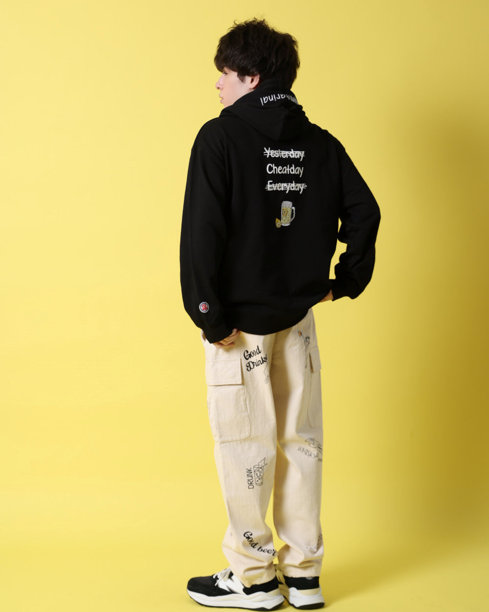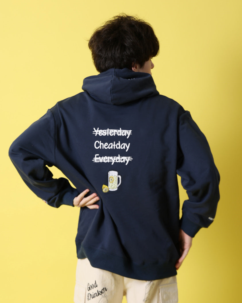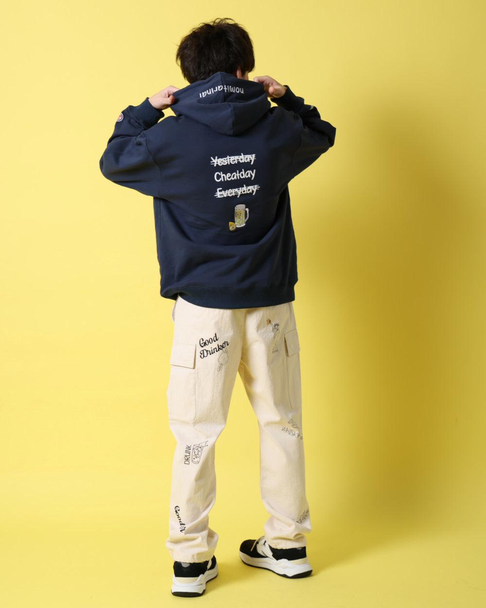 フードには「呑み足りない」ロゴ刺繍、袖にも「ごほうび」ロゴプリントを配置し、さりげないアピールにも余念なし!