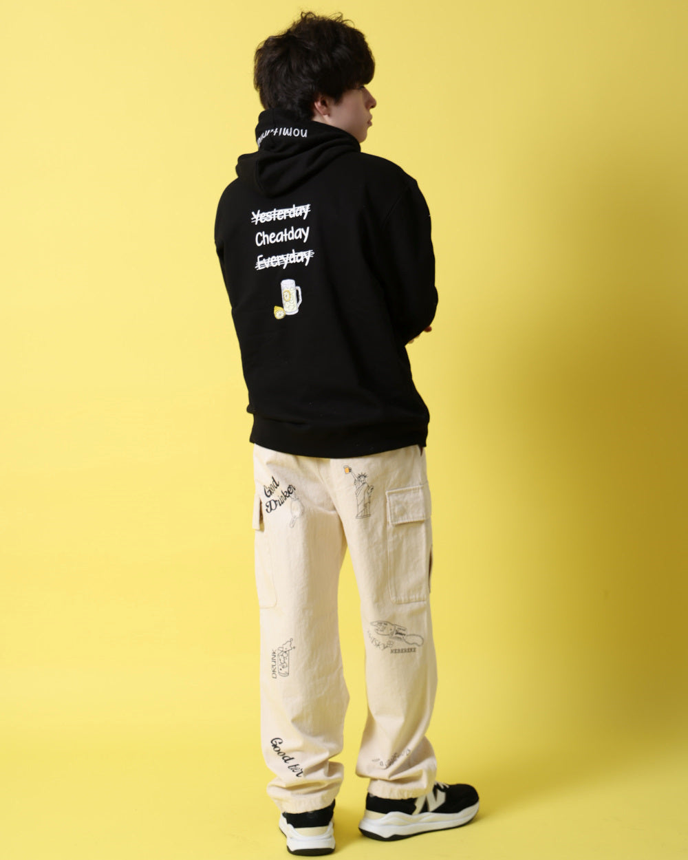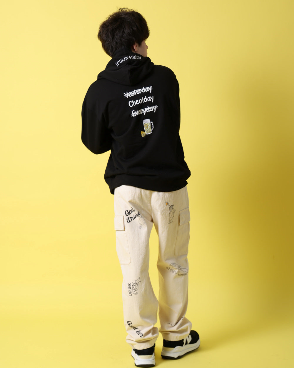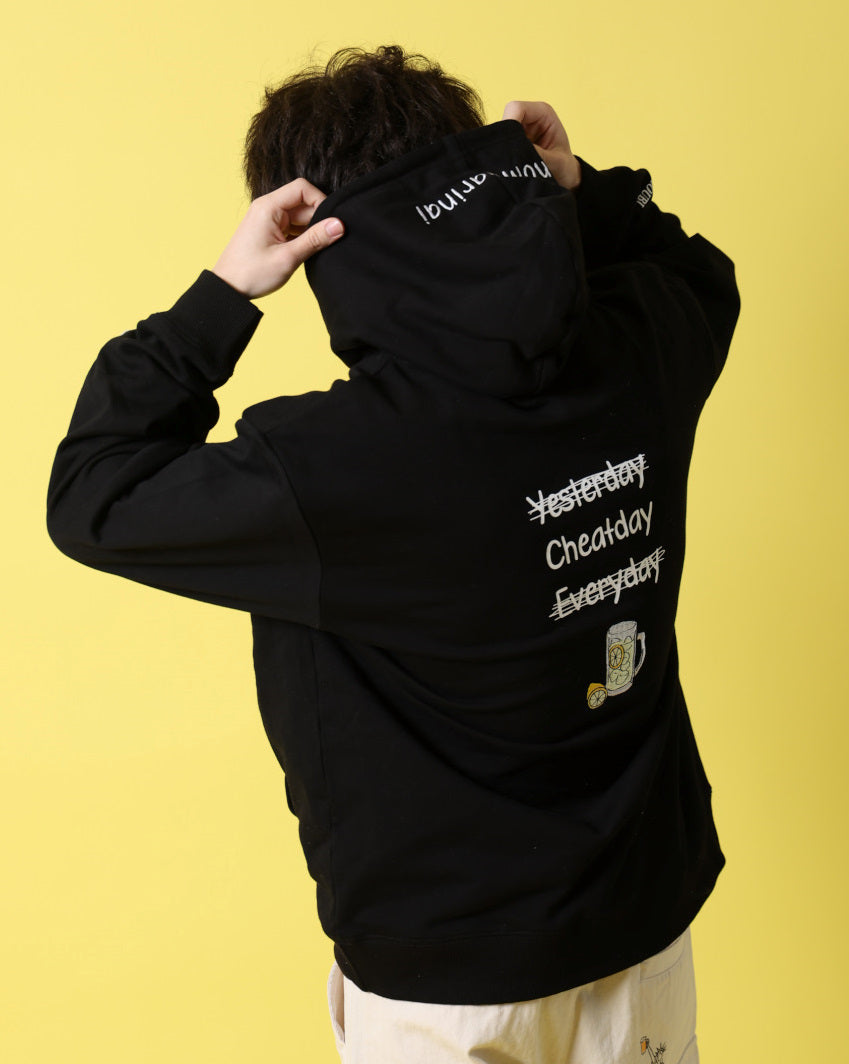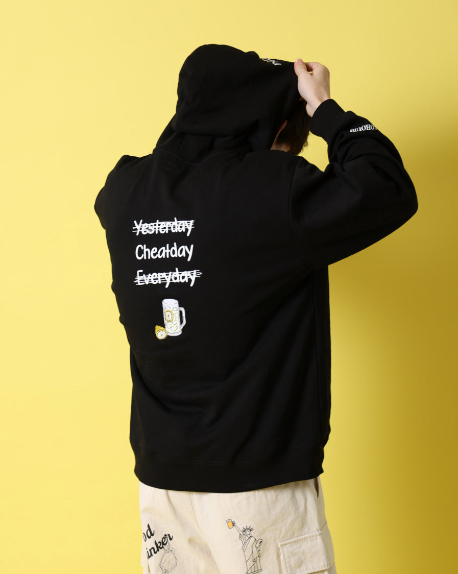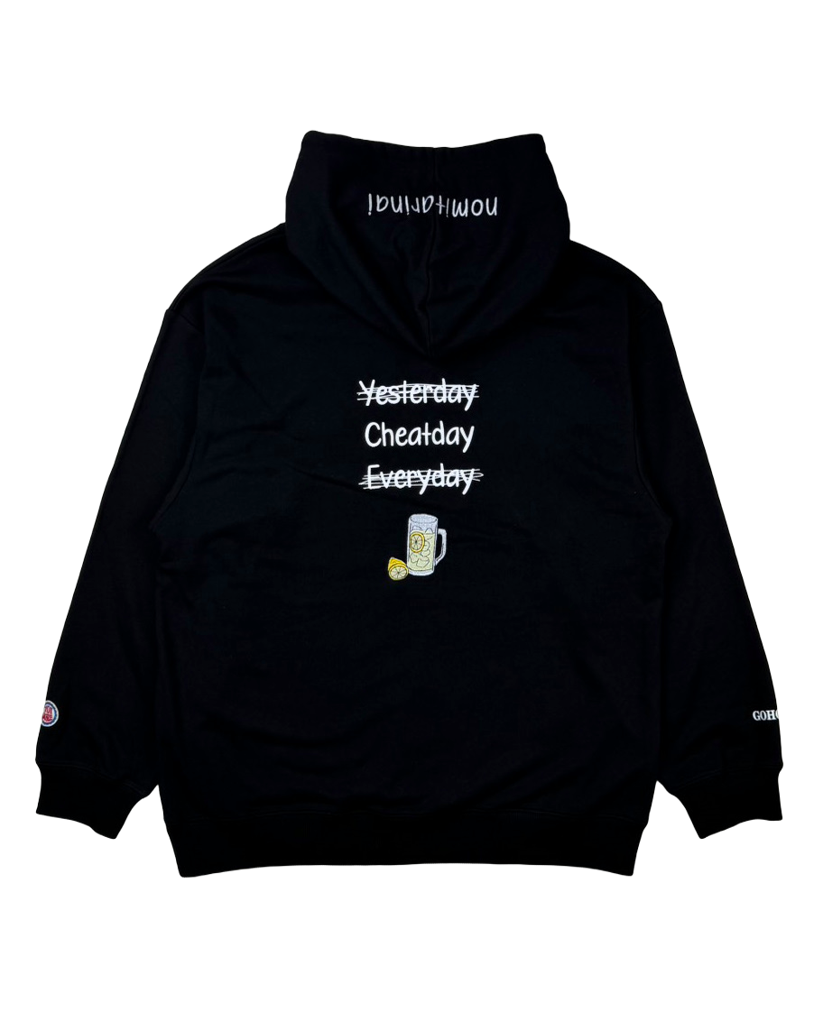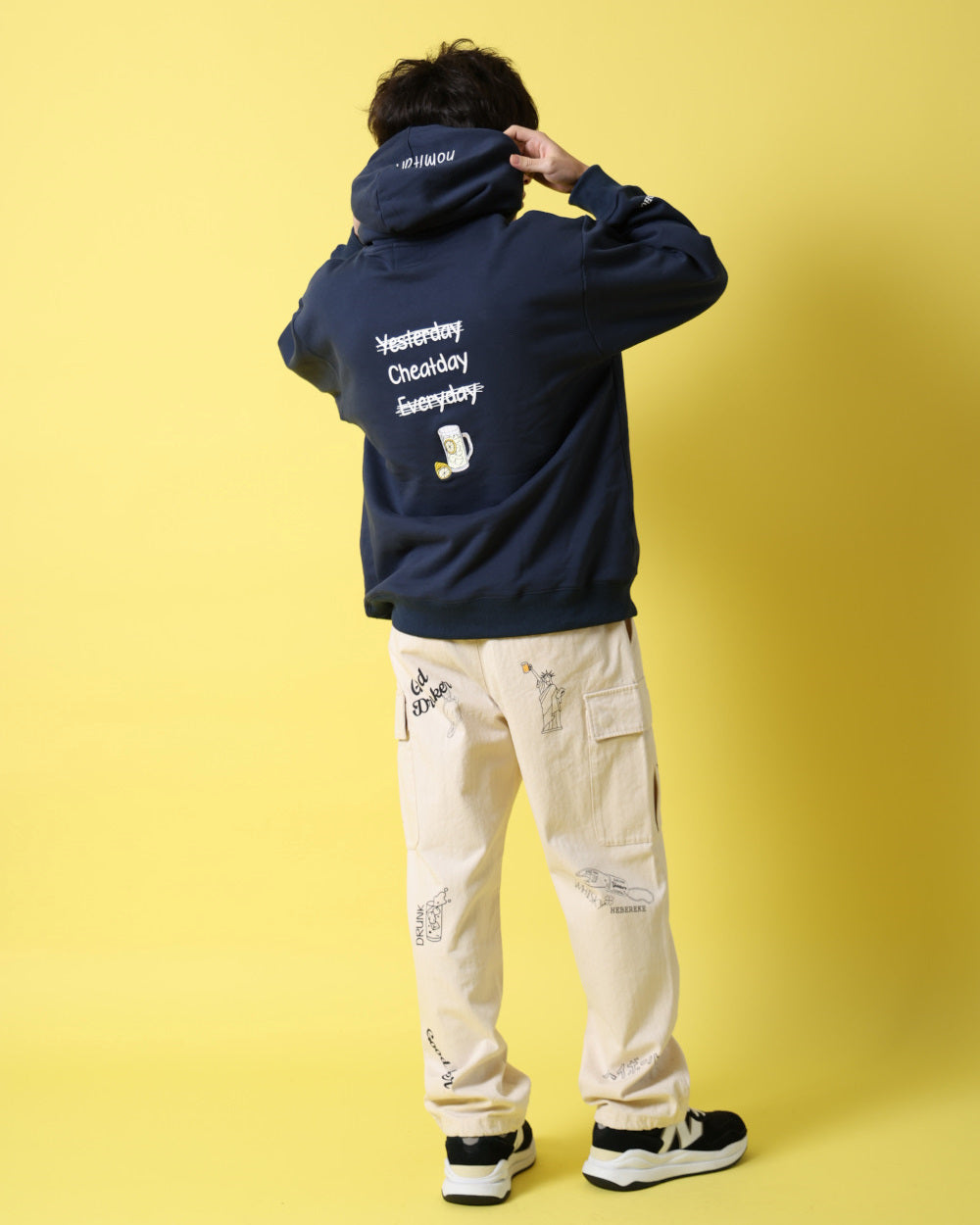 フードには「呑み足りない」ロゴ刺繍、袖にも「ごほうび」ロゴプリントを配置し、さりげないアピールにも余念なし!