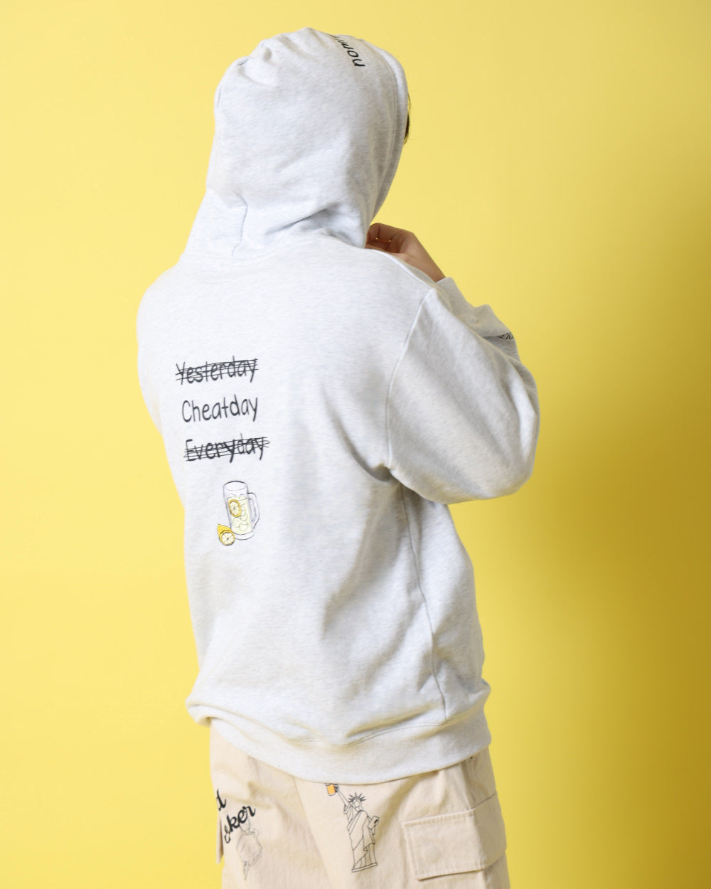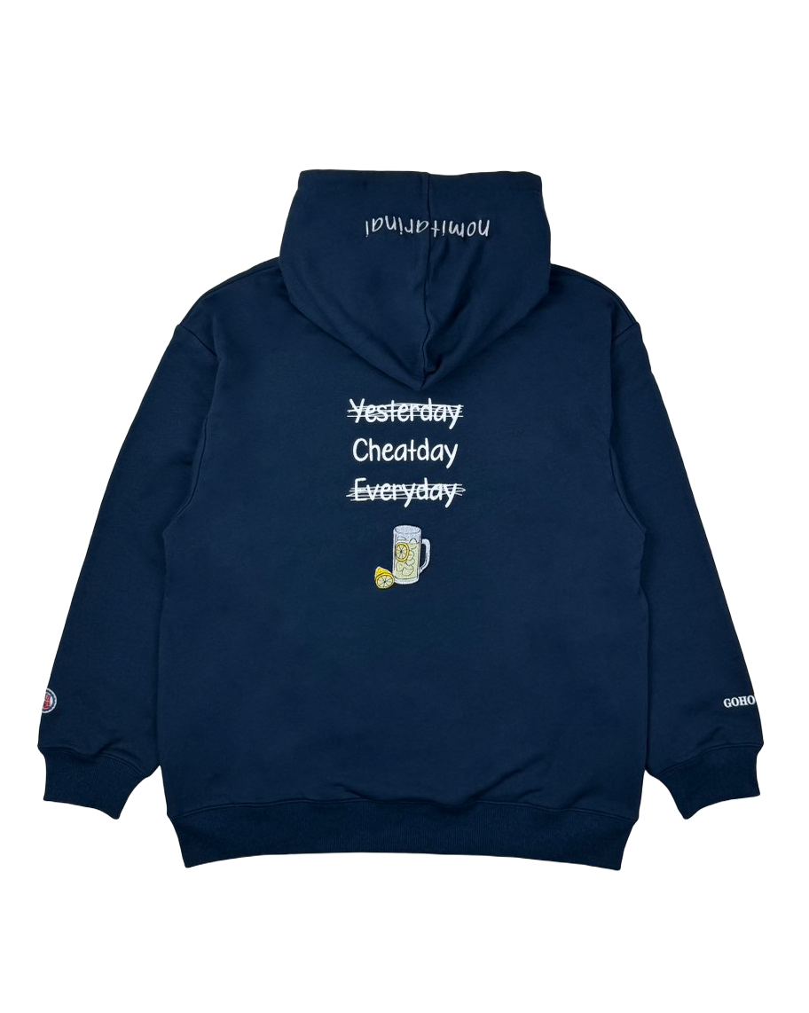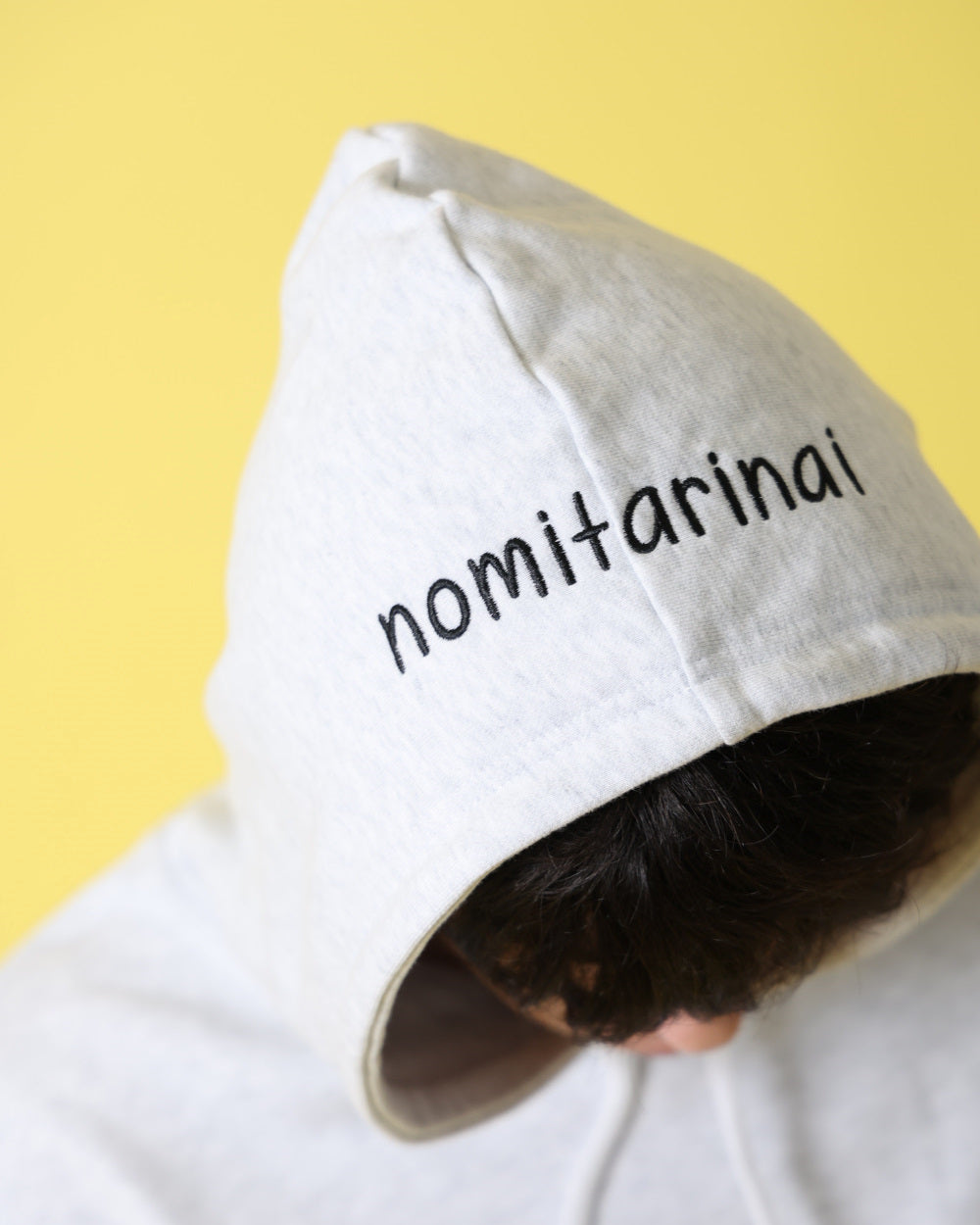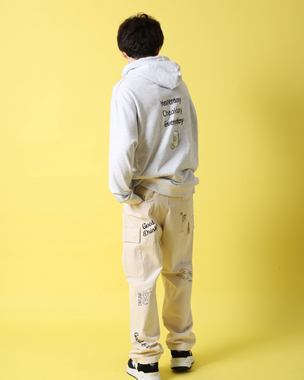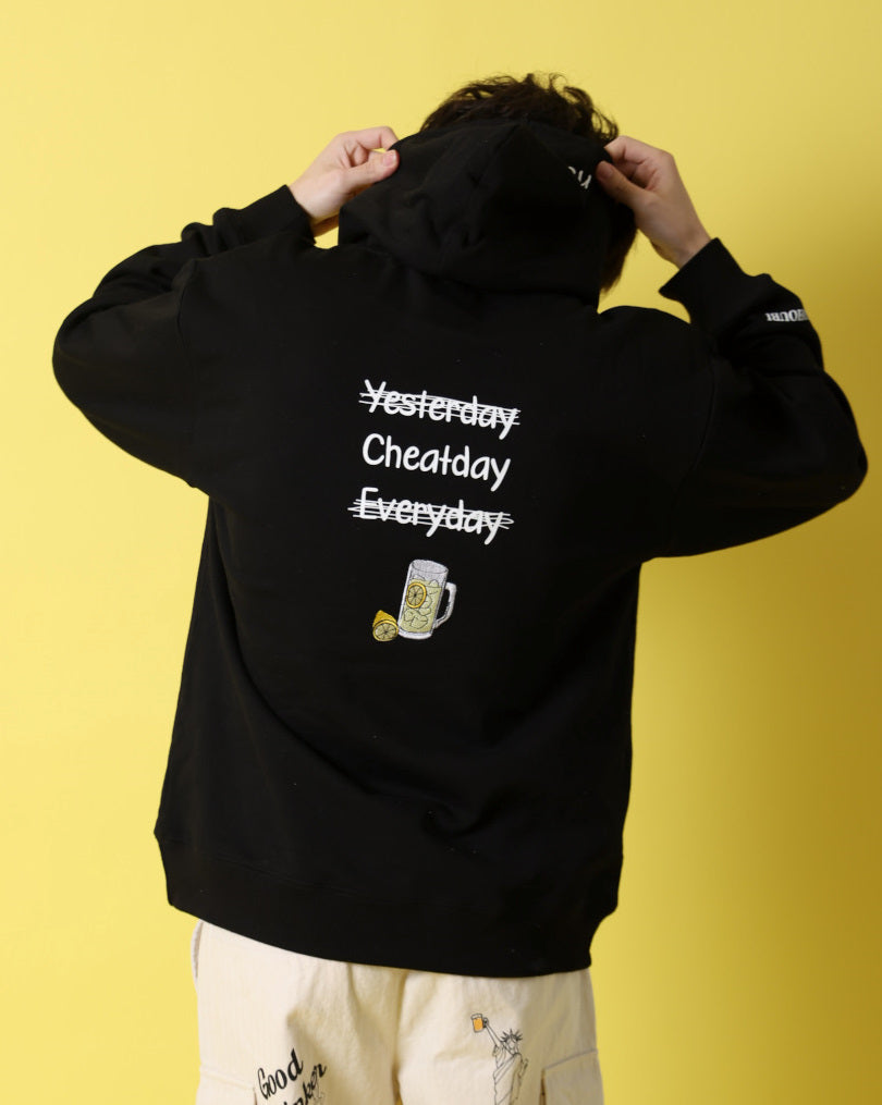 フードには「呑み足りない」ロゴ刺繍、袖にも「ごほうび」ロゴプリントを配置し、さりげないアピールにも余念なし!