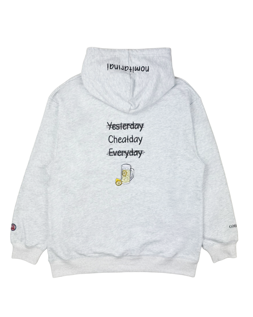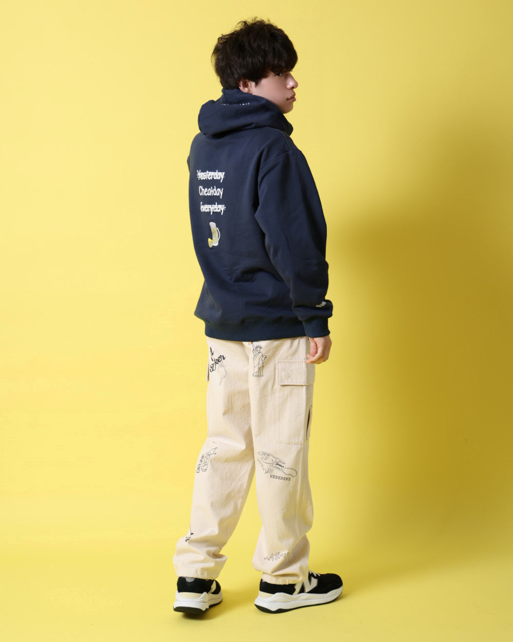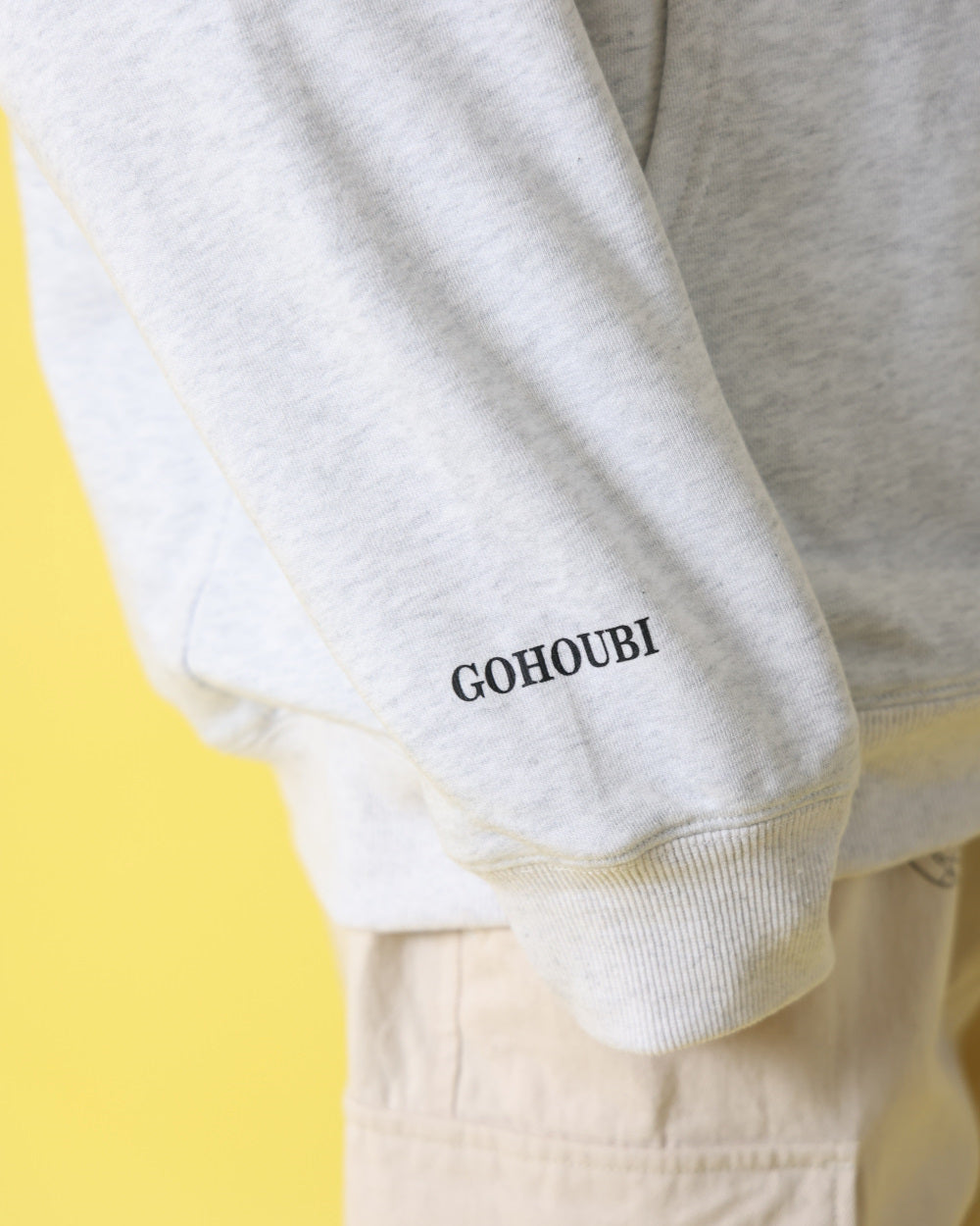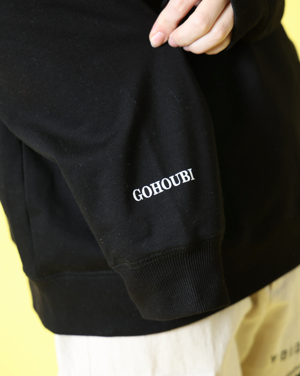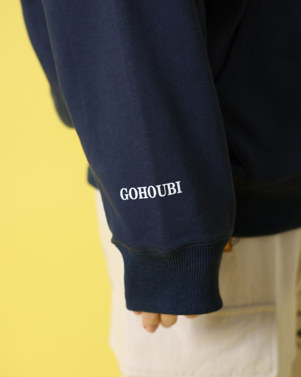 フードには「呑み足りない」ロゴ刺繍、袖にも「ごほうび」ロゴプリントを配置し、さりげないアピールにも余念なし!
