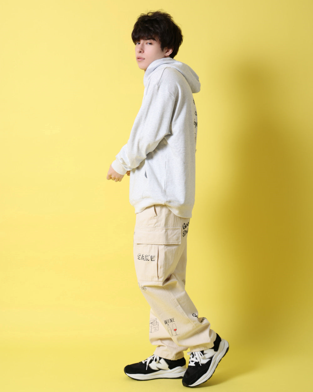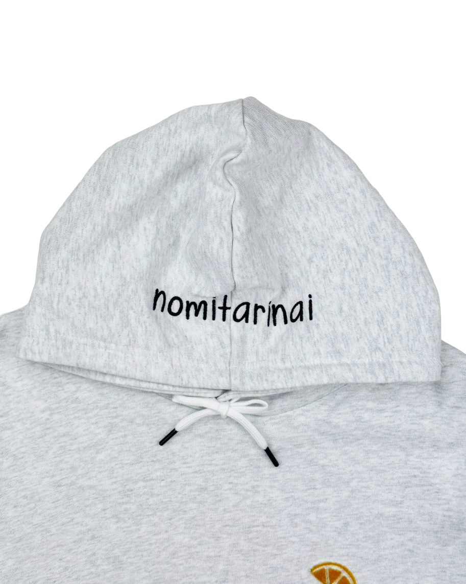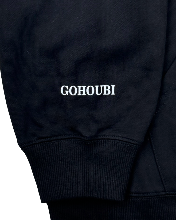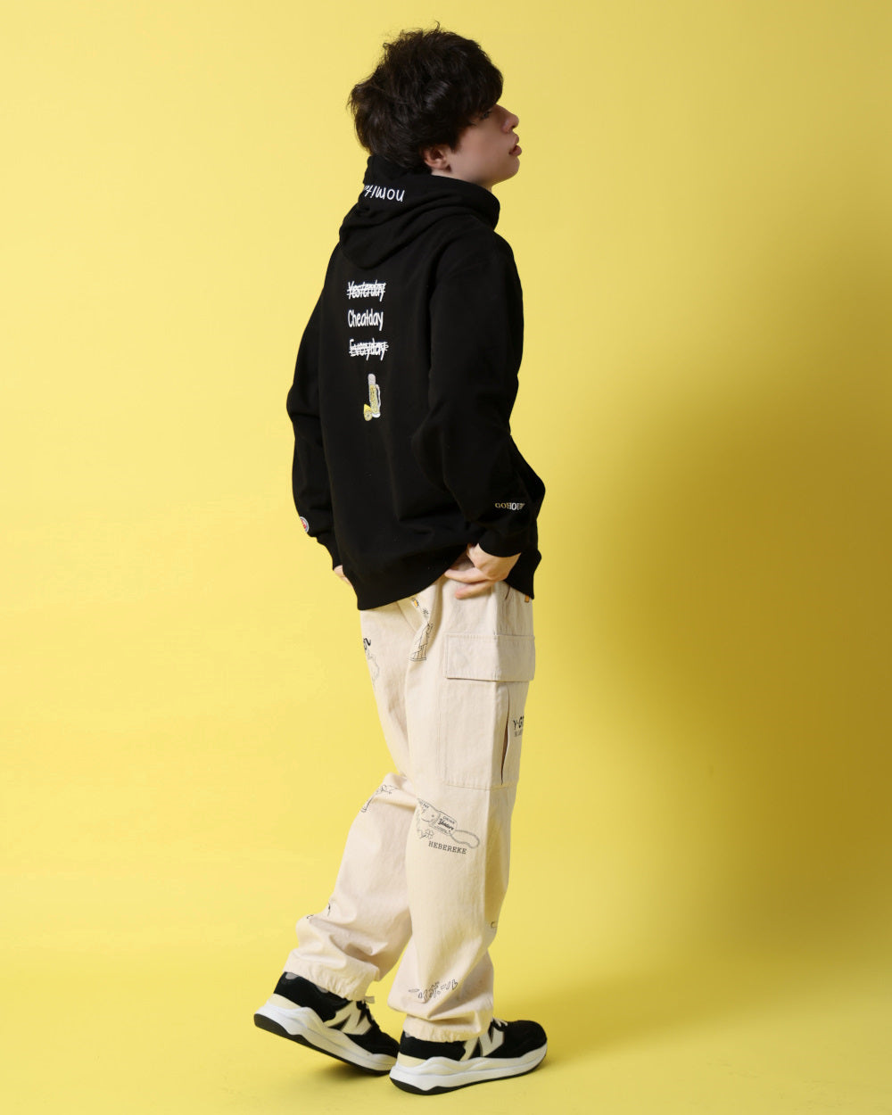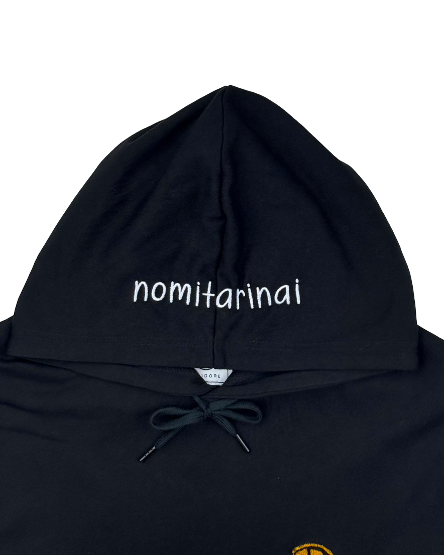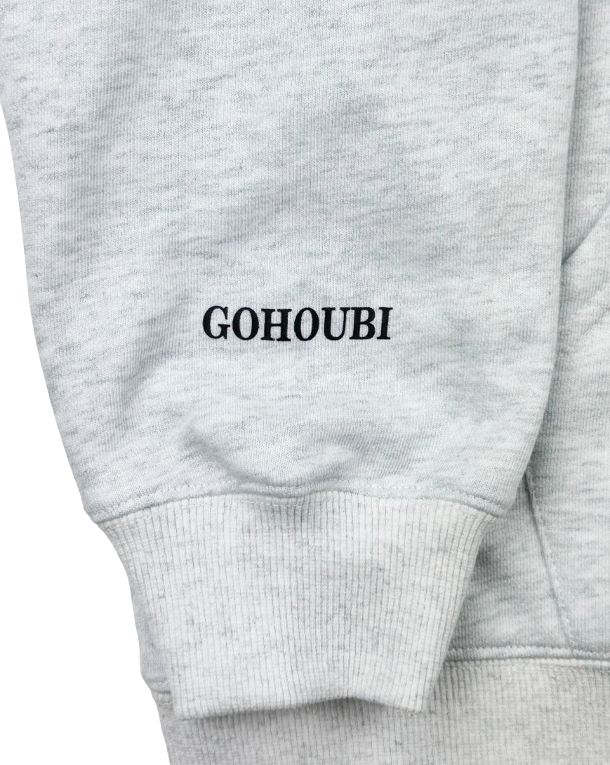 フードには「呑み足りない」ロゴ刺繍、袖にも「ごほうび」ロゴプリントを配置し、さりげないアピールにも余念なし!