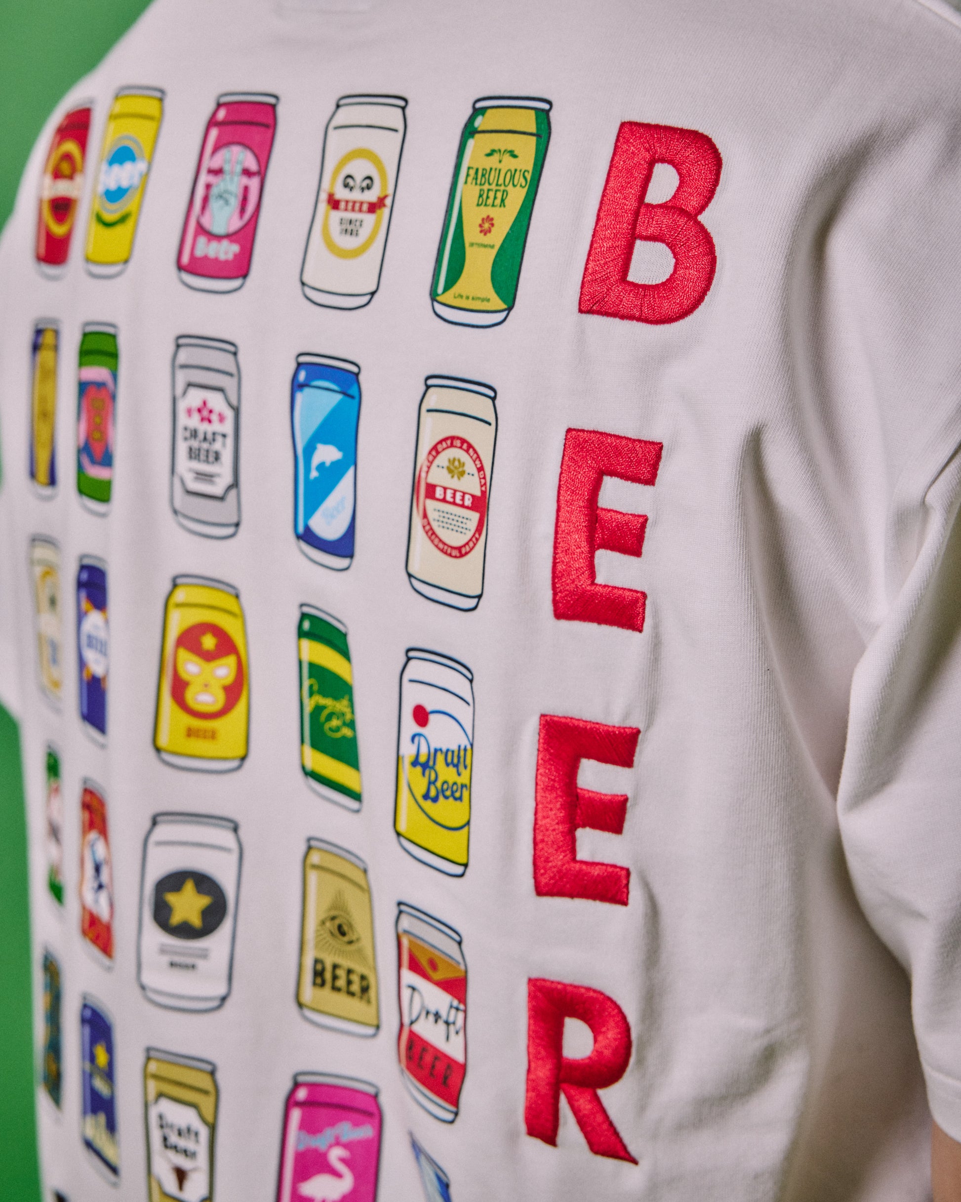 ビール缶が背中いっぱいズラリと並んだ圧巻のバックデザインはまさにビールパラダイス!