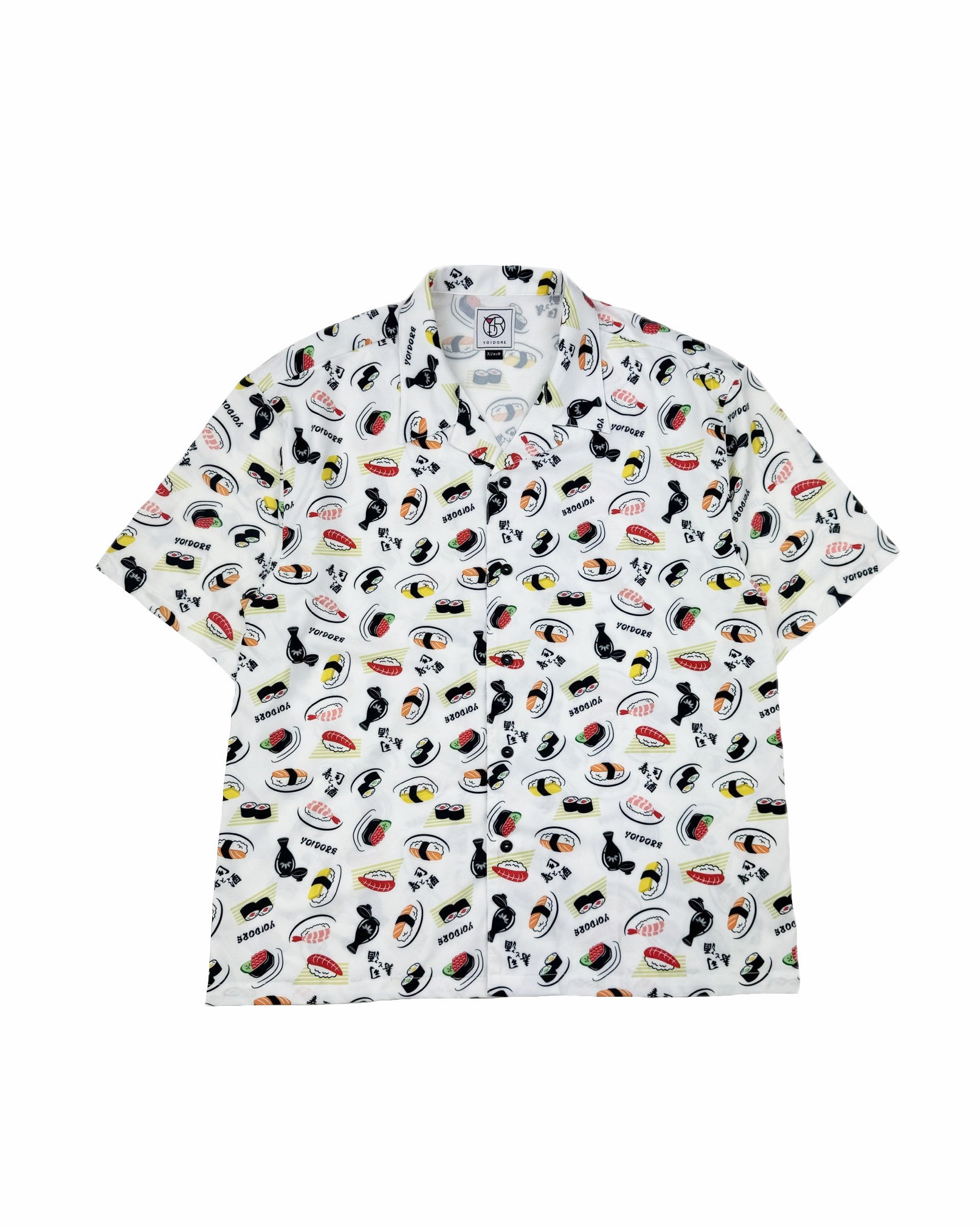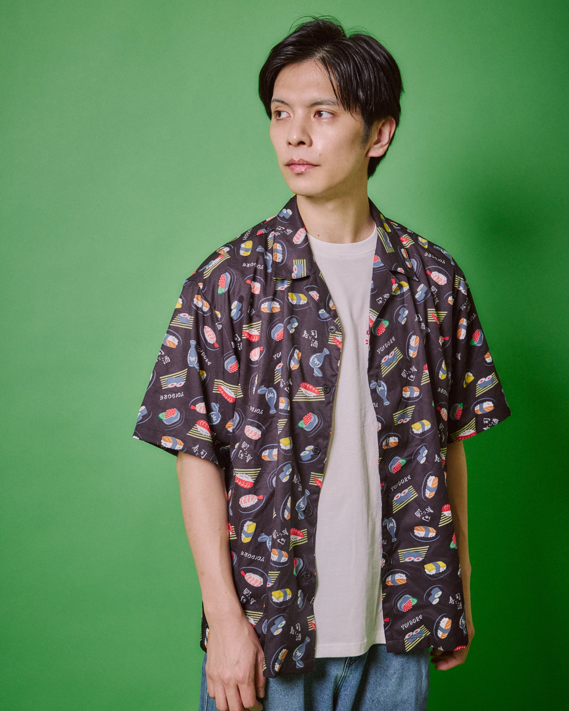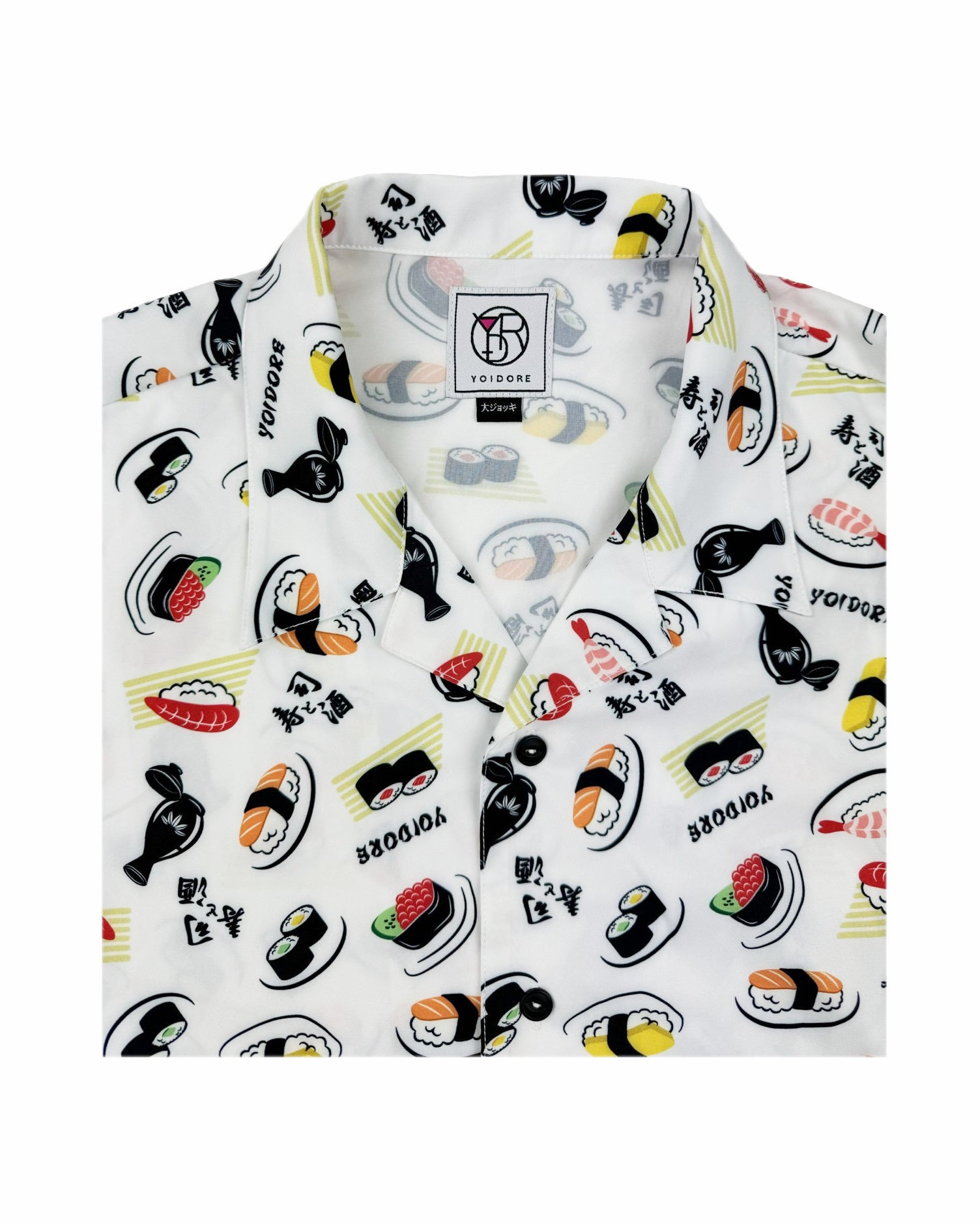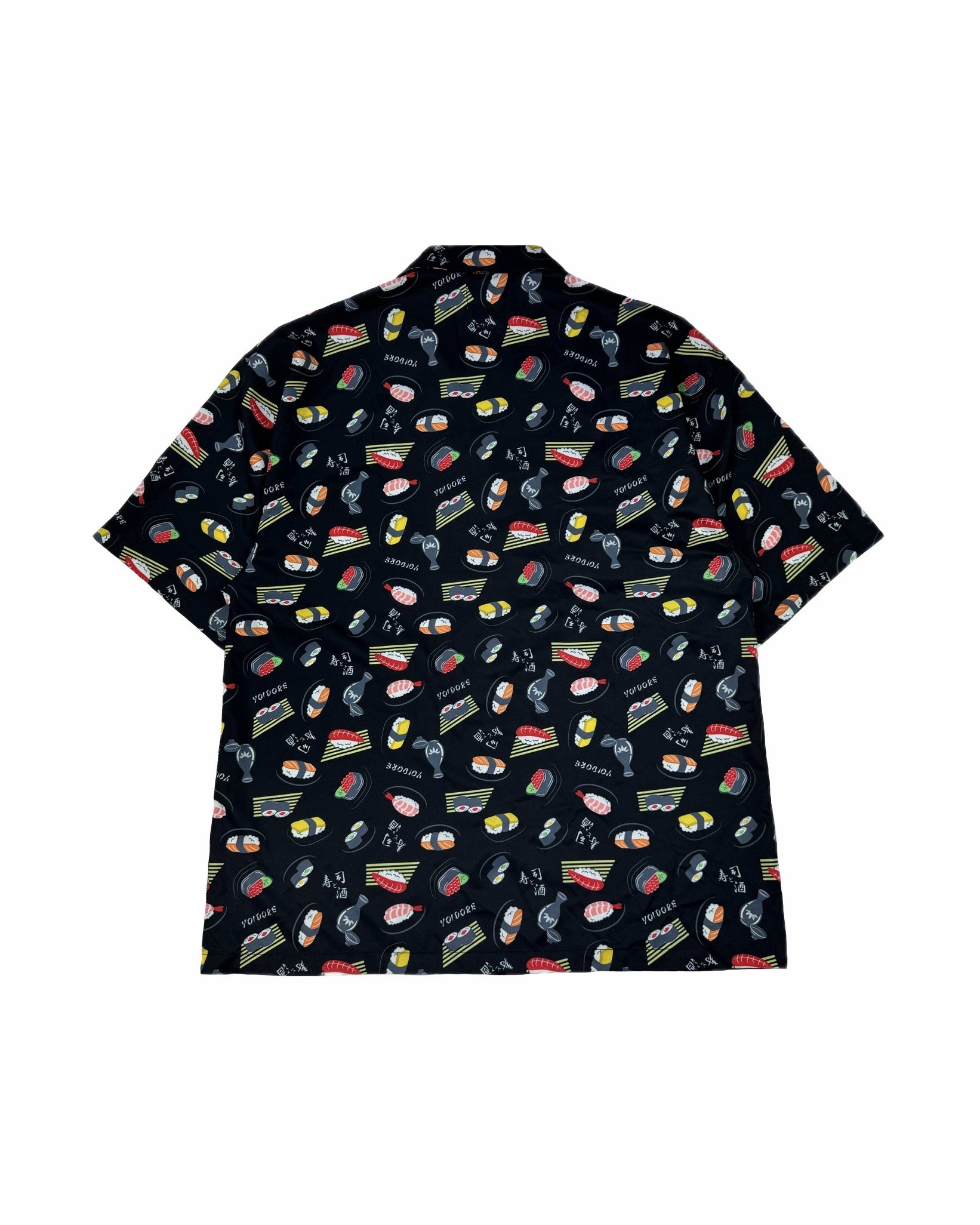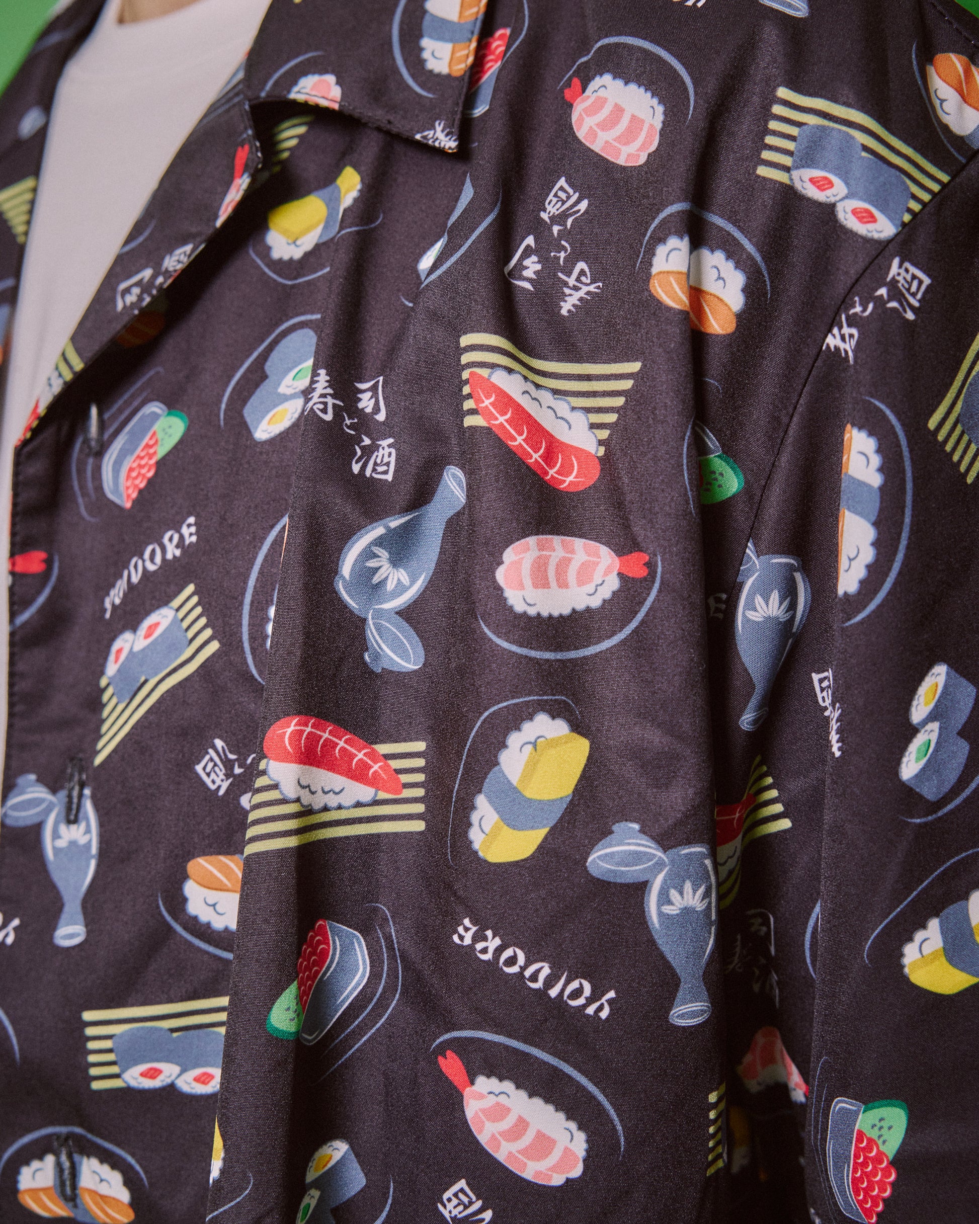 JAPAN GOOD FOODの代表格お寿司とお酒をオリジナル総柄デザインでプリントしたハイカラなオープンカラーシャツです。