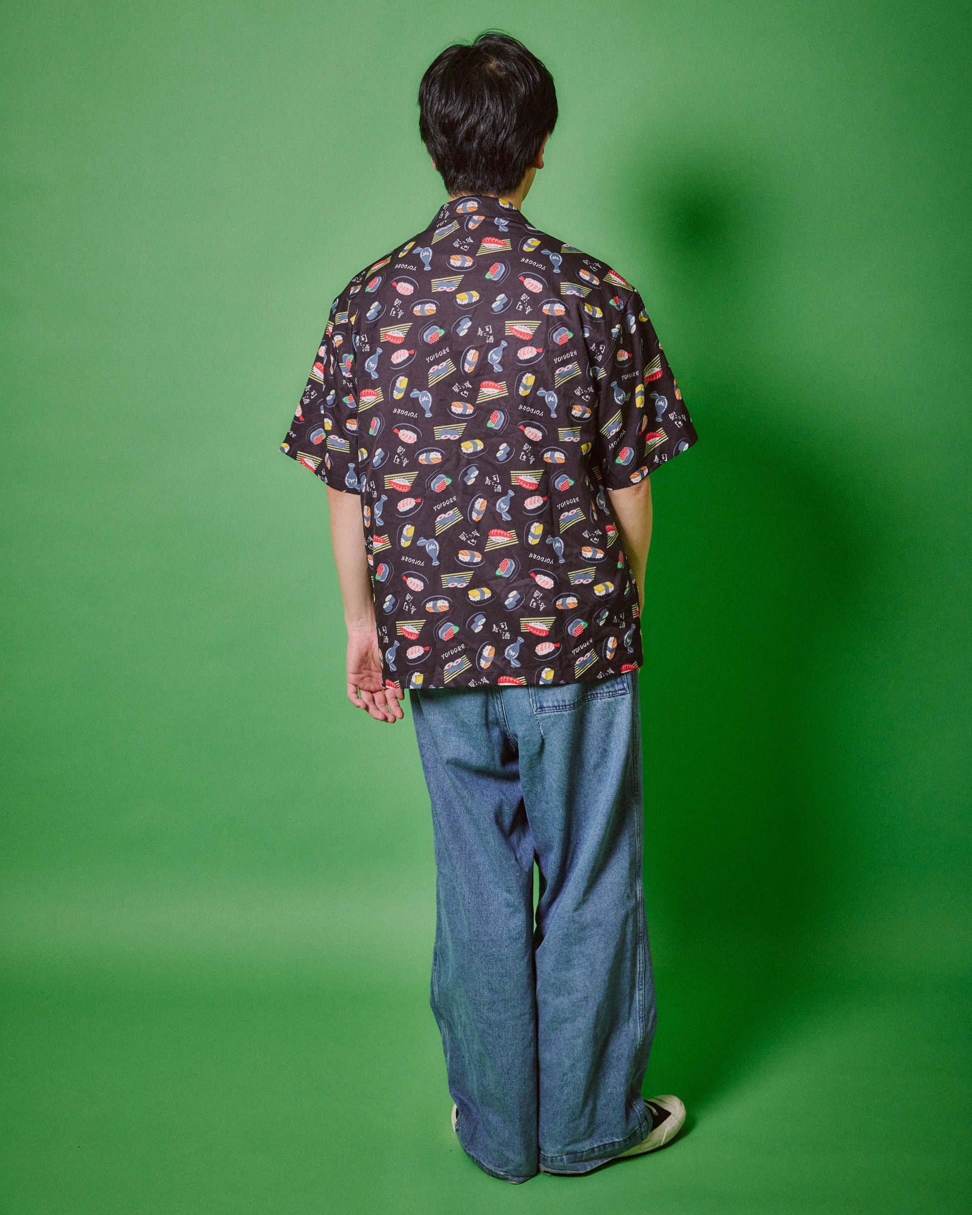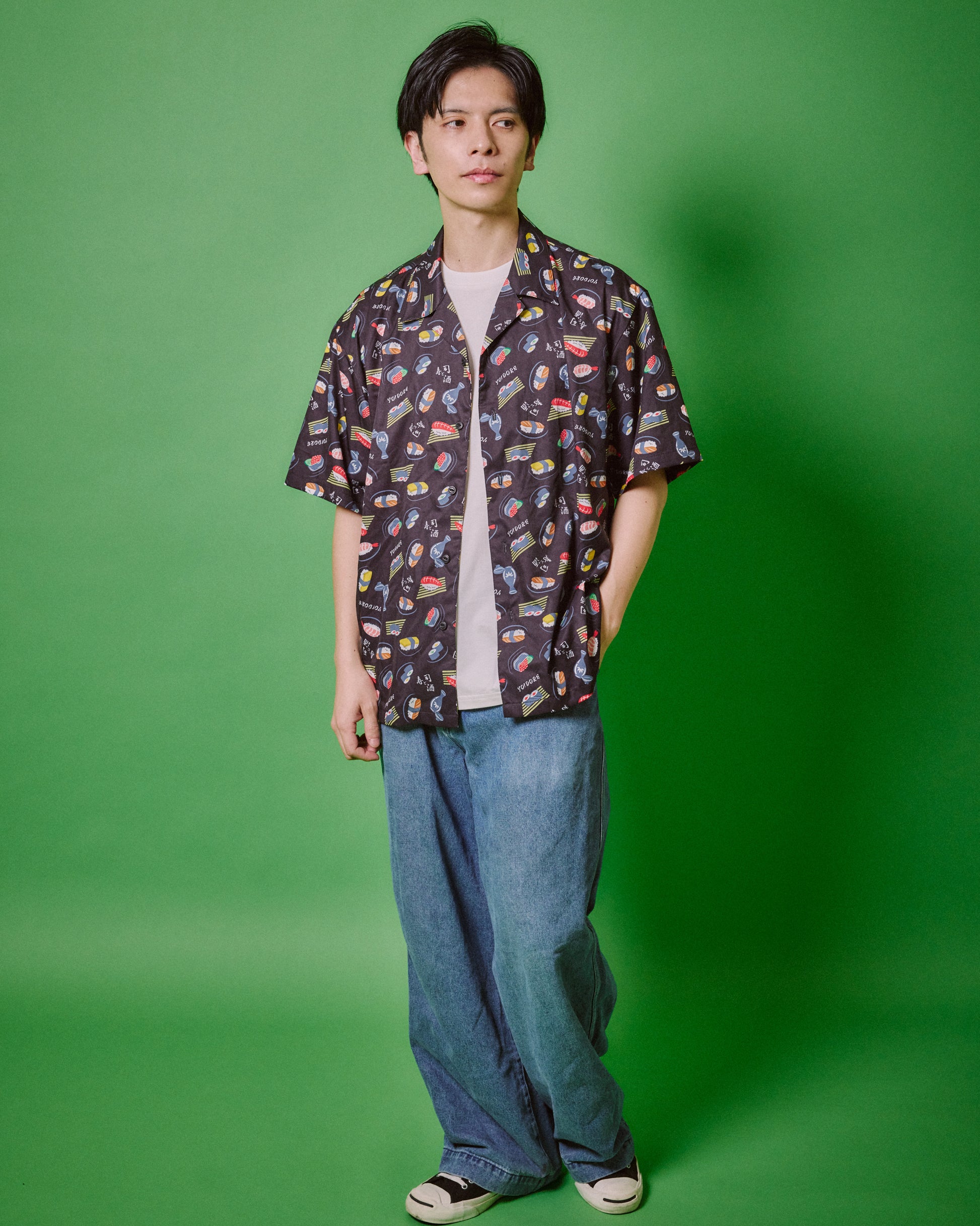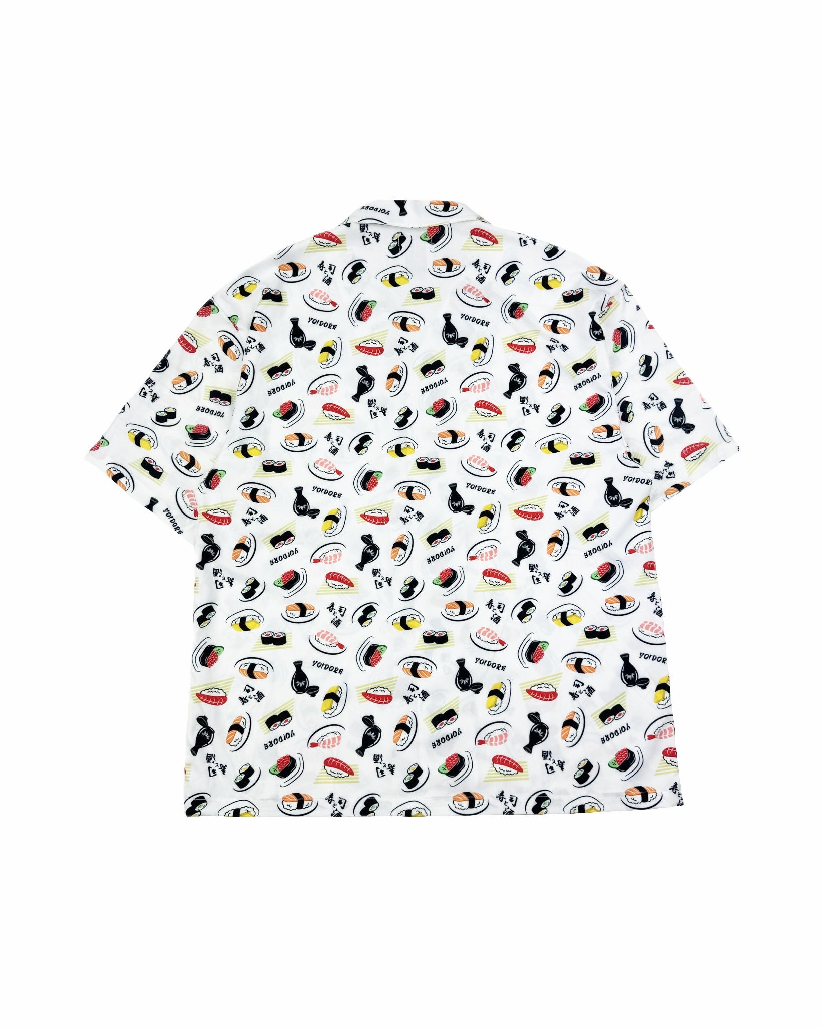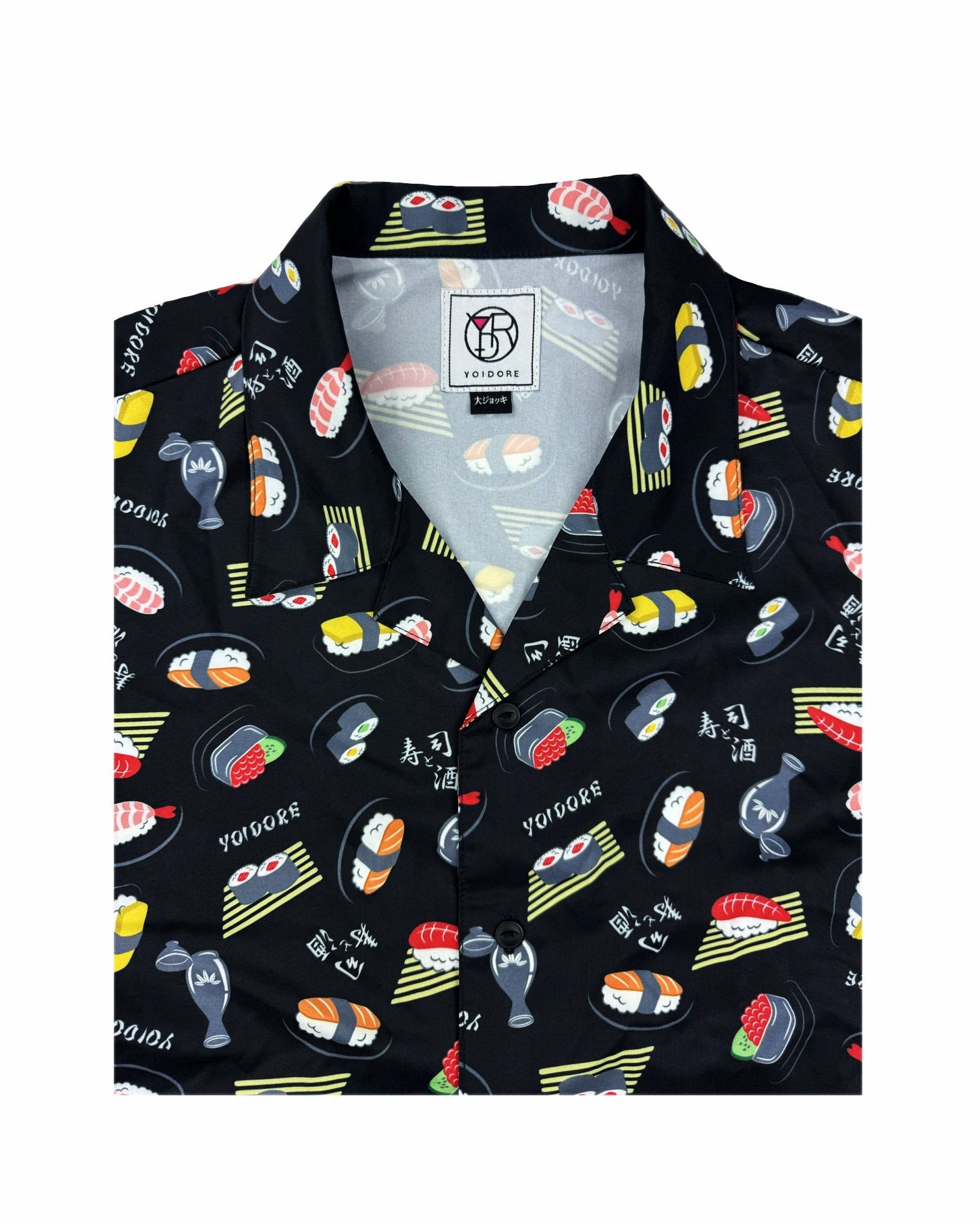 JAPAN GOOD FOODの代表格お寿司とお酒をオリジナル総柄デザインでプリントしたハイカラなオープンカラーシャツです。