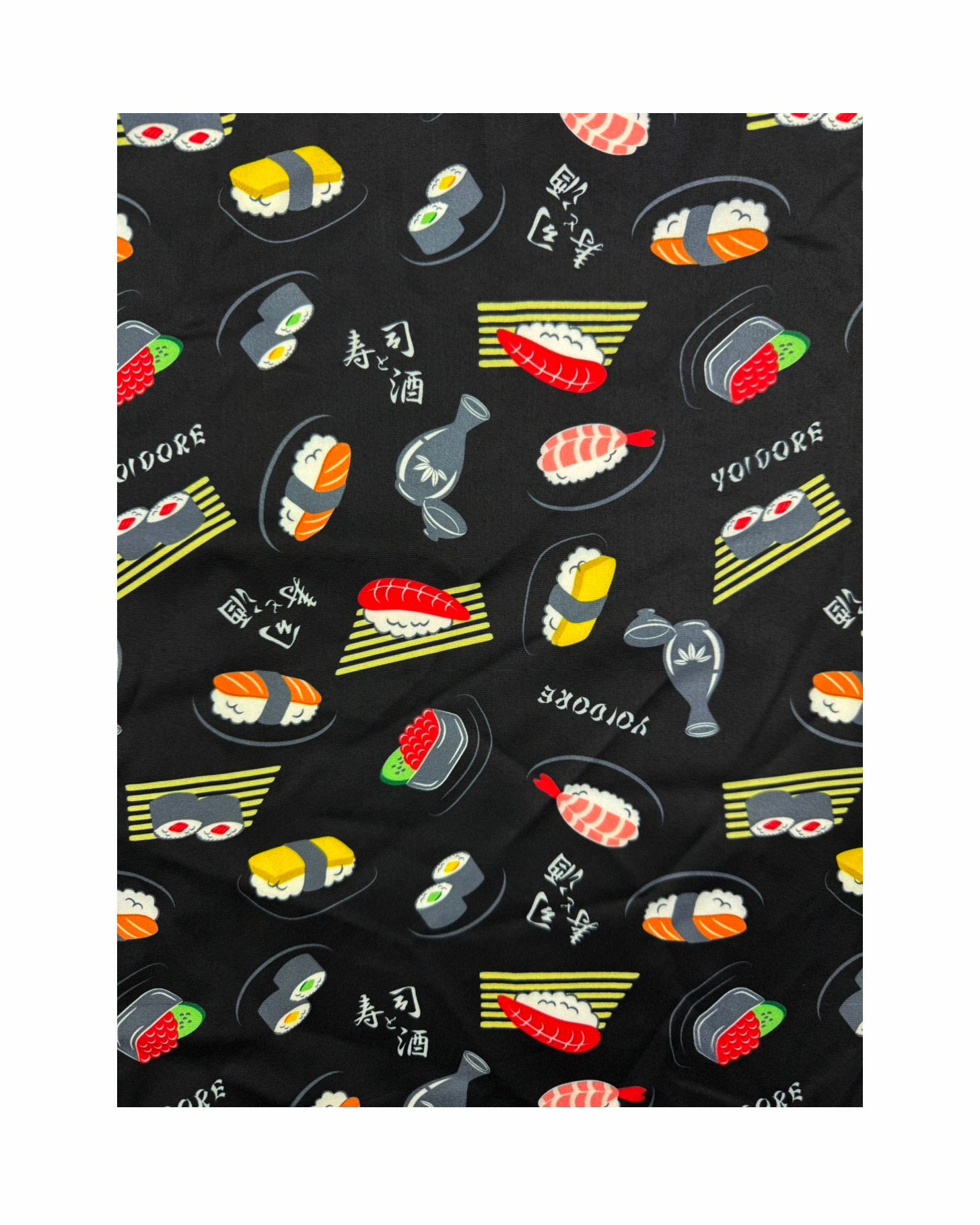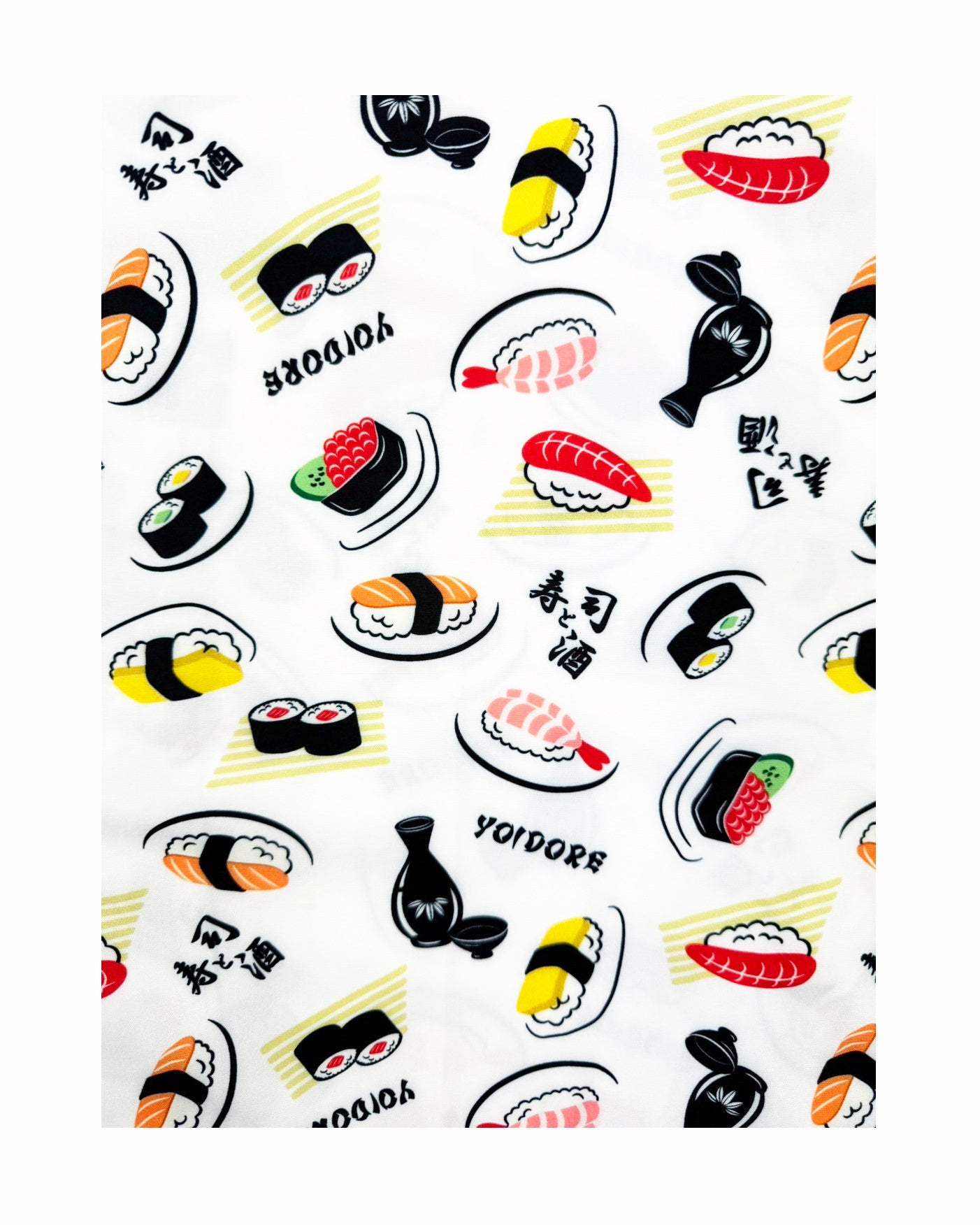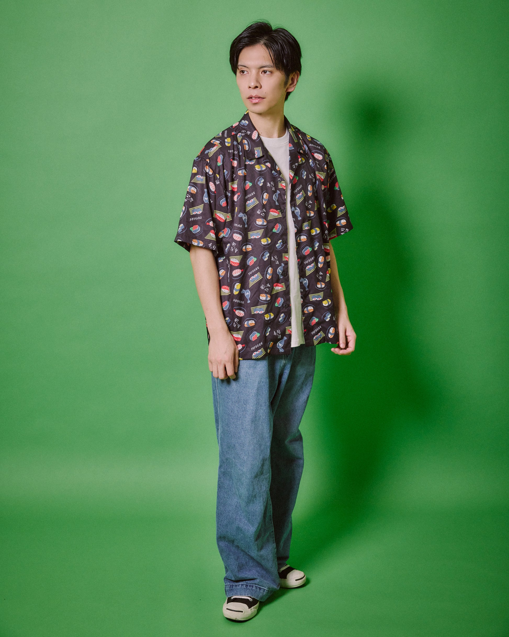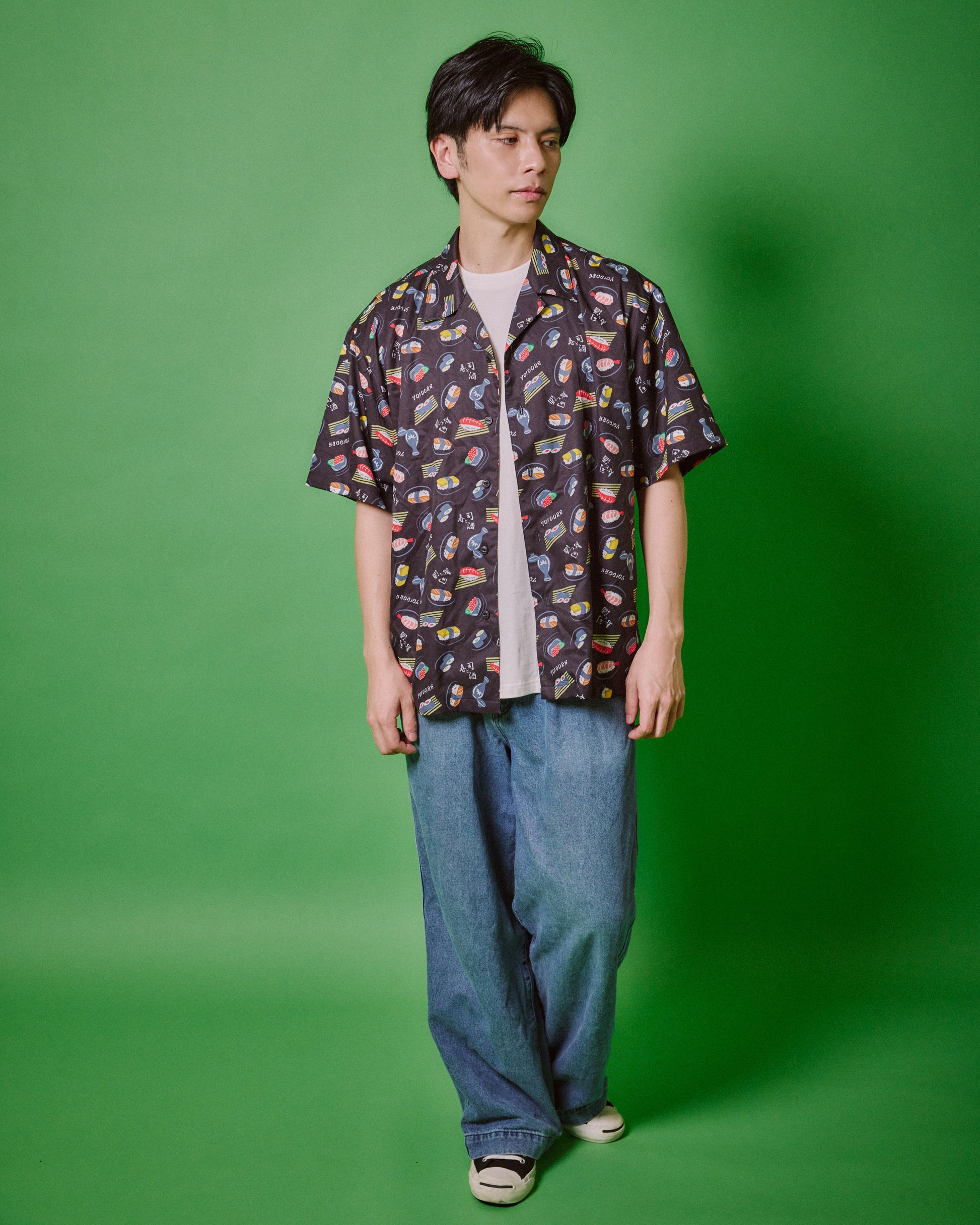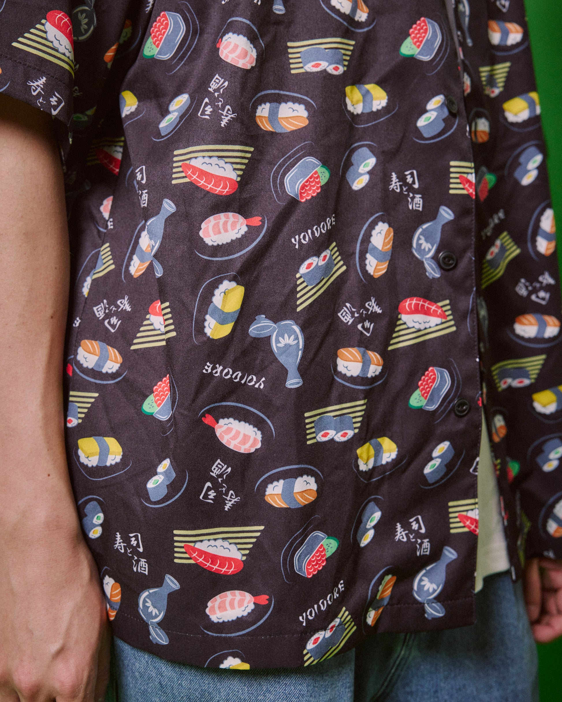 JAPAN GOOD FOODの代表格お寿司とお酒をオリジナル総柄デザインでプリントしたハイカラなオープンカラーシャツです。