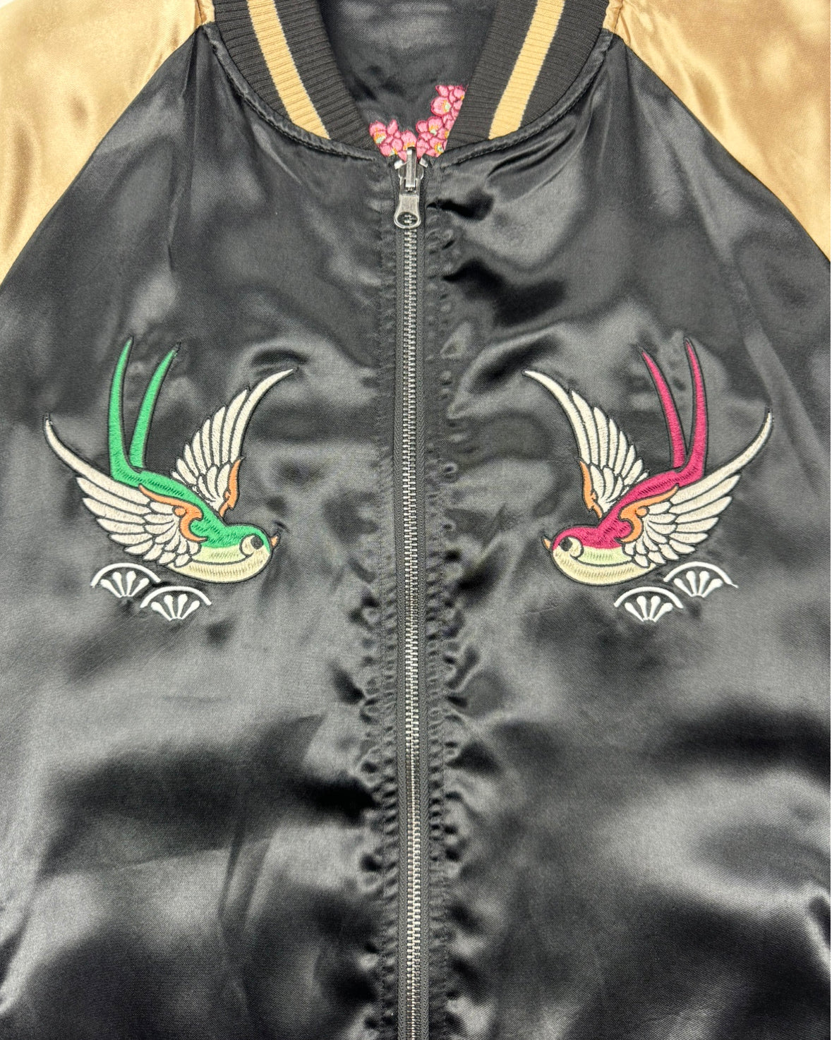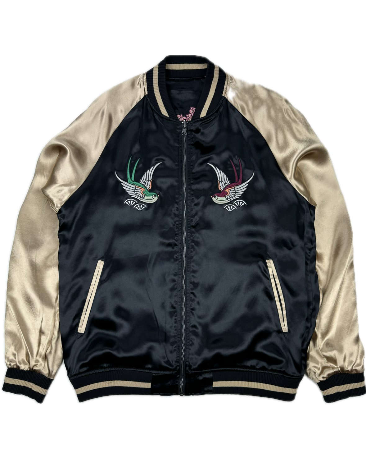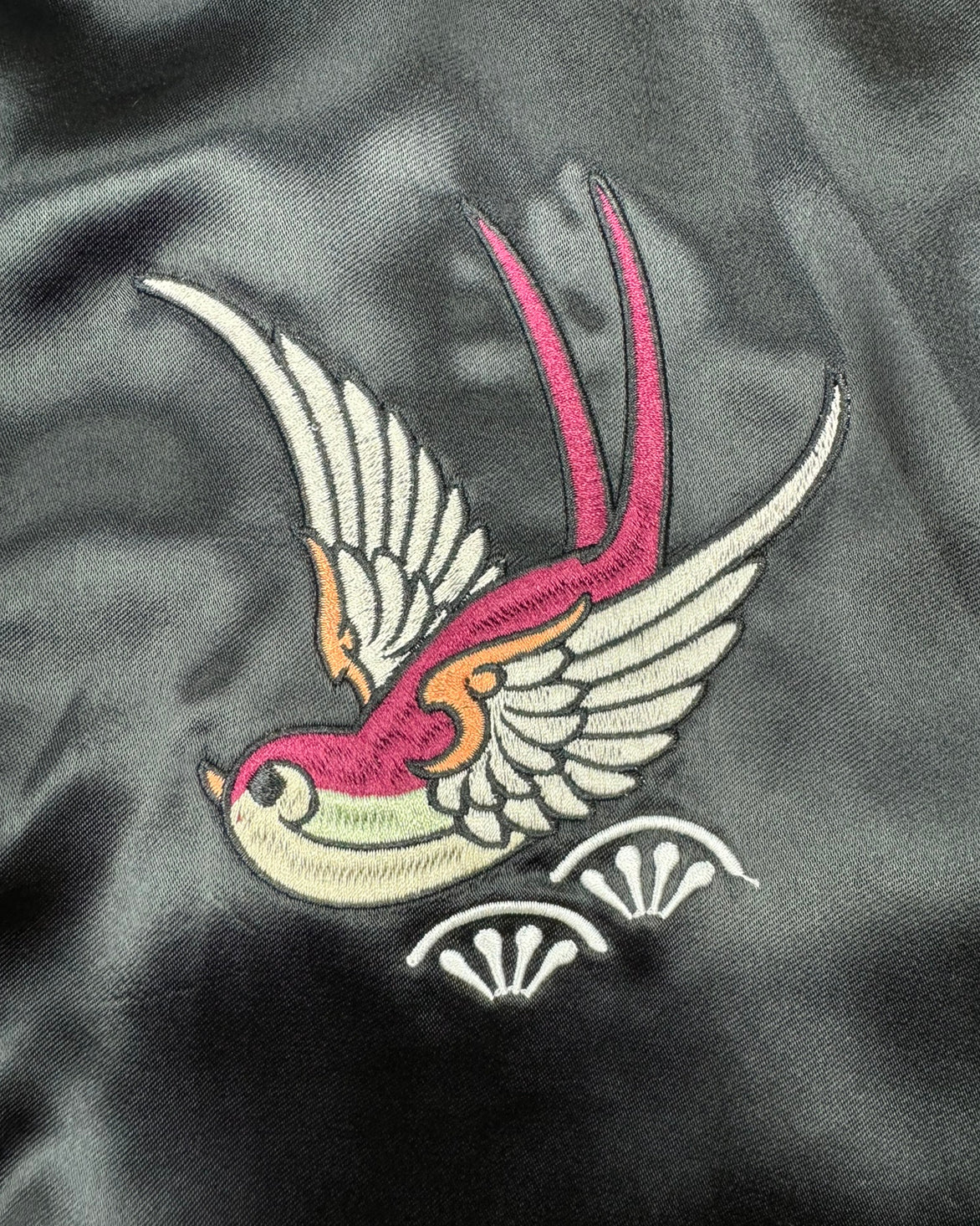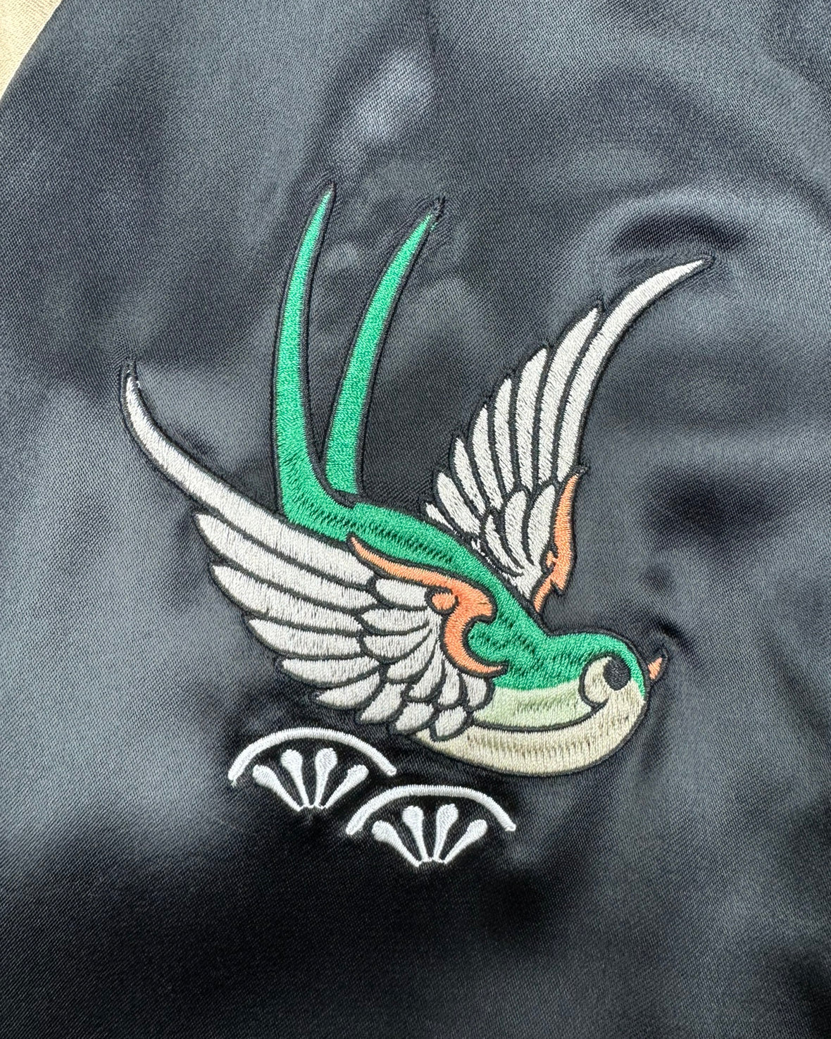 レーヨンサテン地を使用し、リバーシブル仕様で裏側のシンプルな両胸のツバメ刺繍でも楽しめる本格派のスカジャンです。