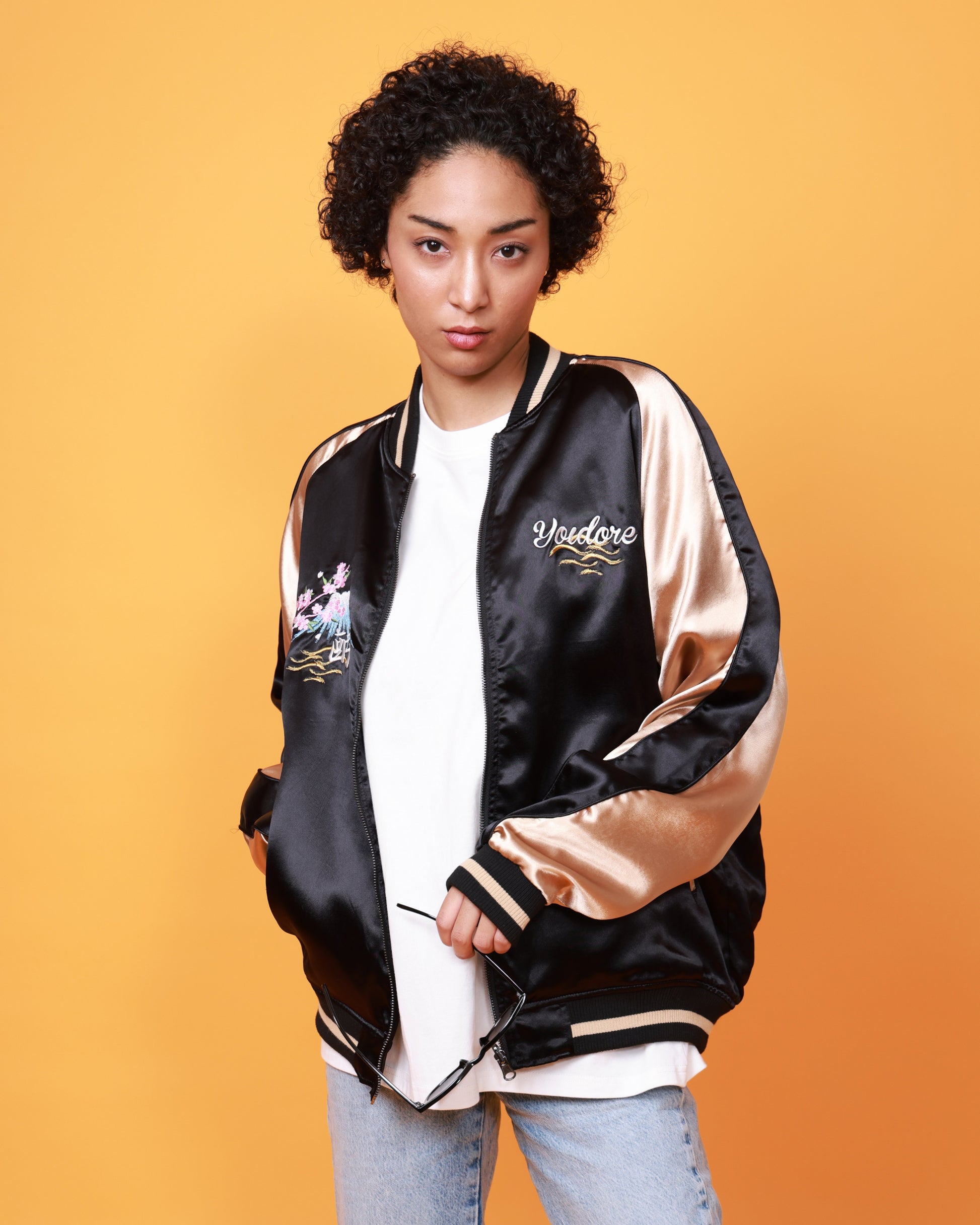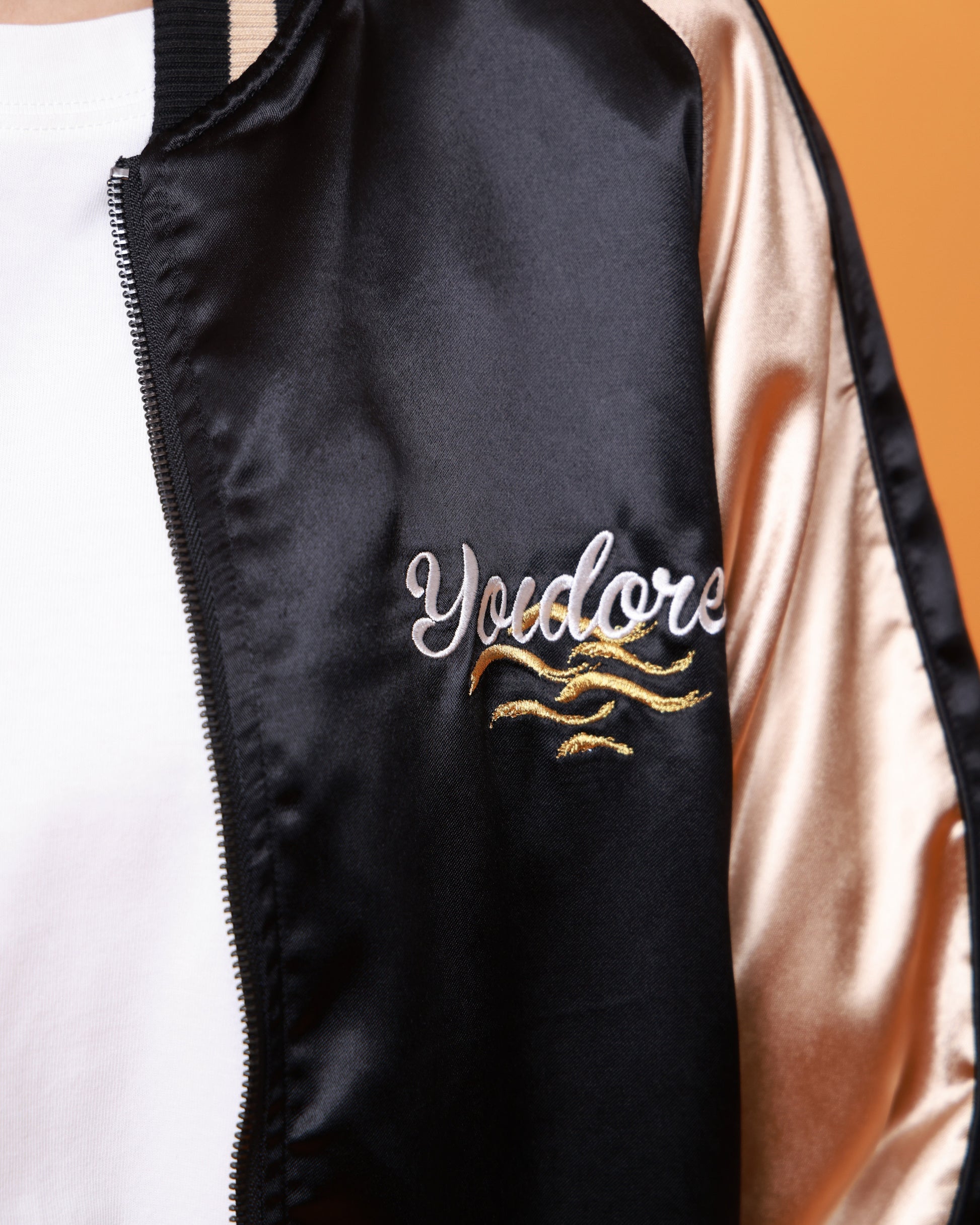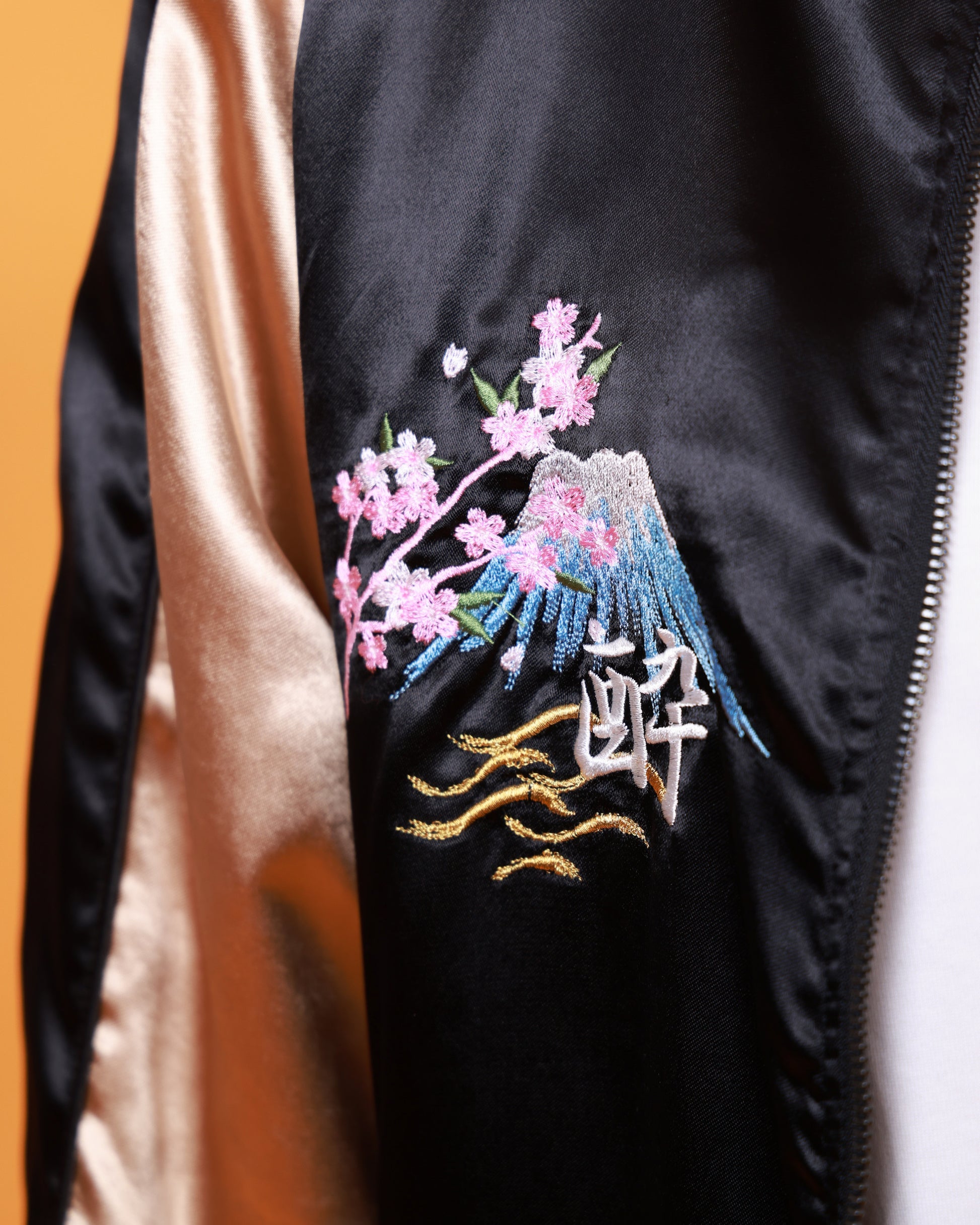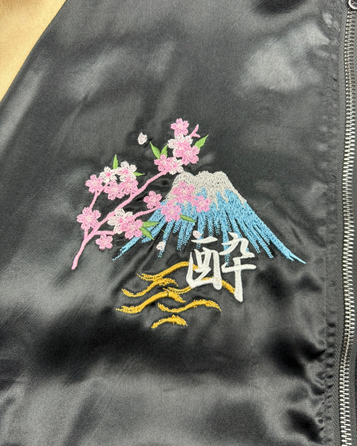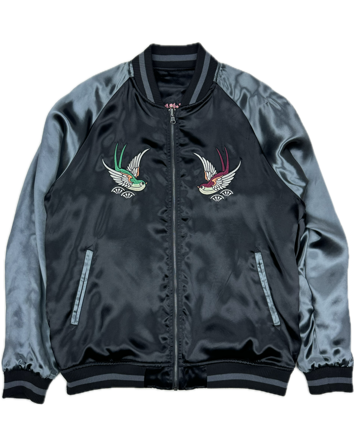 レーヨンサテン地を使用し、リバーシブル仕様で裏側のシンプルな両胸のツバメ刺繍でも楽しめる本格派のスカジャンです。