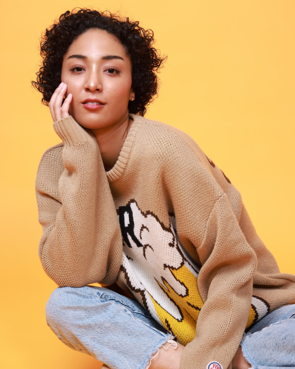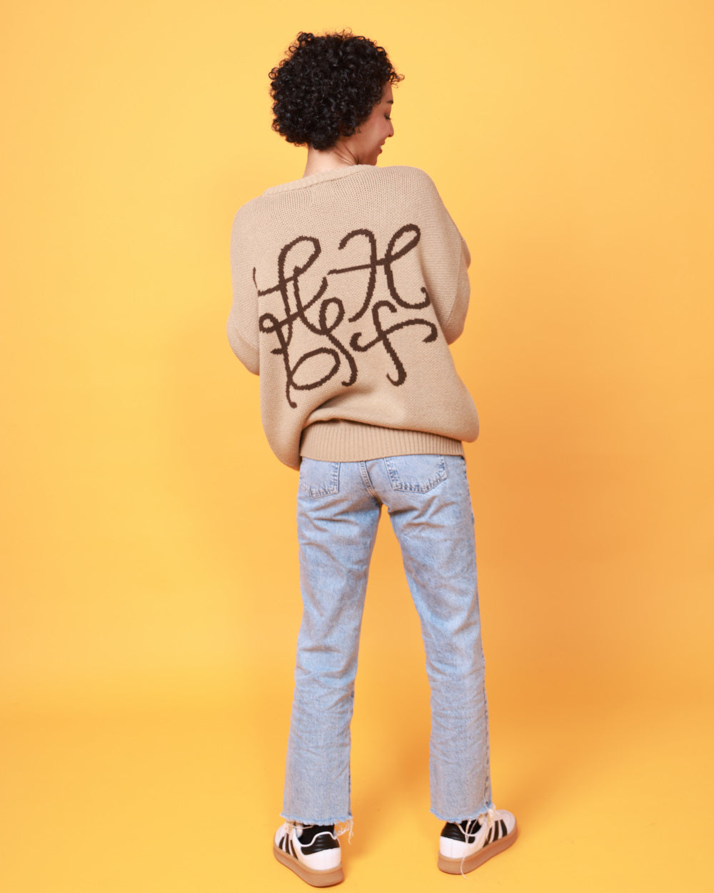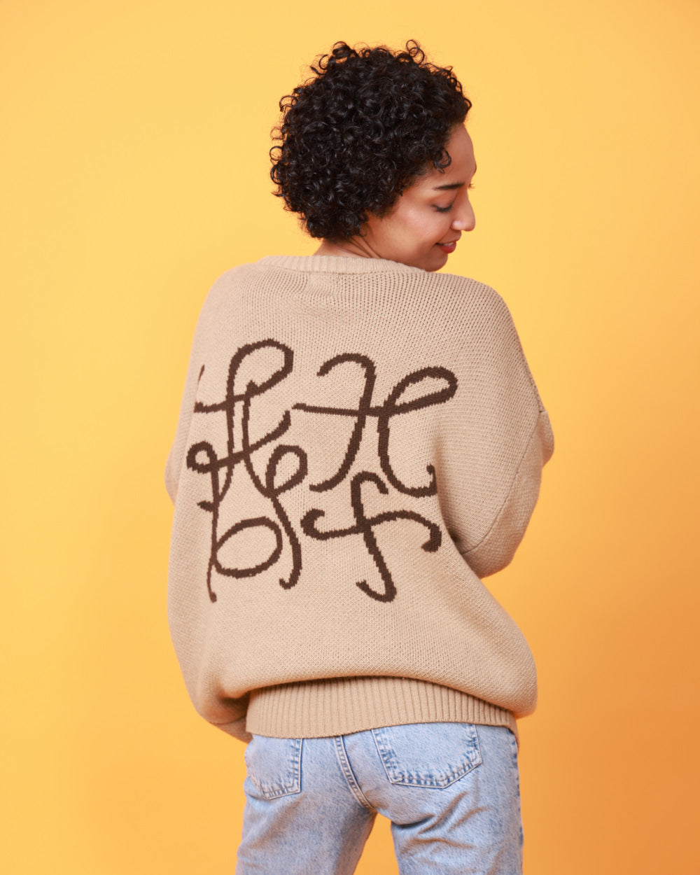しっかり厚みのある手のアクリルニットなのでお手入れも楽々でスウェット感覚で着れちゃいますよ。