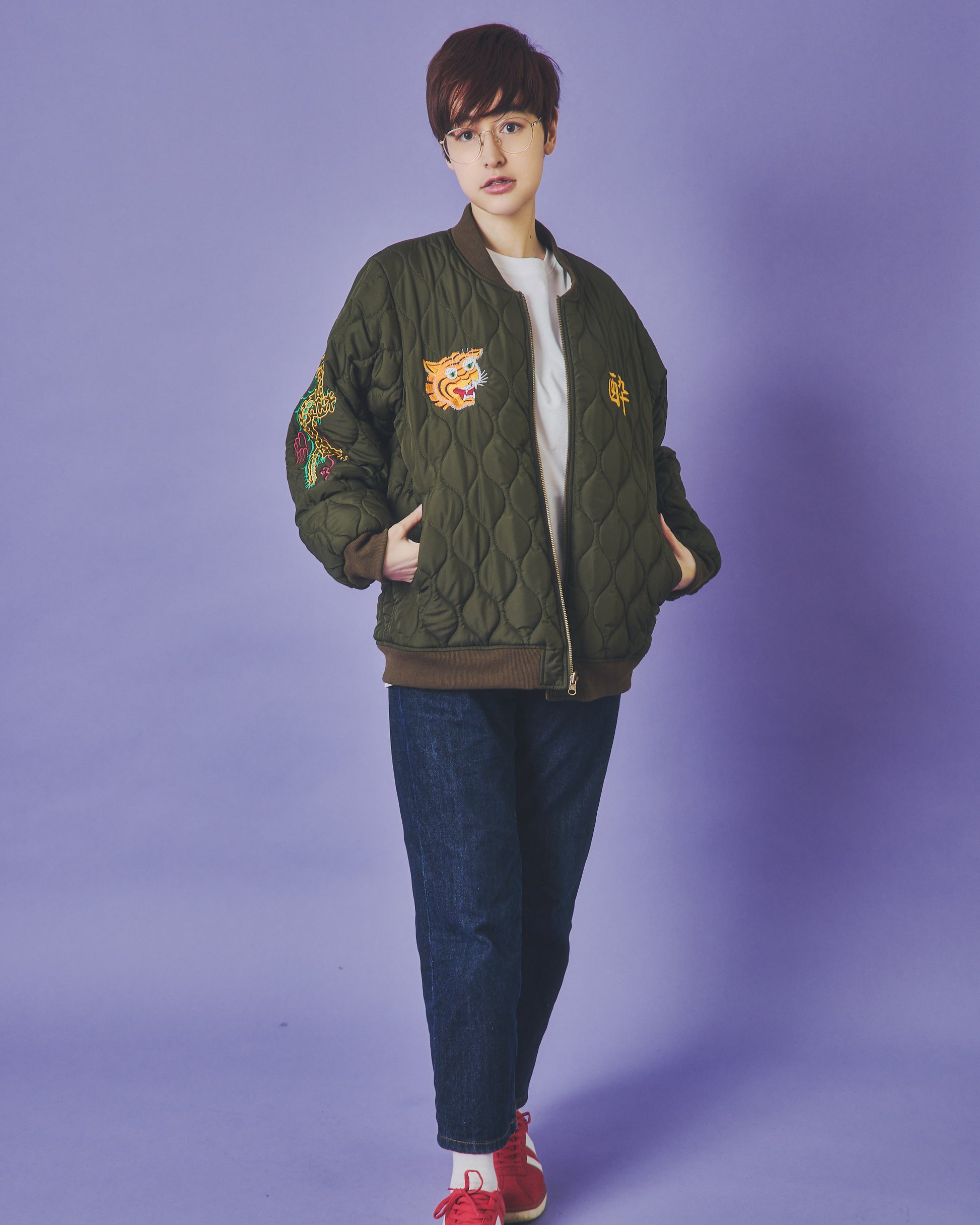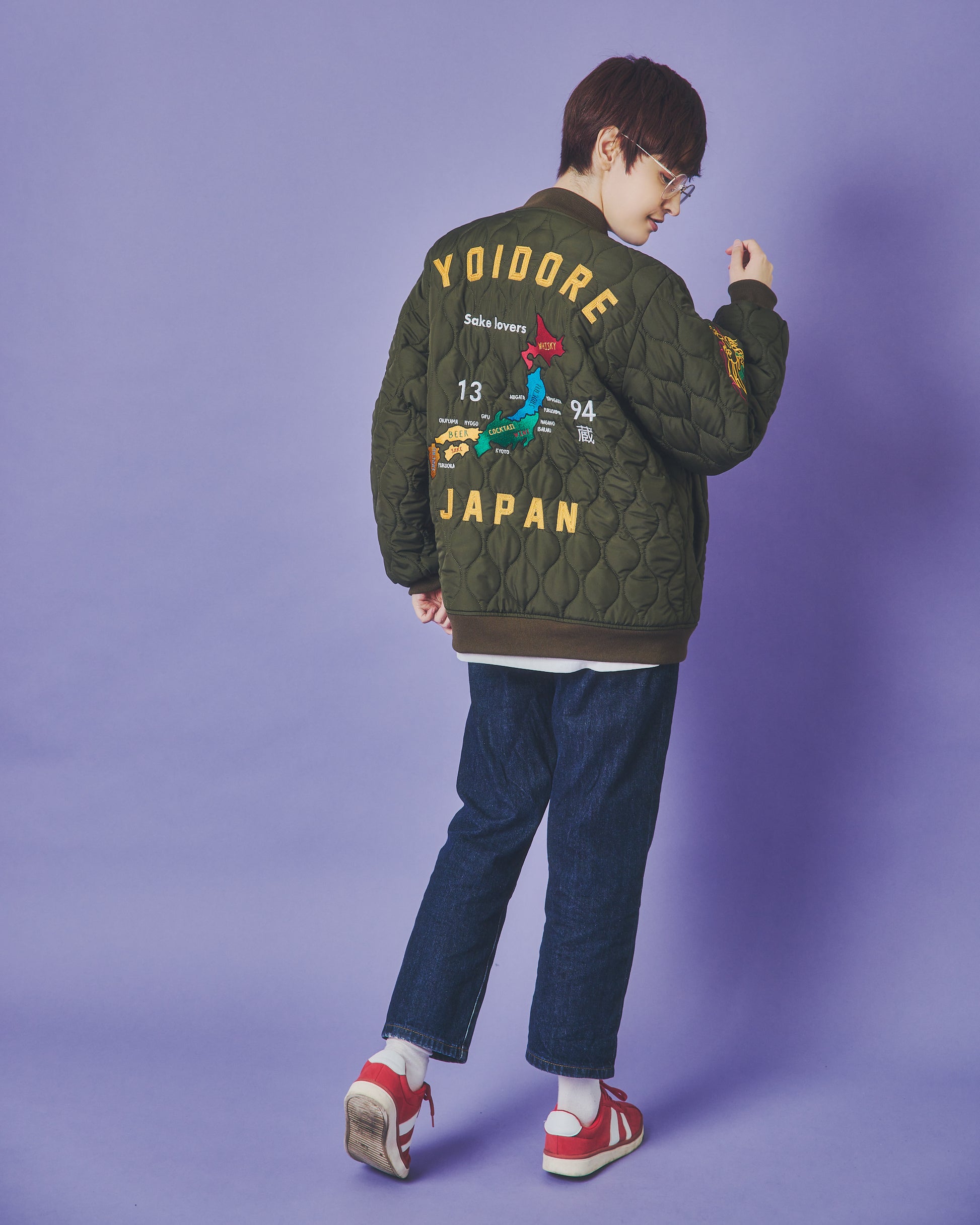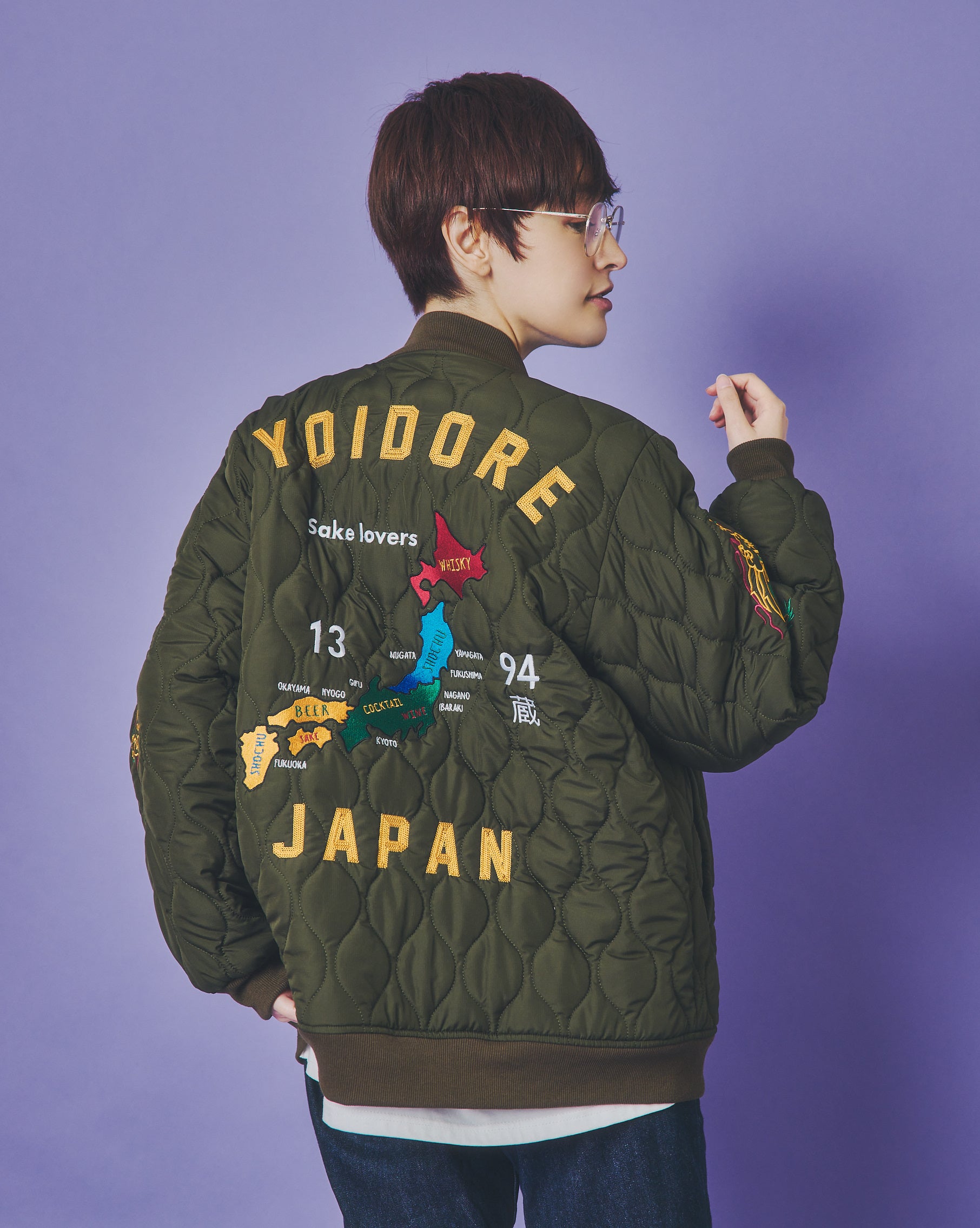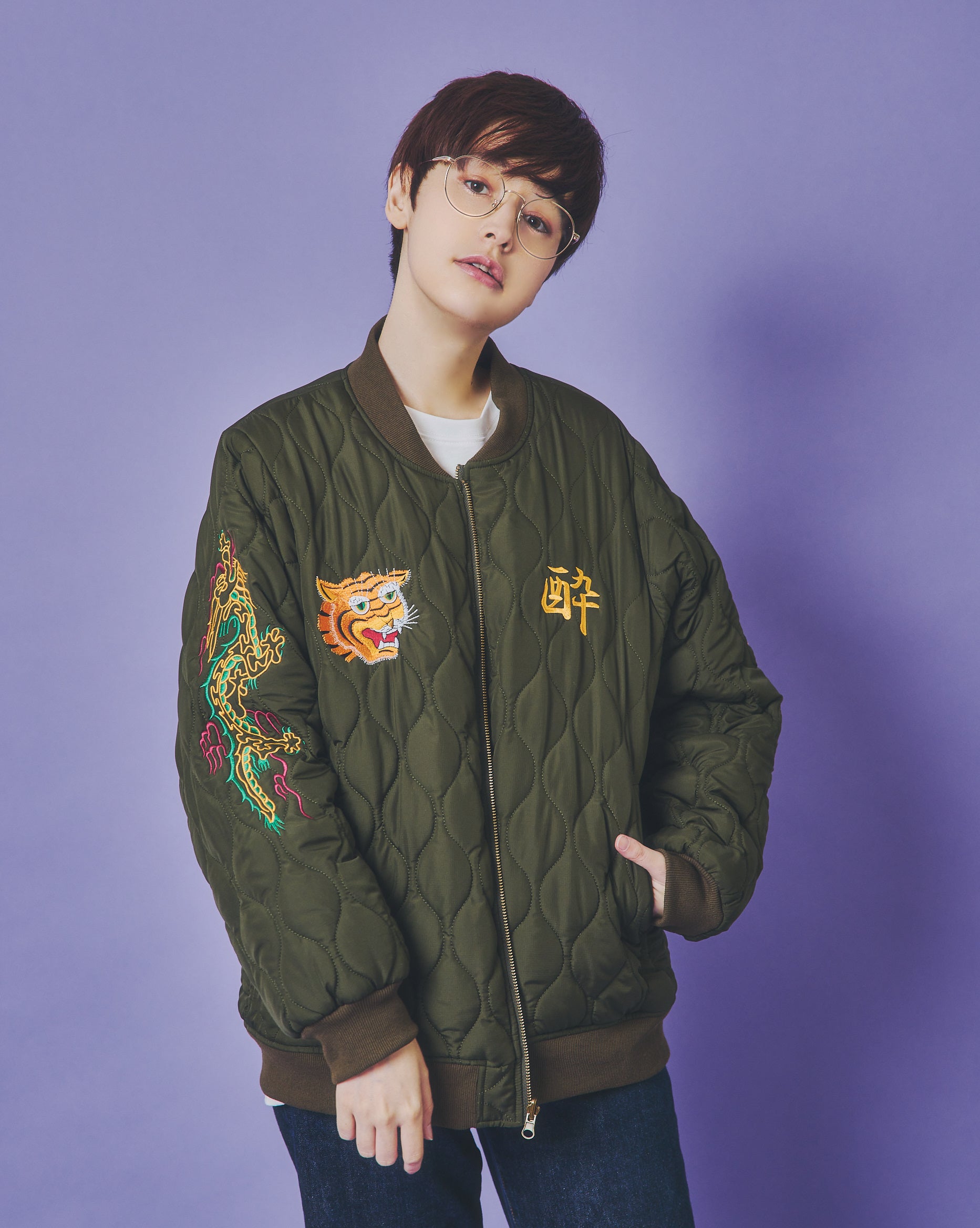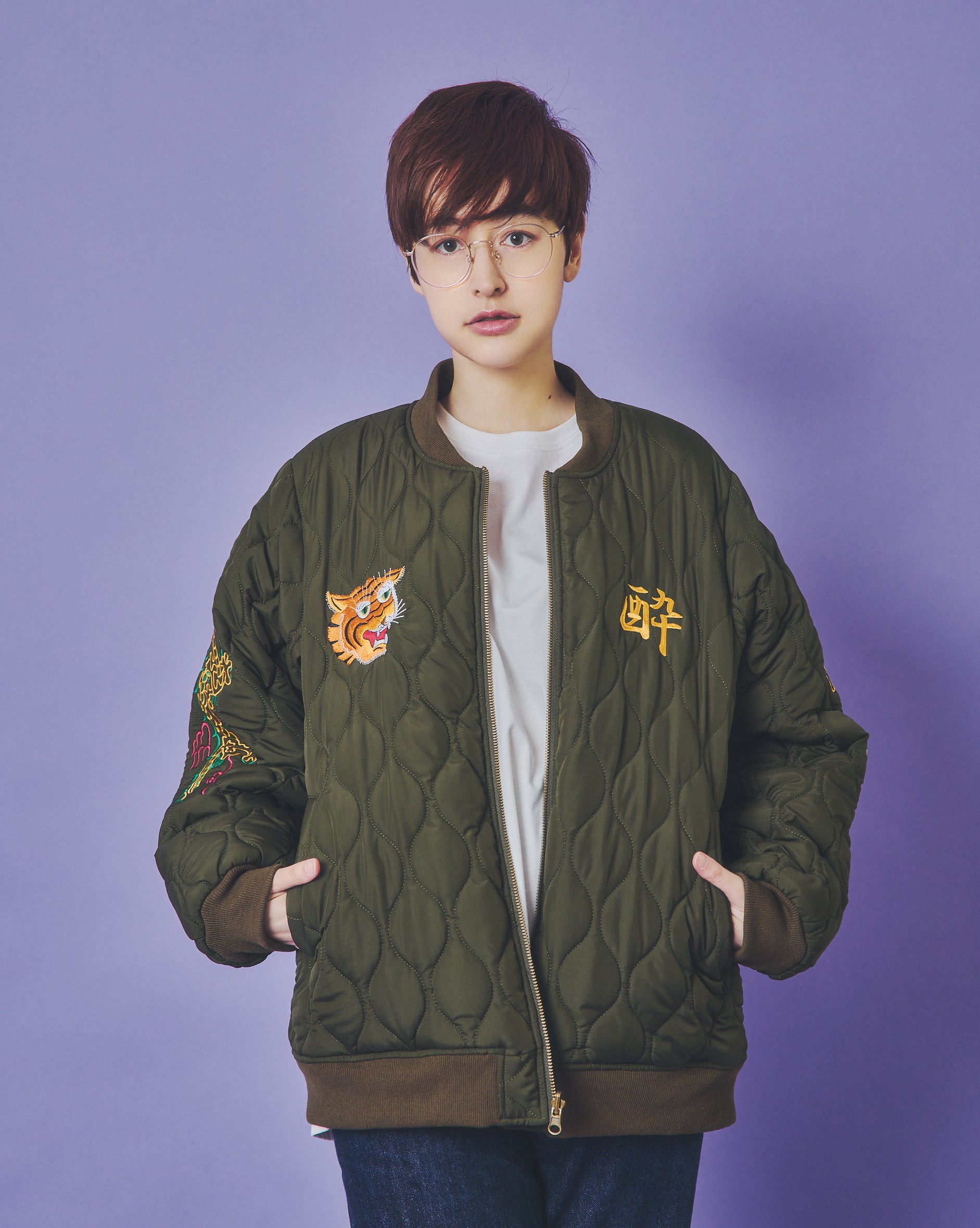 暖かみのあるウェーブキルト面はYOIDOREの代表的モチーフ「スーベニア」デザイン。胸には酔虎、袖には酔龍を刺繍であしらい、アグレッシブさを強調したミリタリーなアウターです。