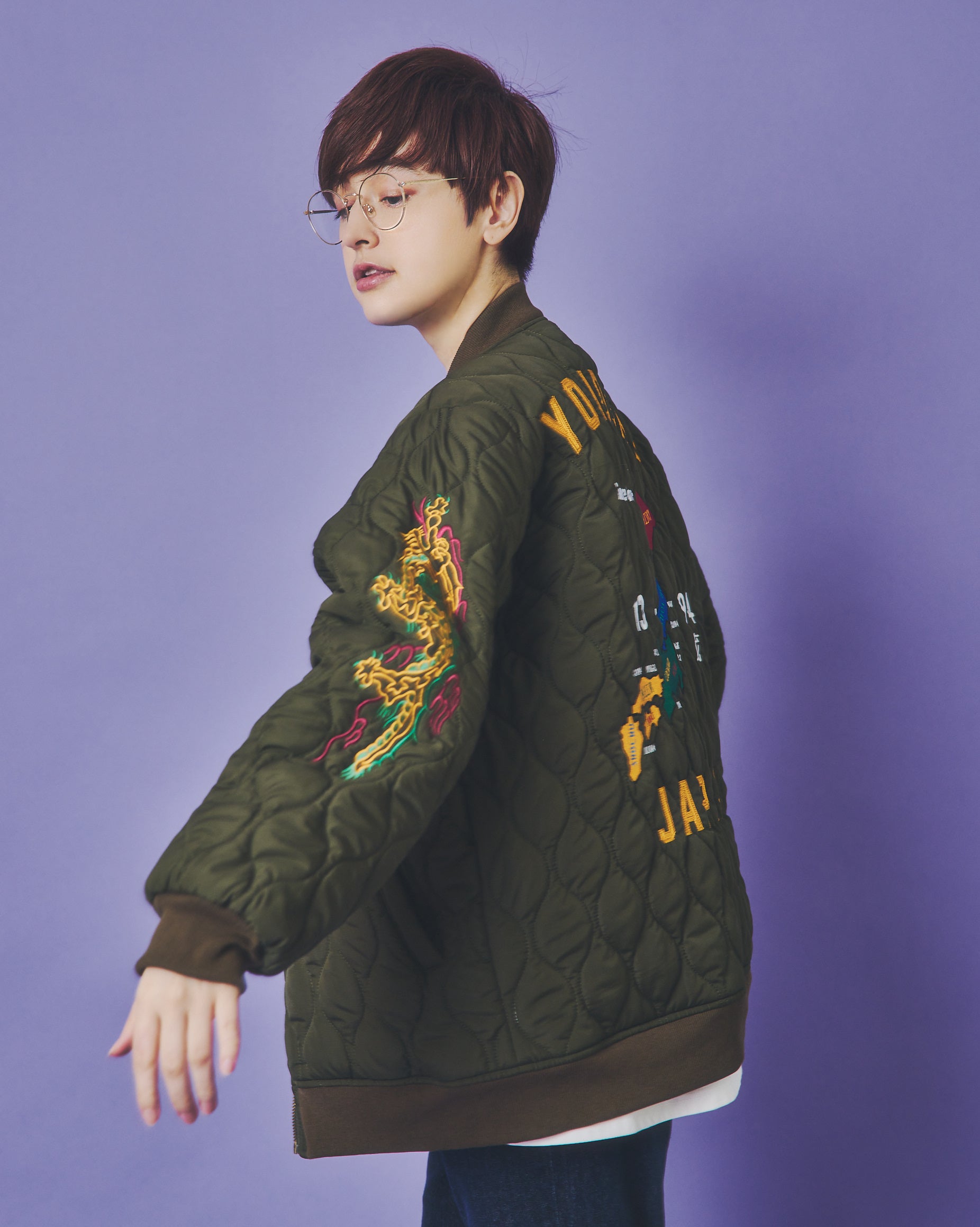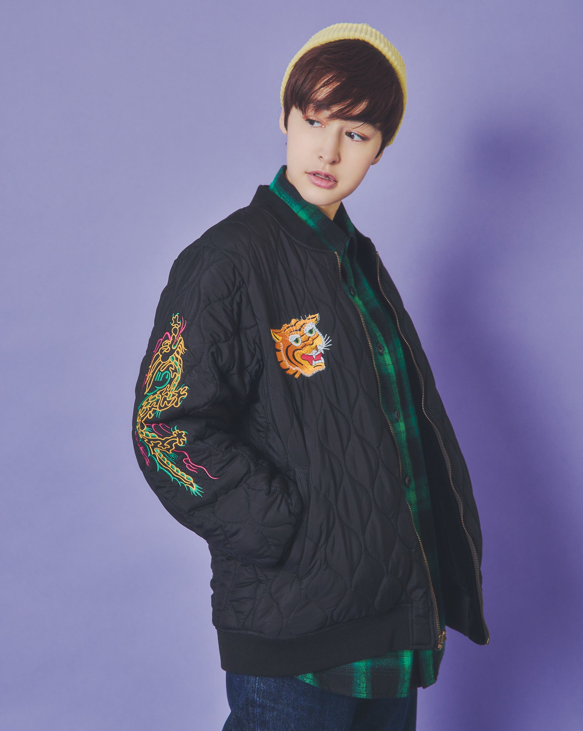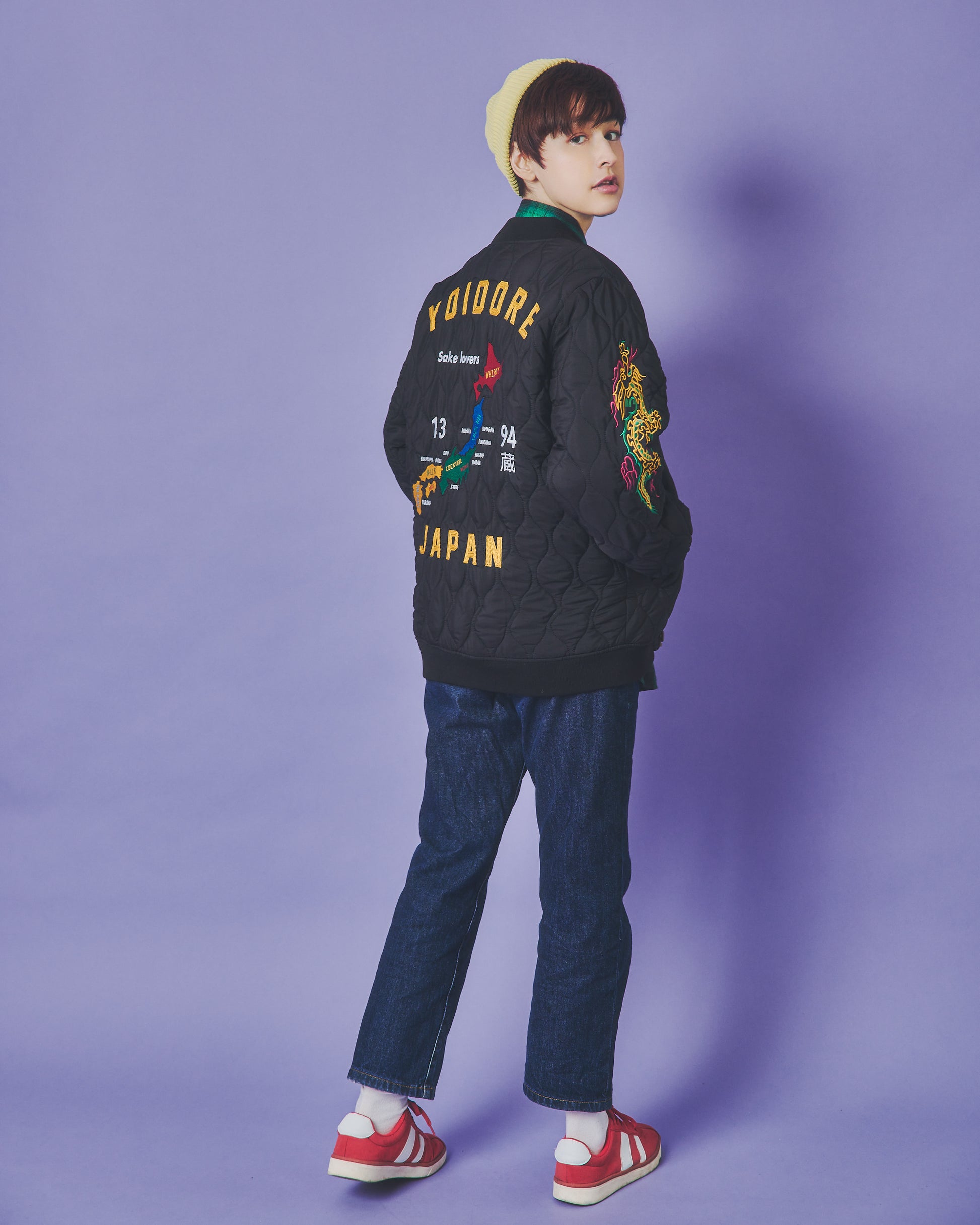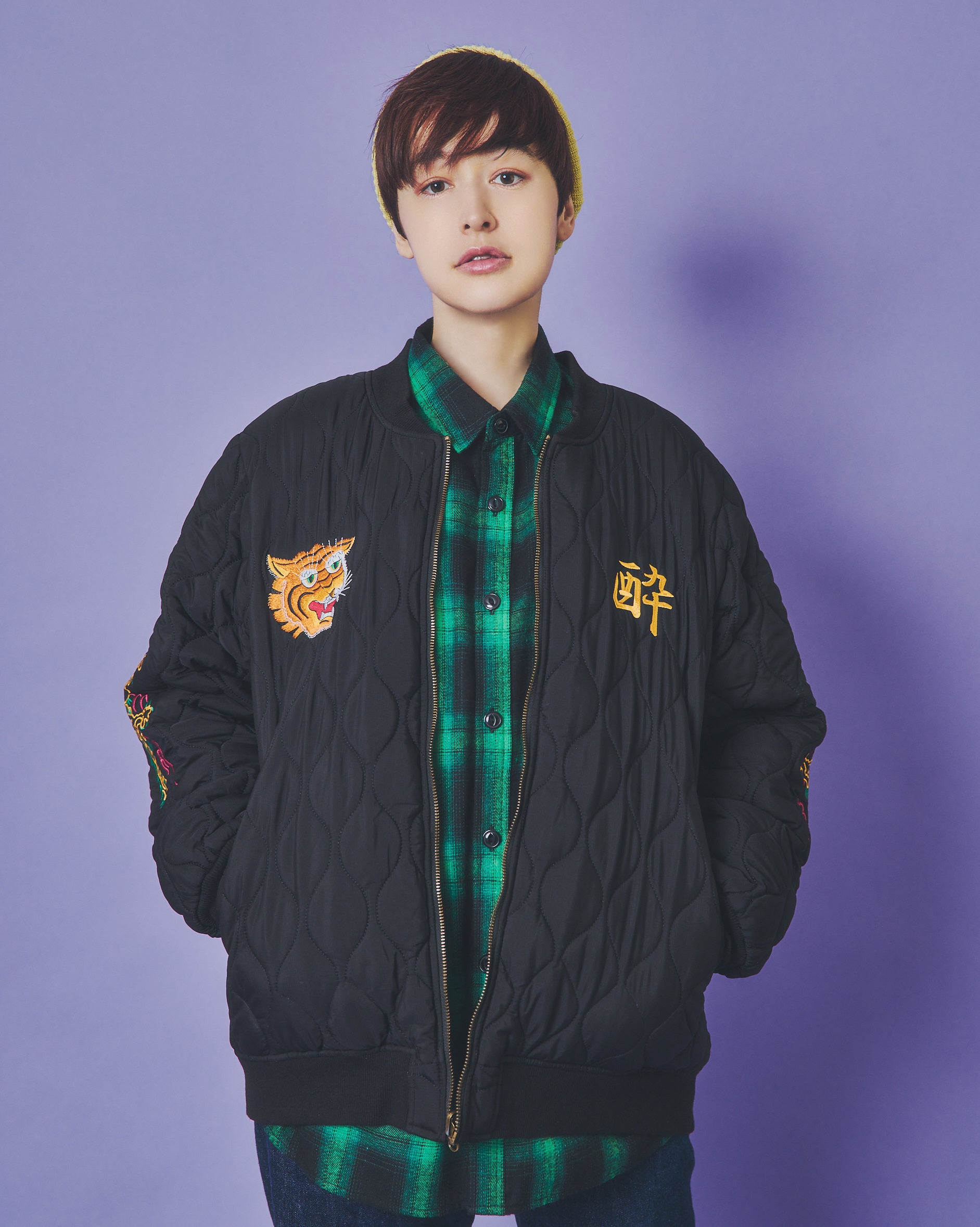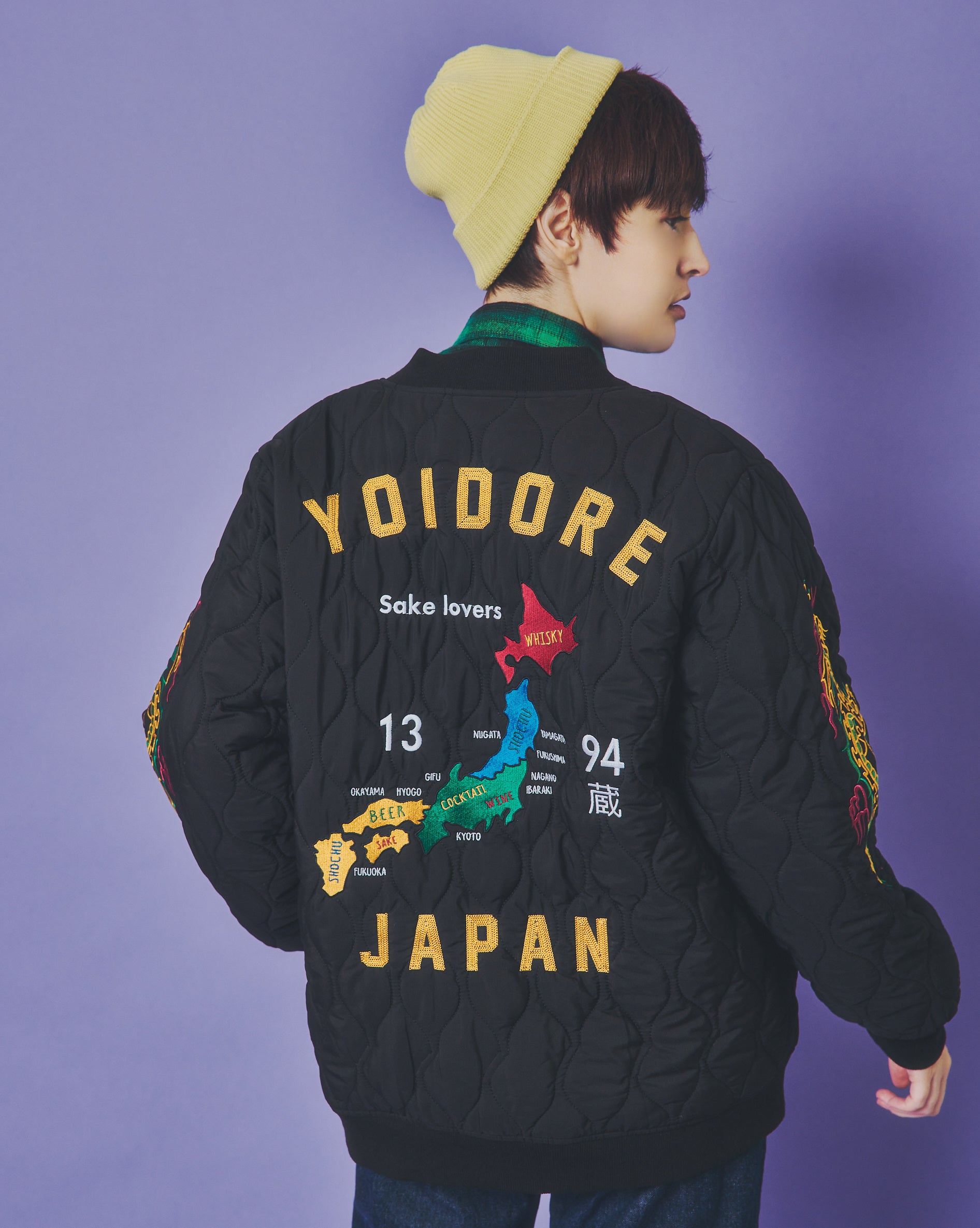 暖かみのあるウェーブキルト面はYOIDOREの代表的モチーフ「スーベニア」デザイン。胸には酔虎、袖には酔龍を刺繍であしらい、アグレッシブさを強調したミリタリーなアウターです。