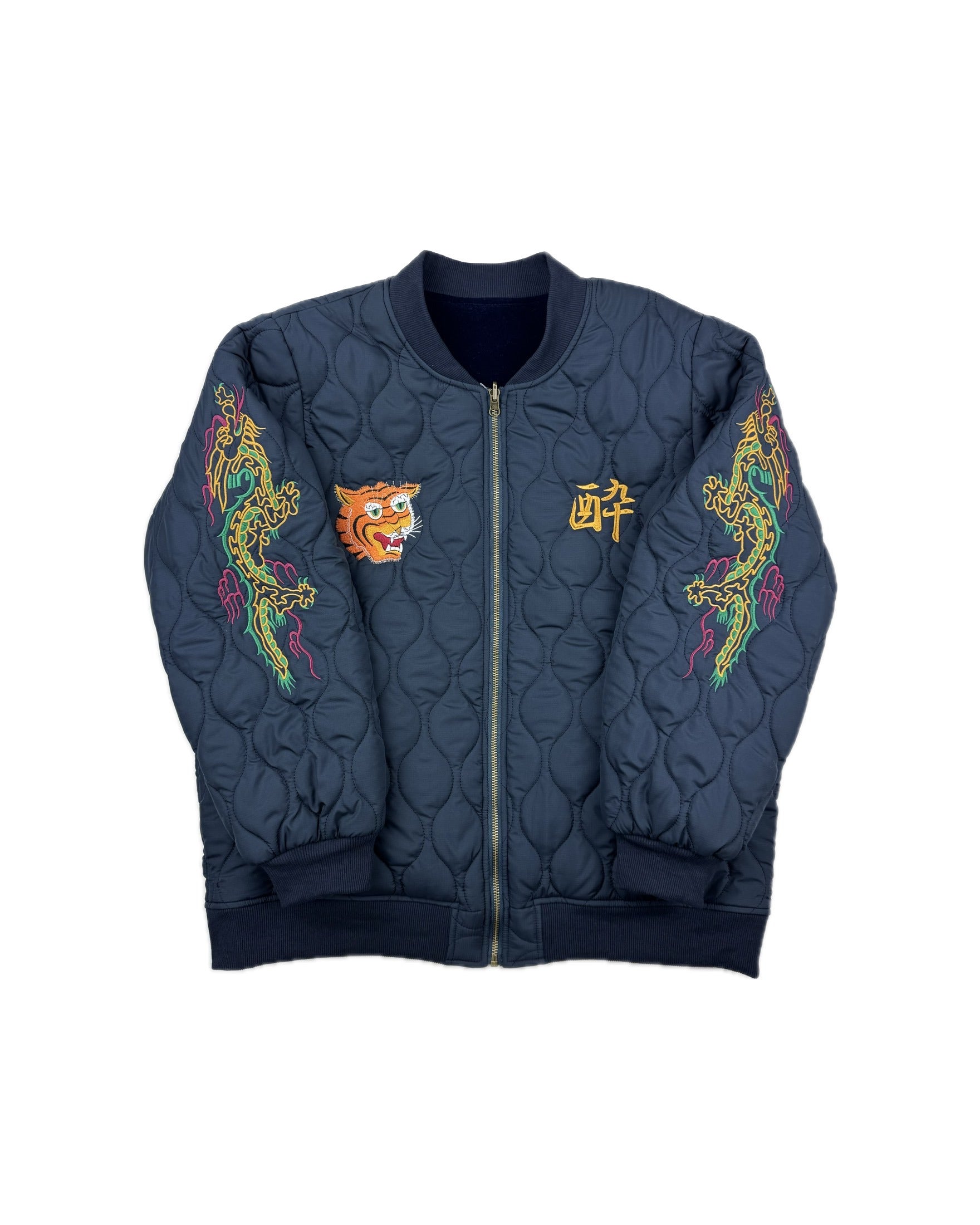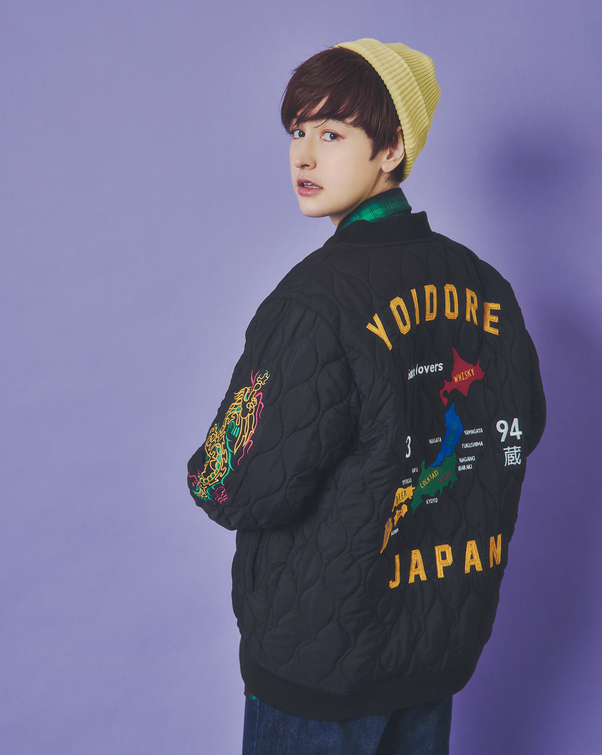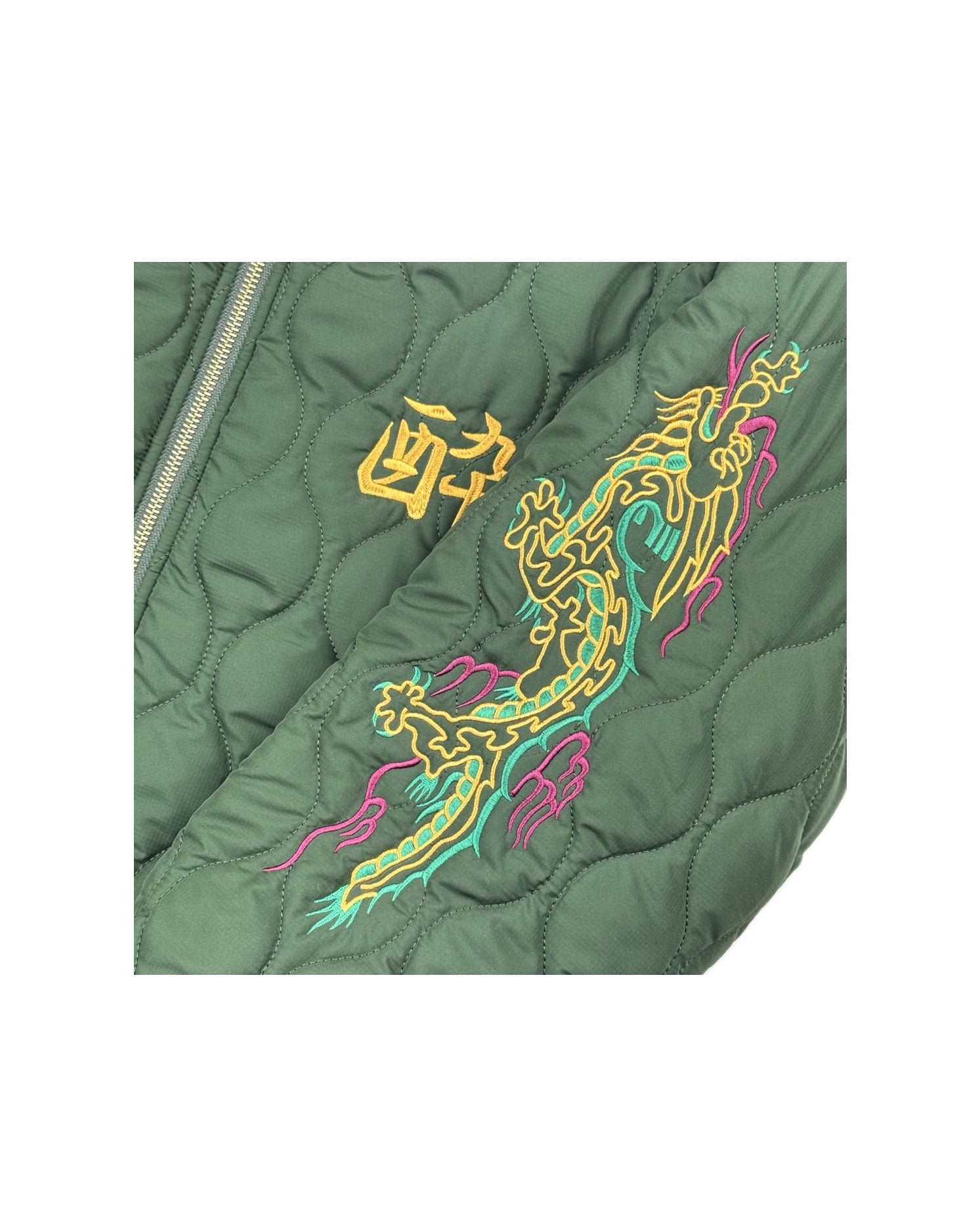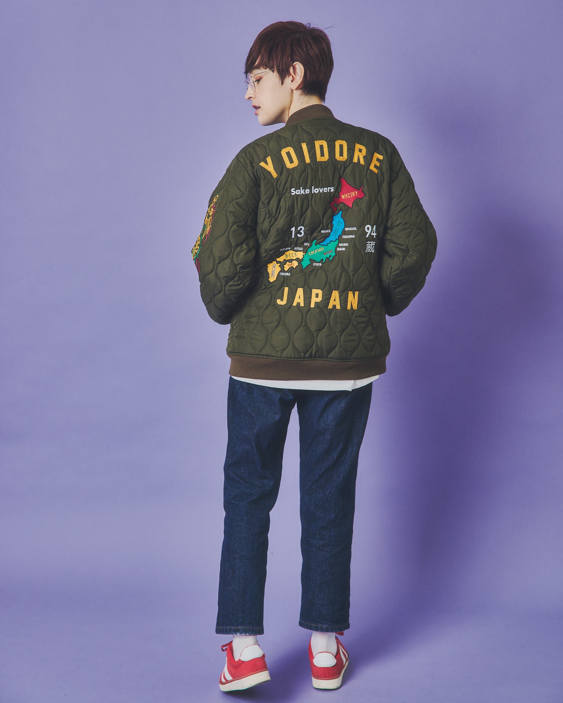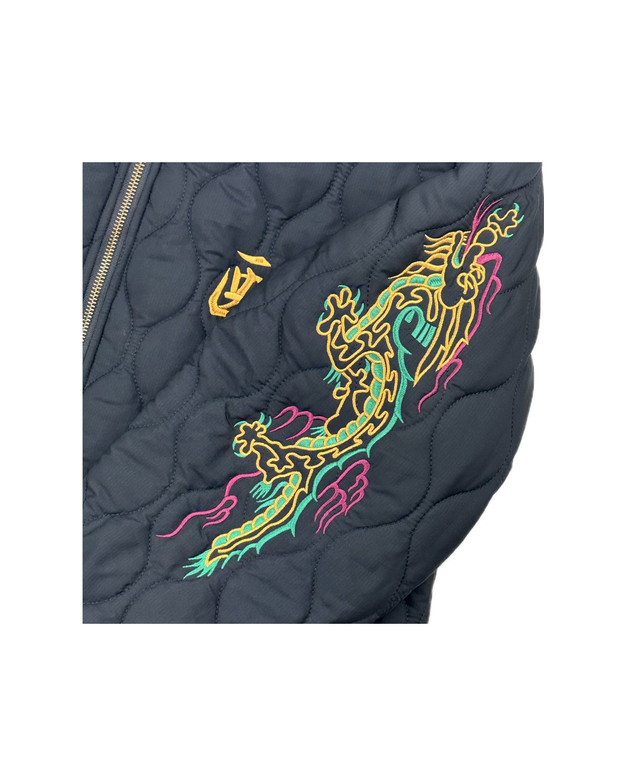 暖かみのあるウェーブキルト面はYOIDOREの代表的モチーフ「スーベニア」デザイン。胸には酔虎、袖には酔龍を刺繍であしらい、アグレッシブさを強調したミリタリーなアウターです。