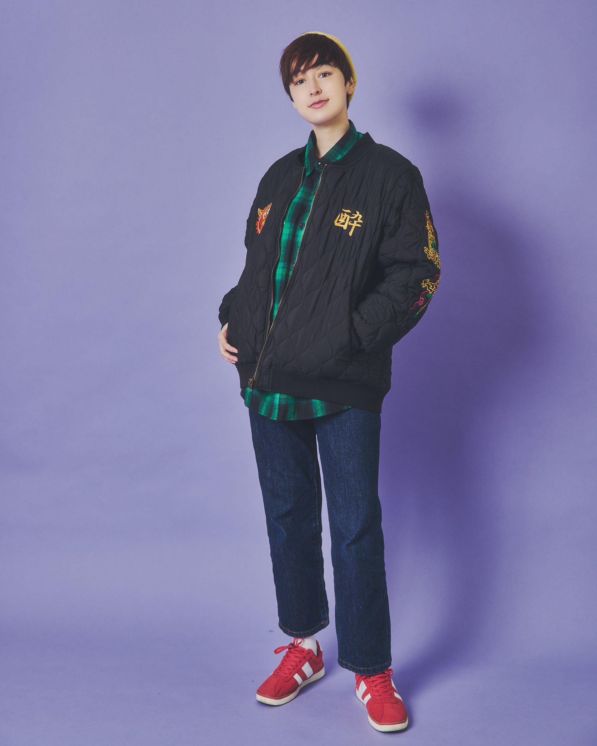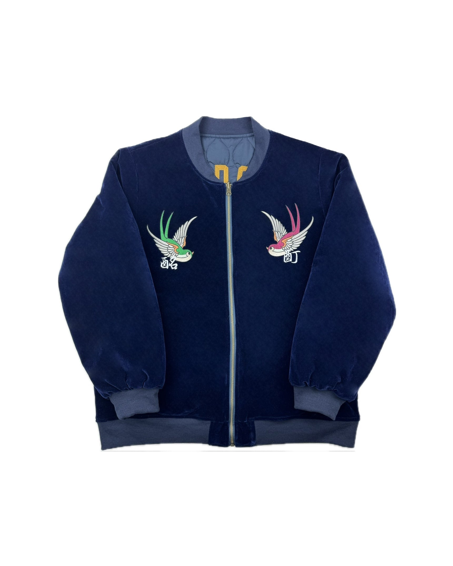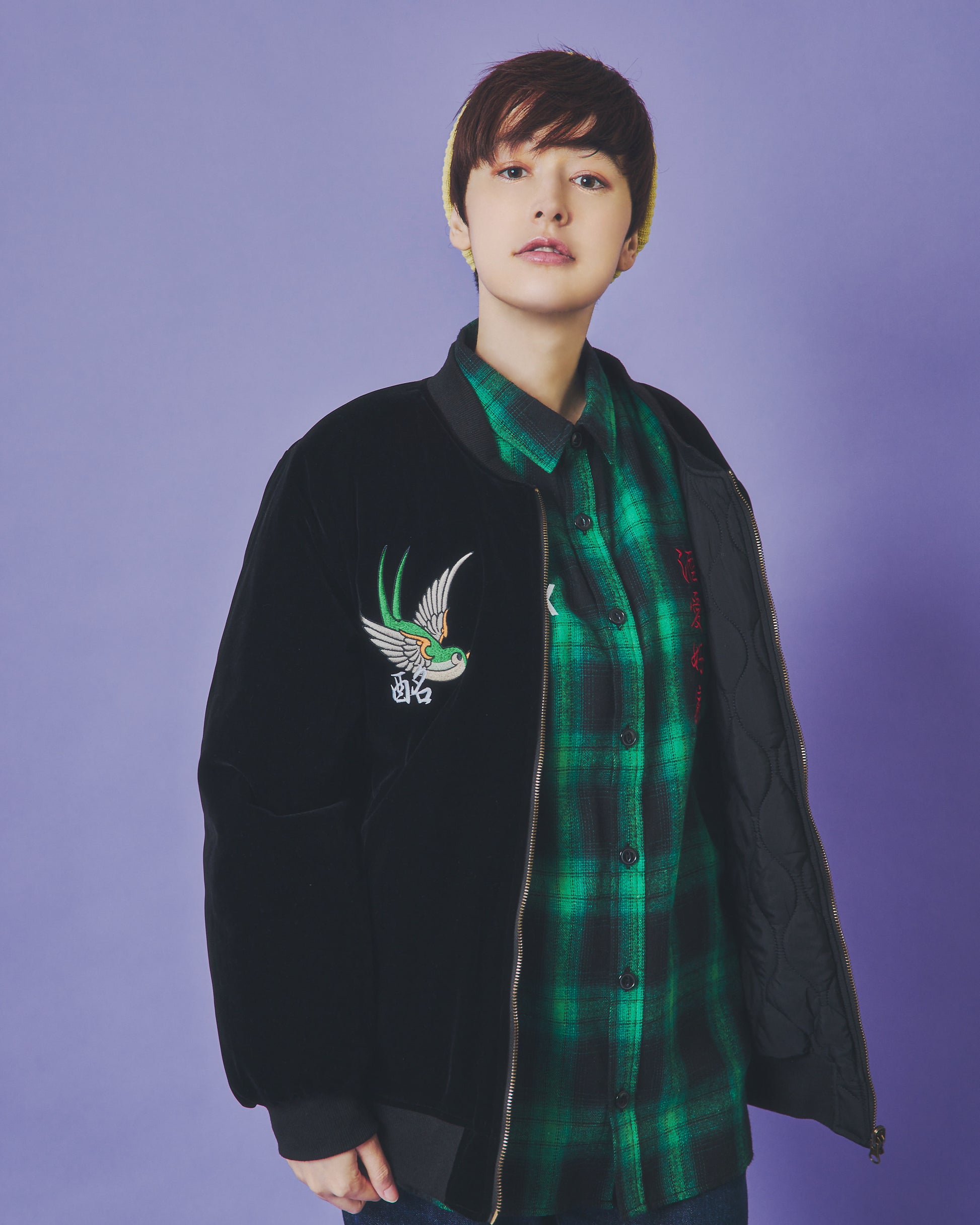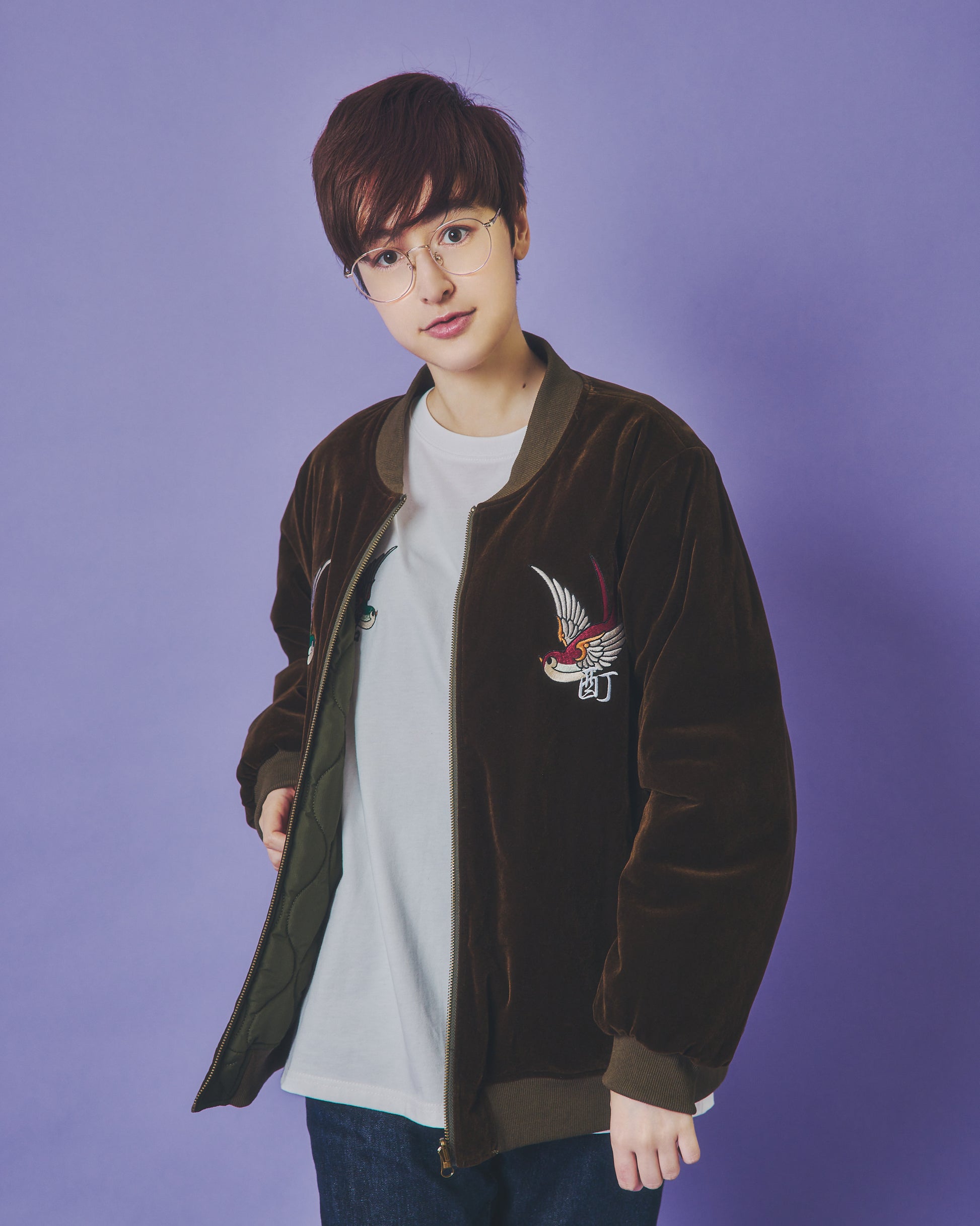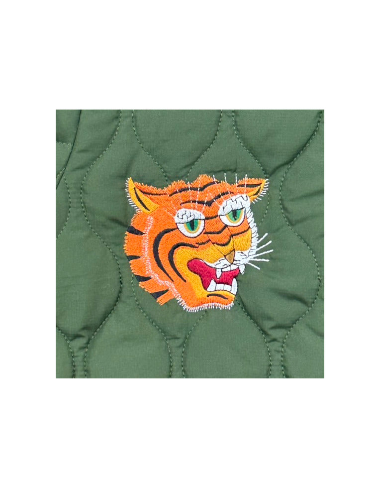 暖かみのあるウェーブキルト面はYOIDOREの代表的モチーフ「スーベニア」デザイン。胸には酔虎、袖には酔龍を刺繍であしらい、アグレッシブさを強調したミリタリーなアウターです。
