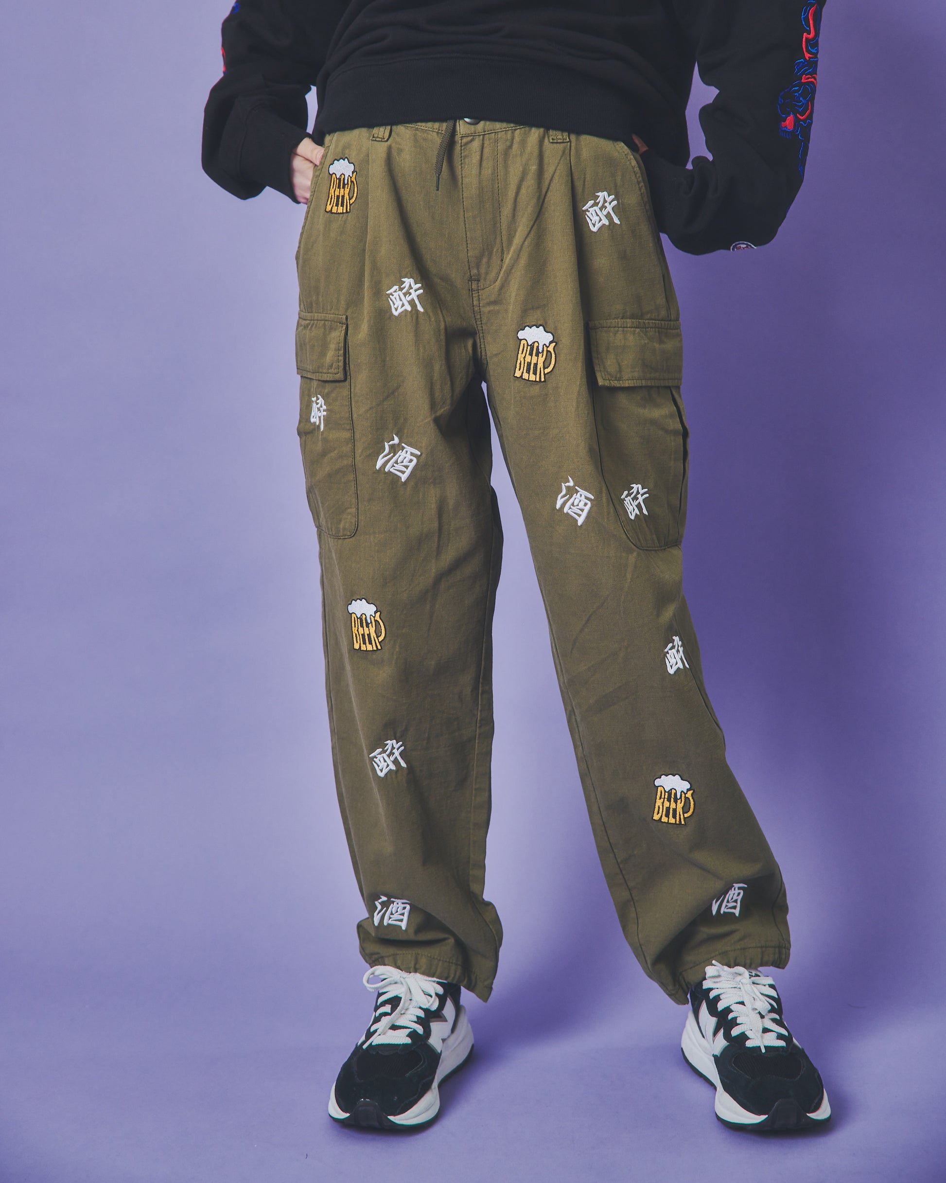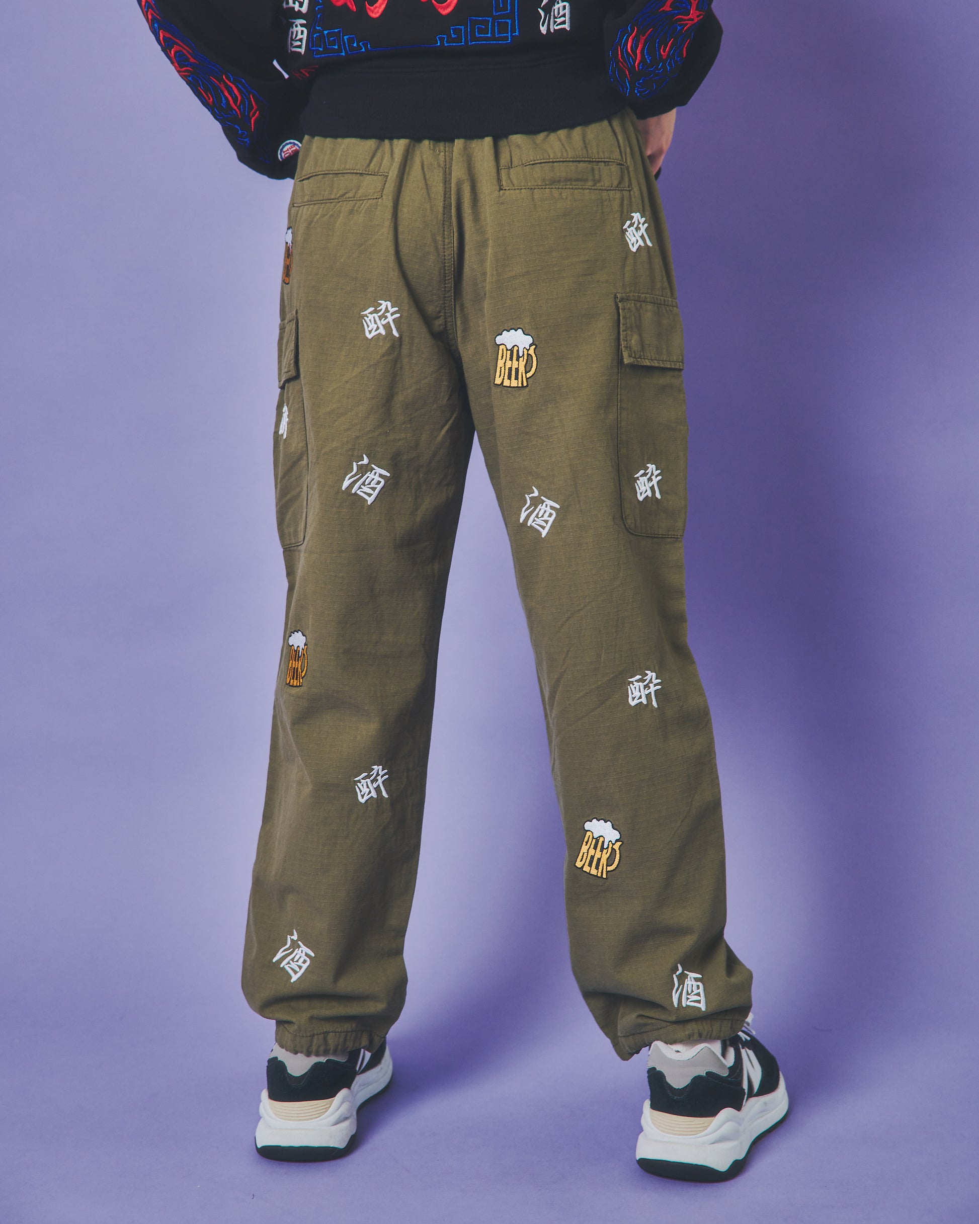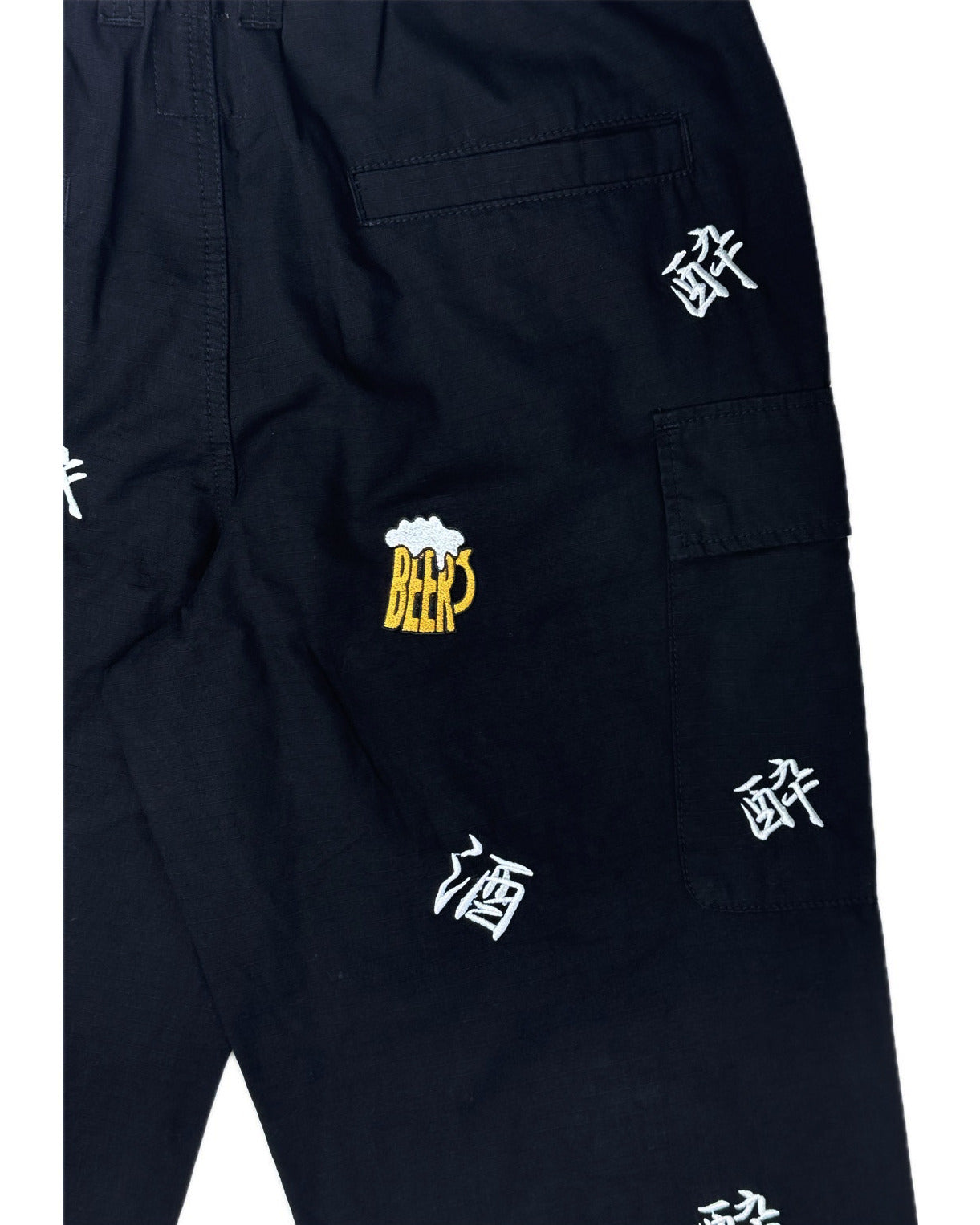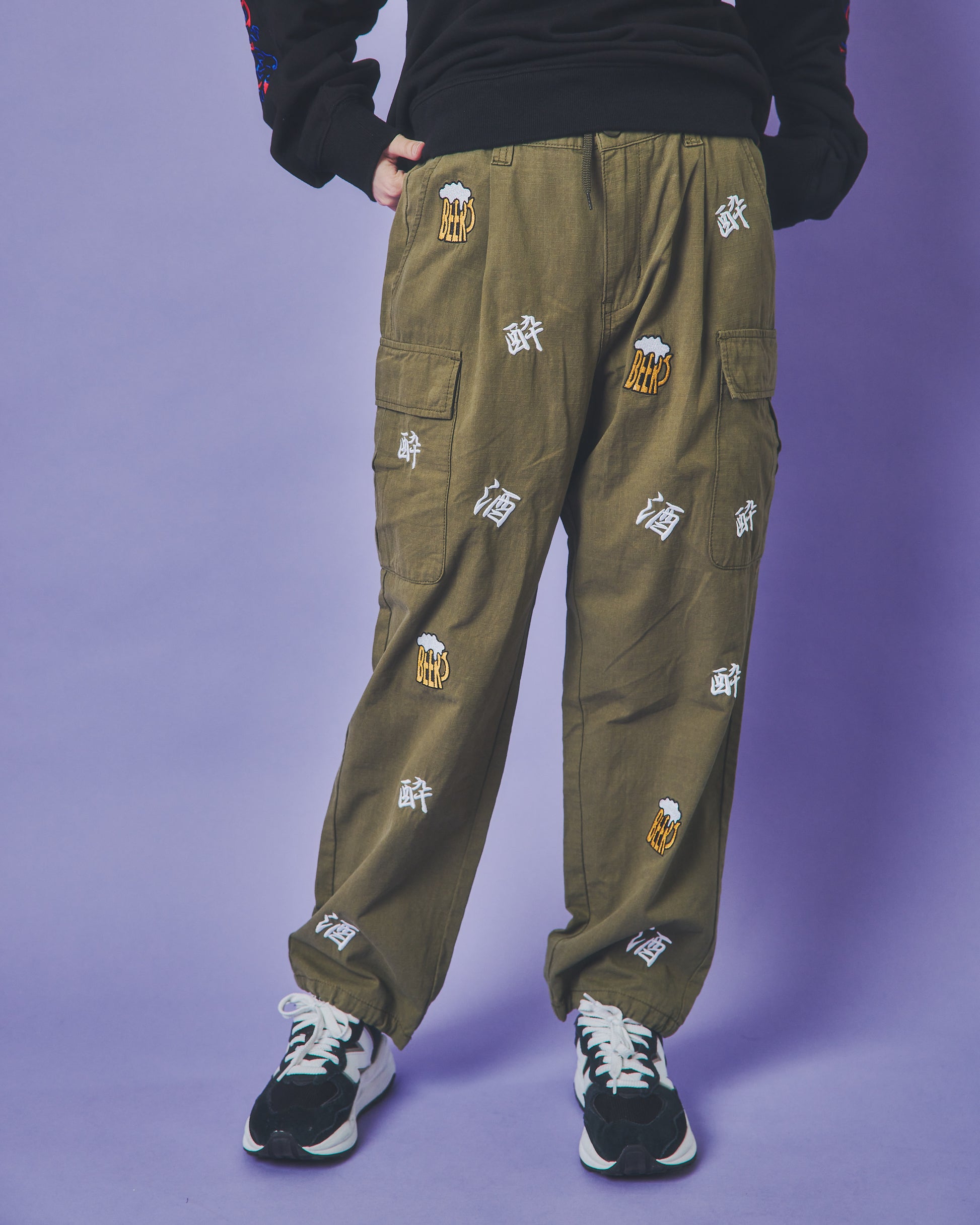 「酒」「酔」「BEER」の刺繍をランダムな総柄のように刺繍した6ポケットパンツ!
