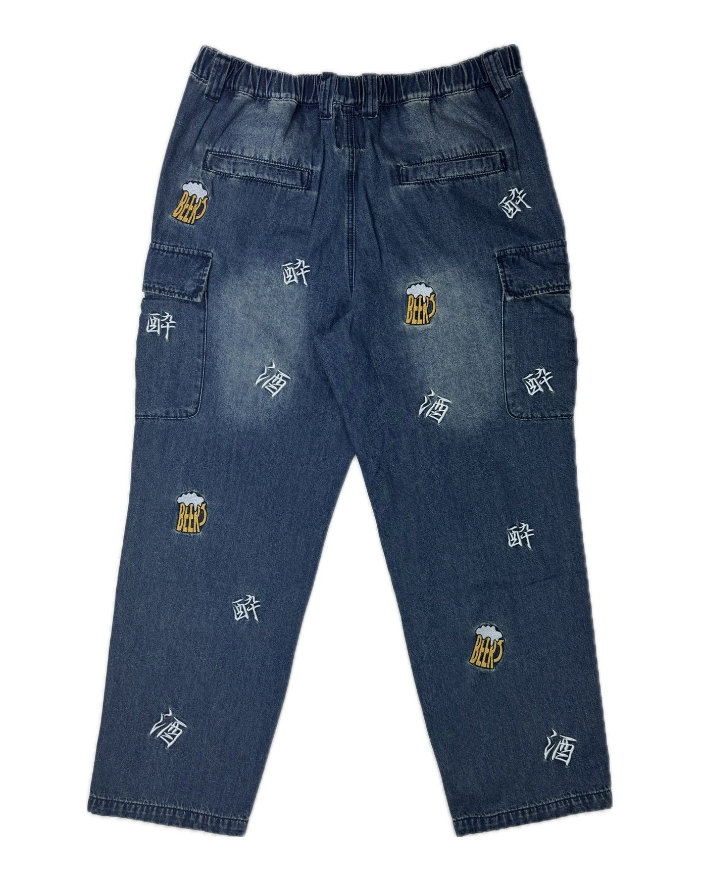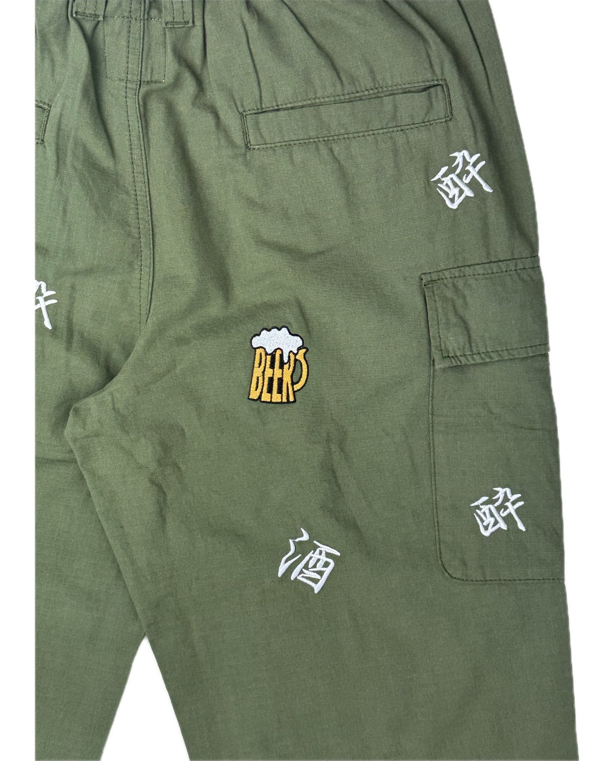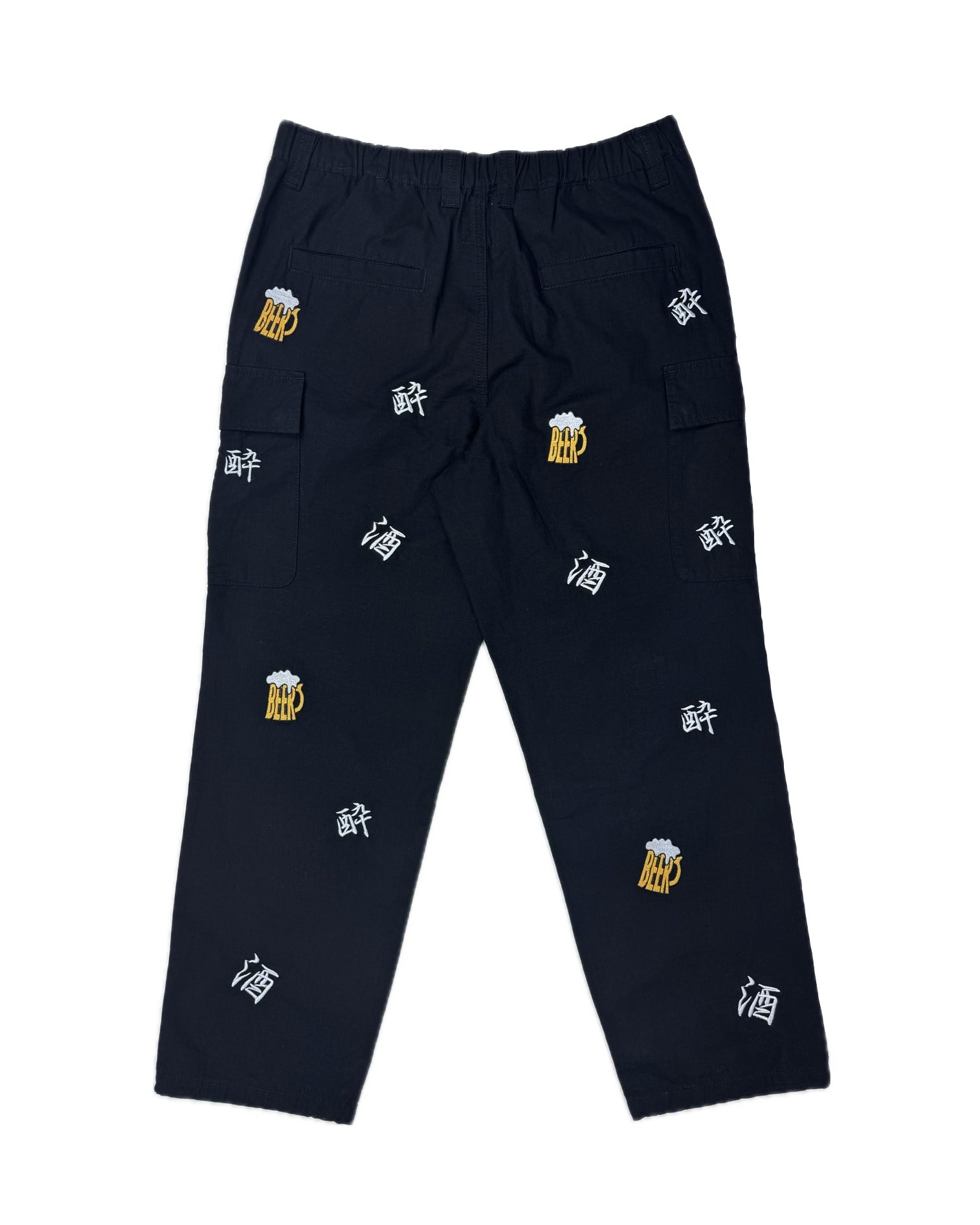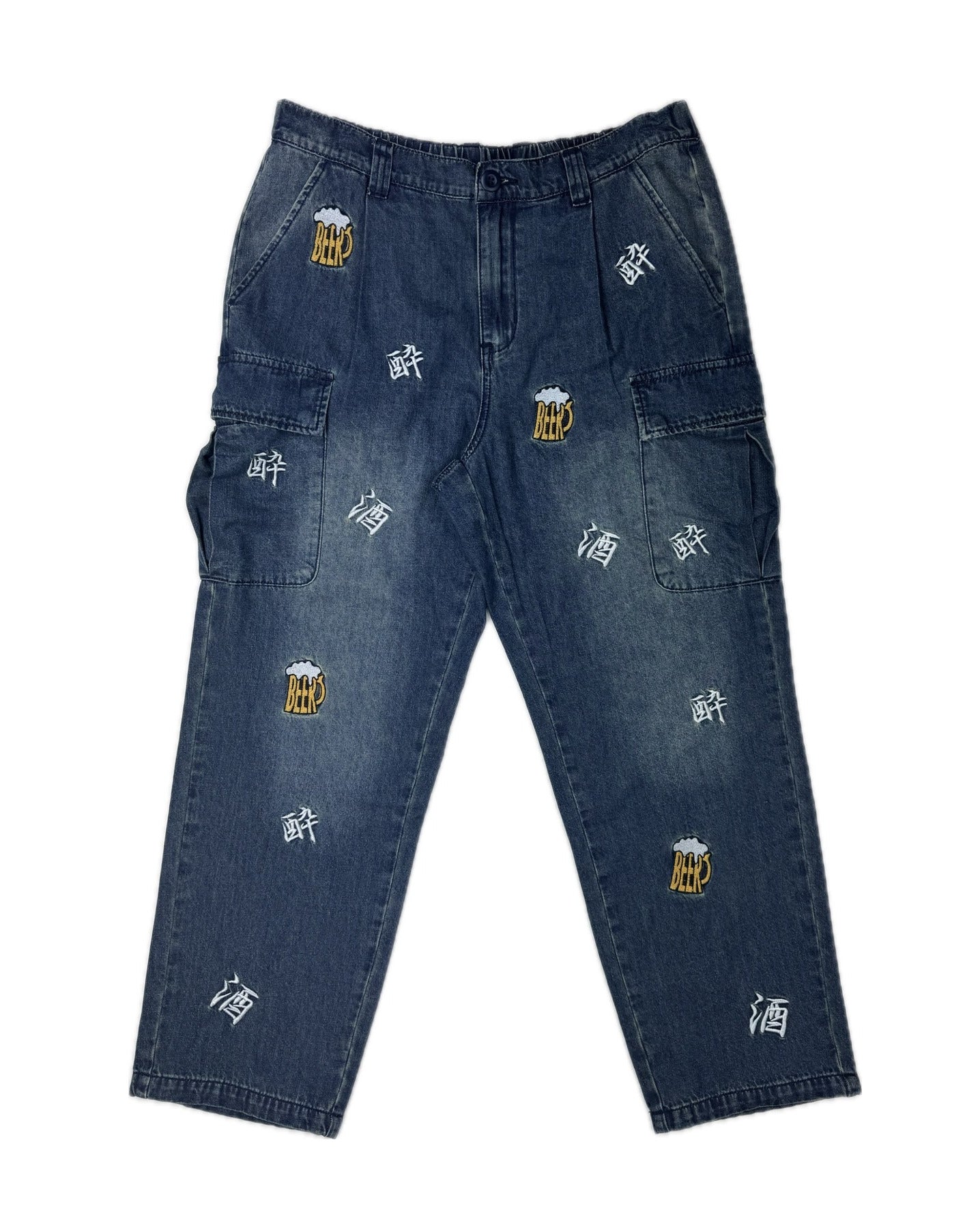 「酒」「酔」「BEER」の刺繍をランダムな総柄のように刺繍した6ポケットパンツ!