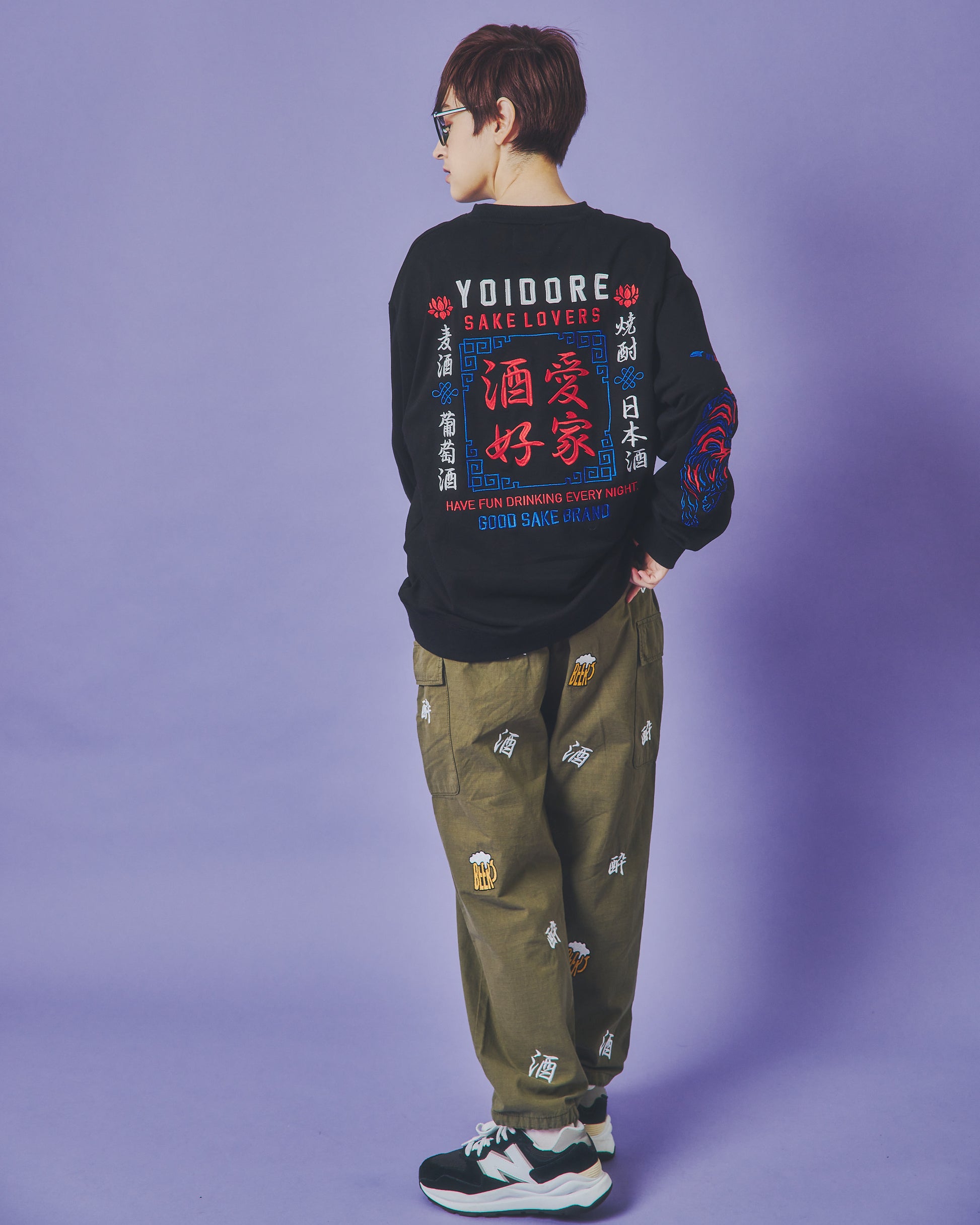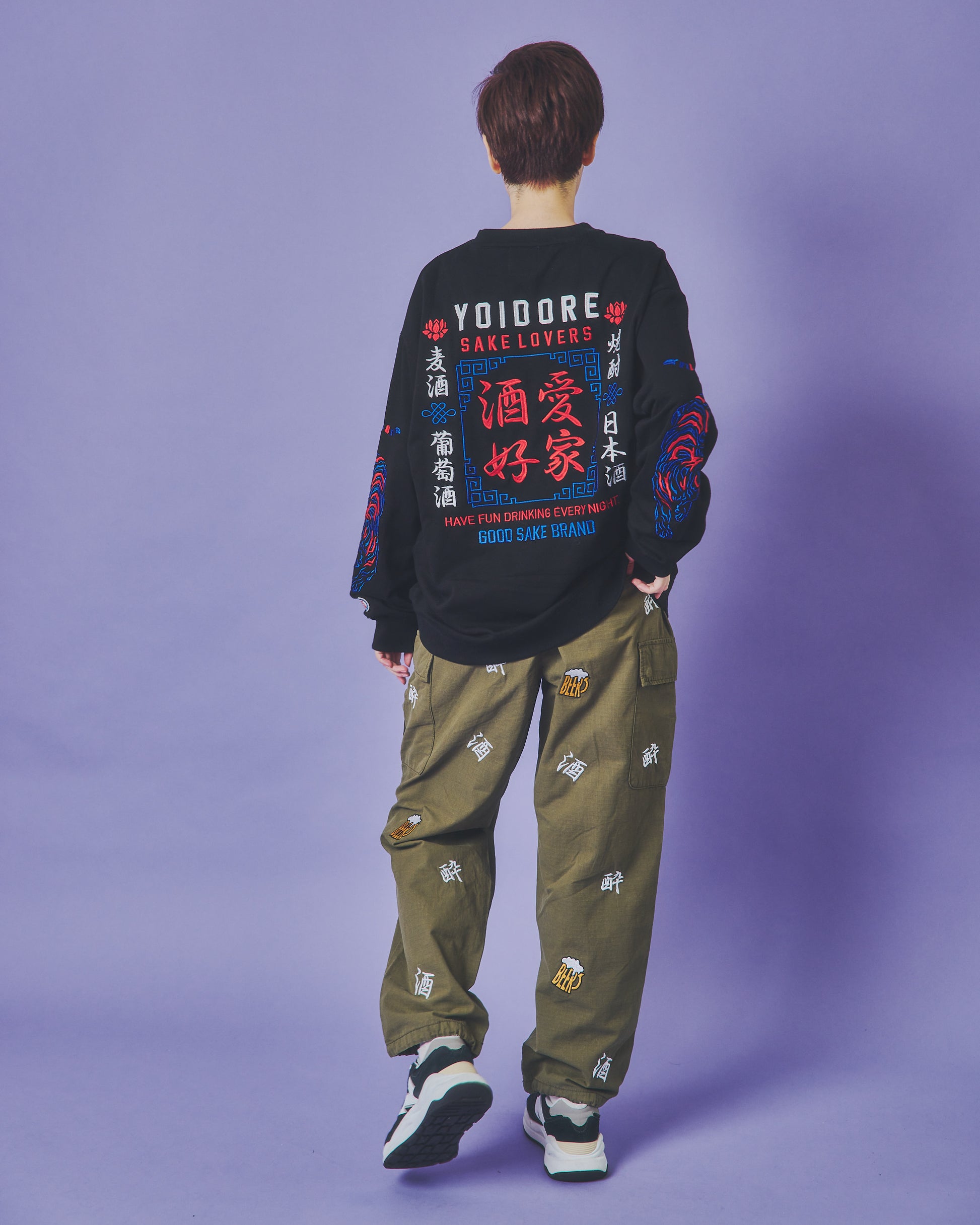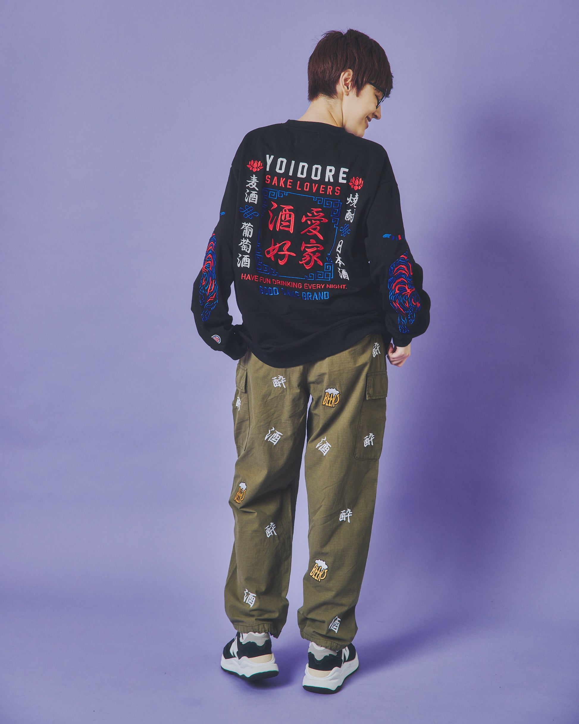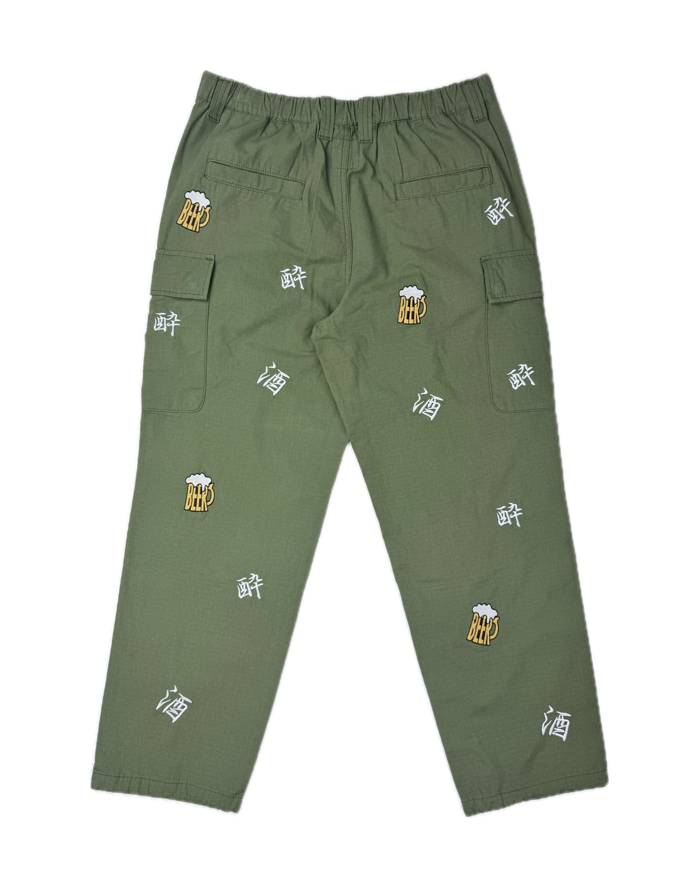 「酒」「酔」「BEER」の刺繍をランダムな総柄のように刺繍した6ポケットパンツ!