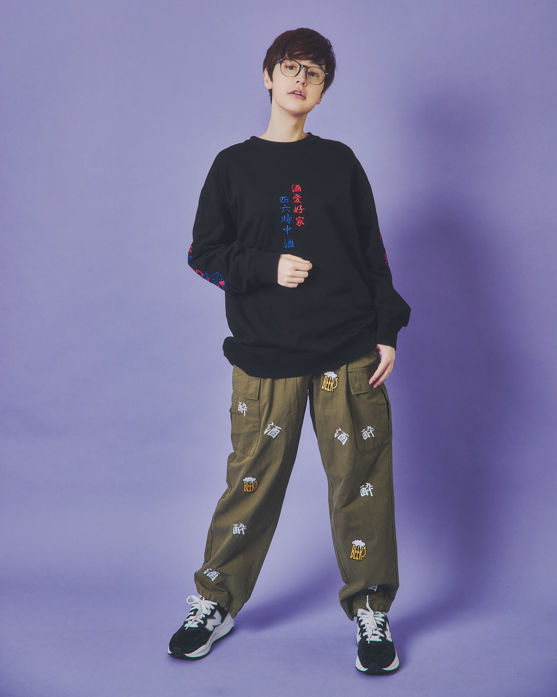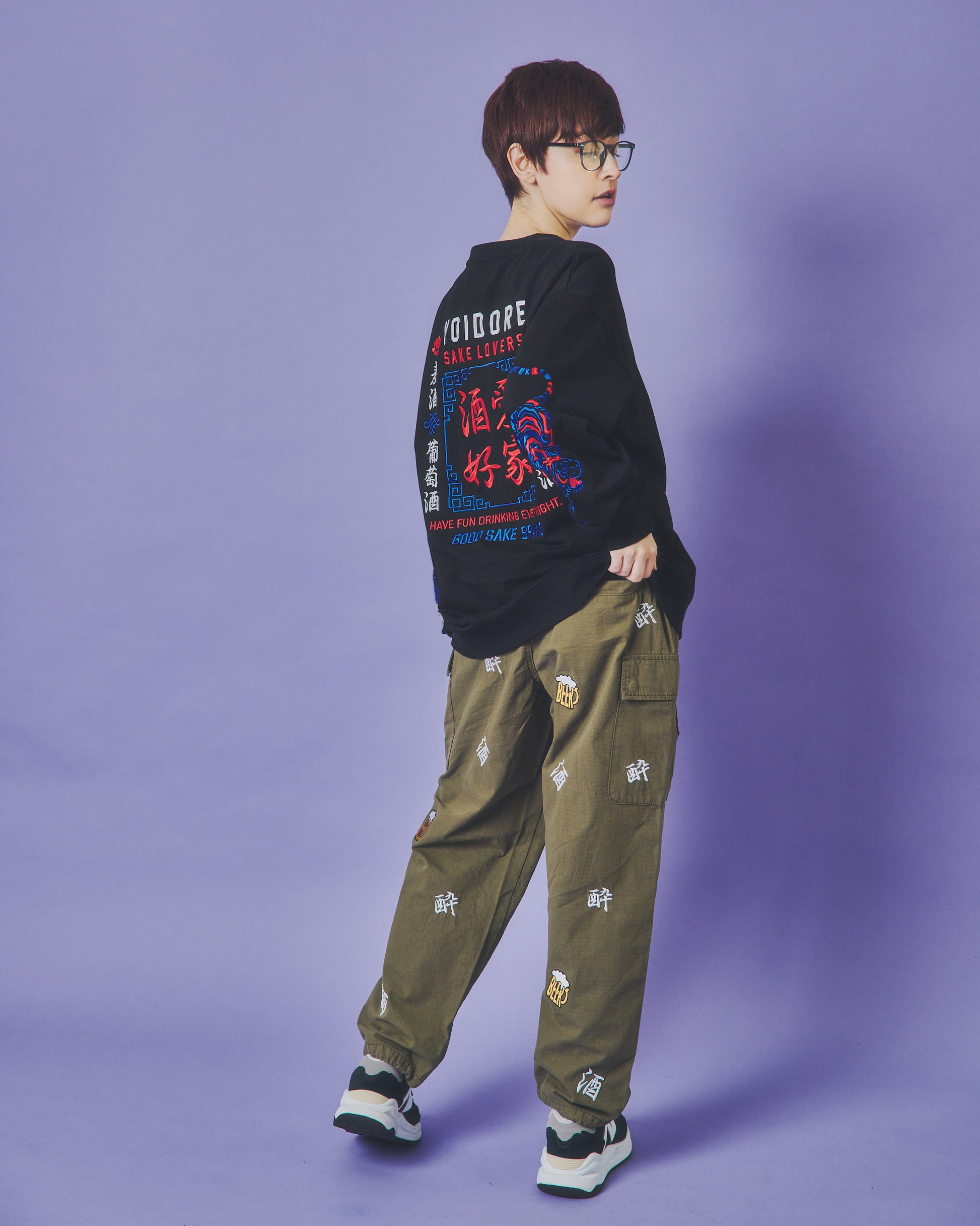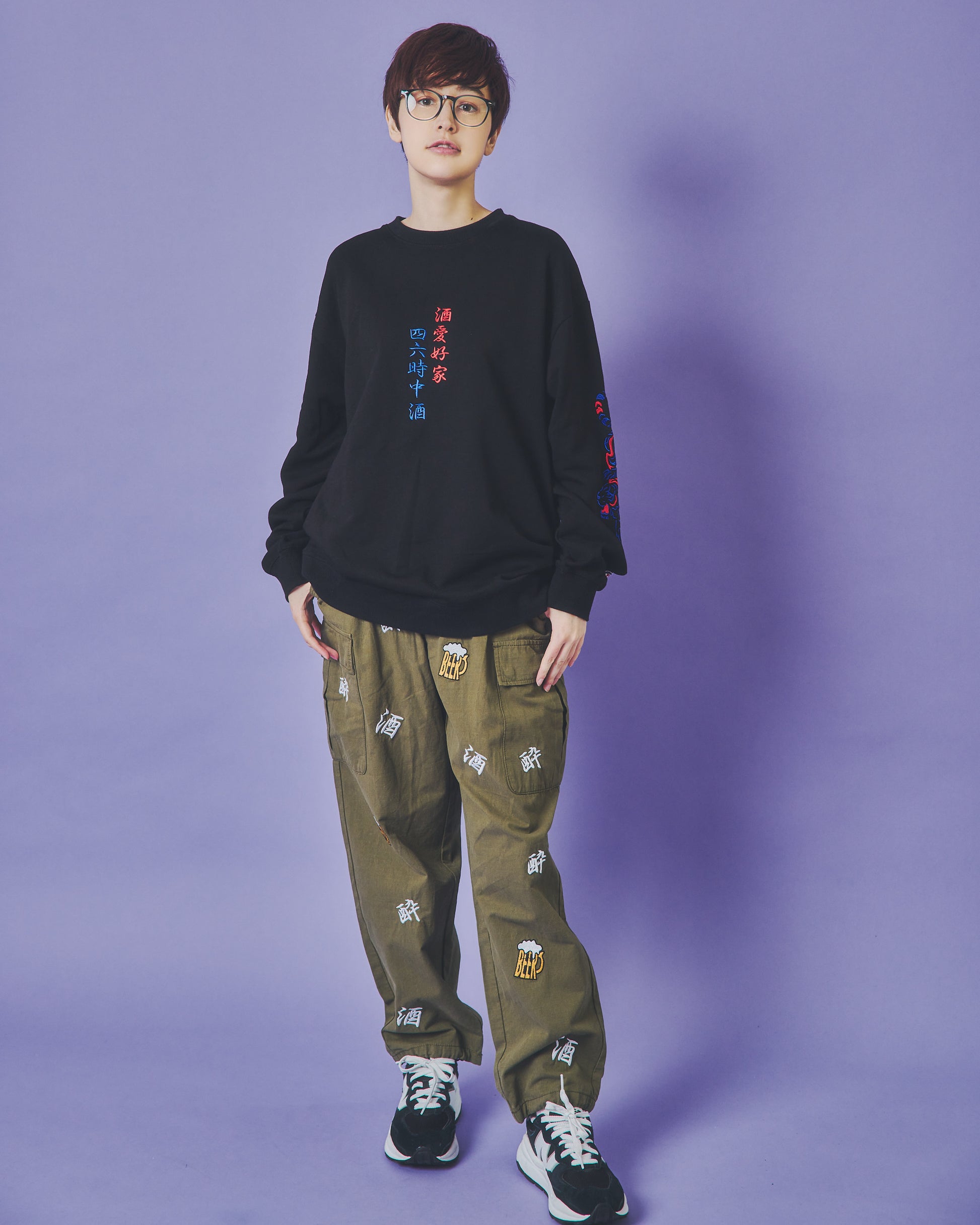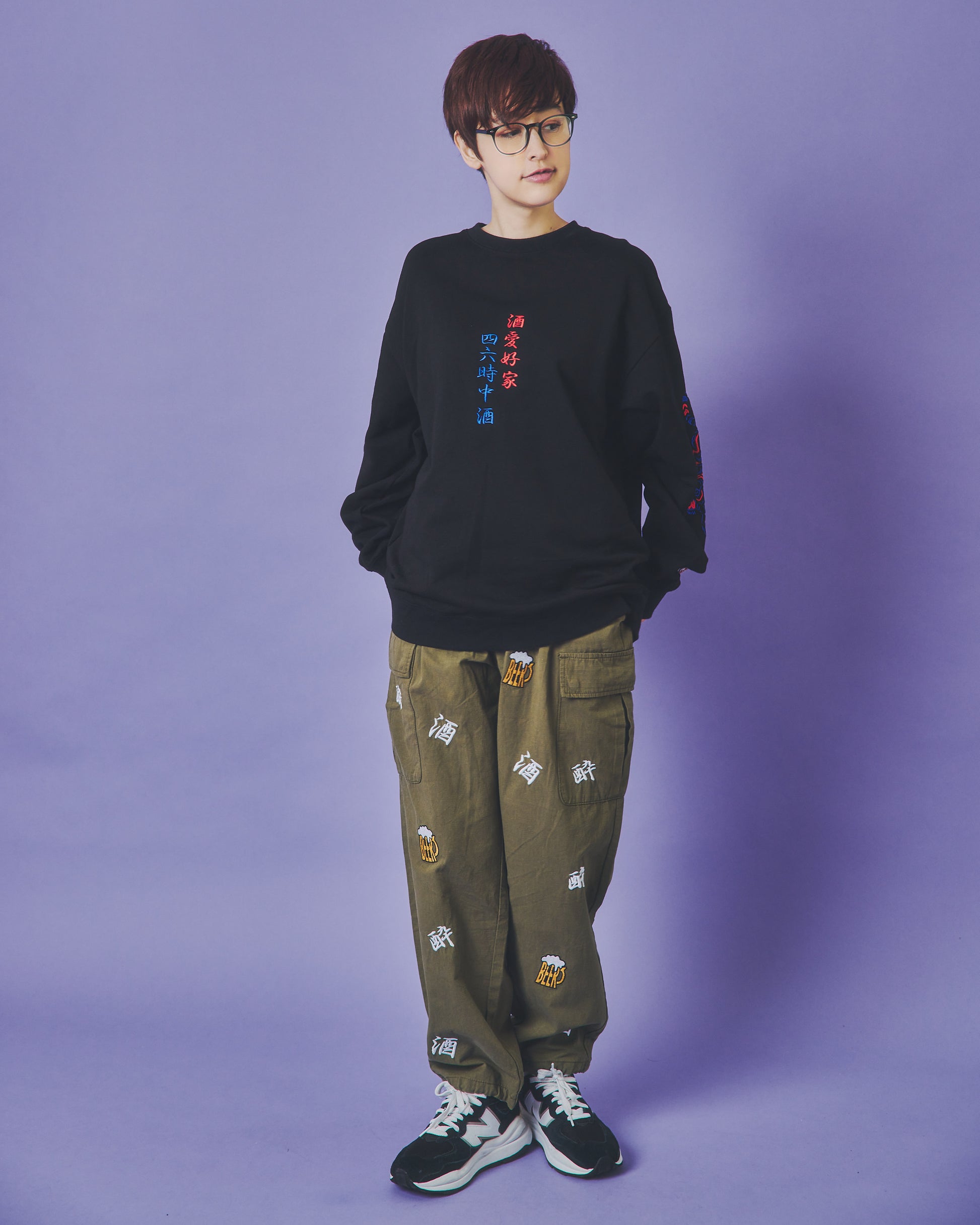 「酒」「酔」「BEER」の刺繍をランダムな総柄のように刺繍した6ポケットパンツ!