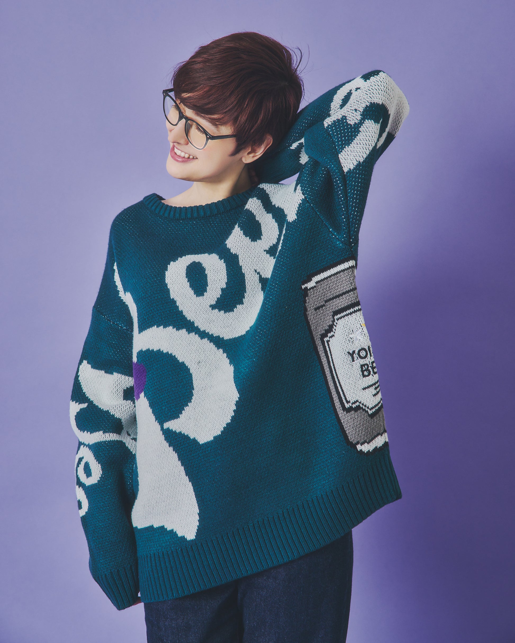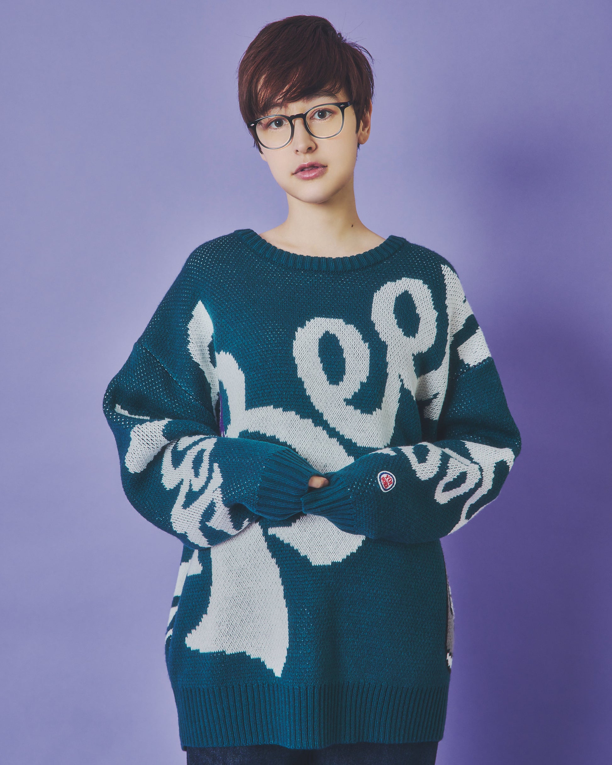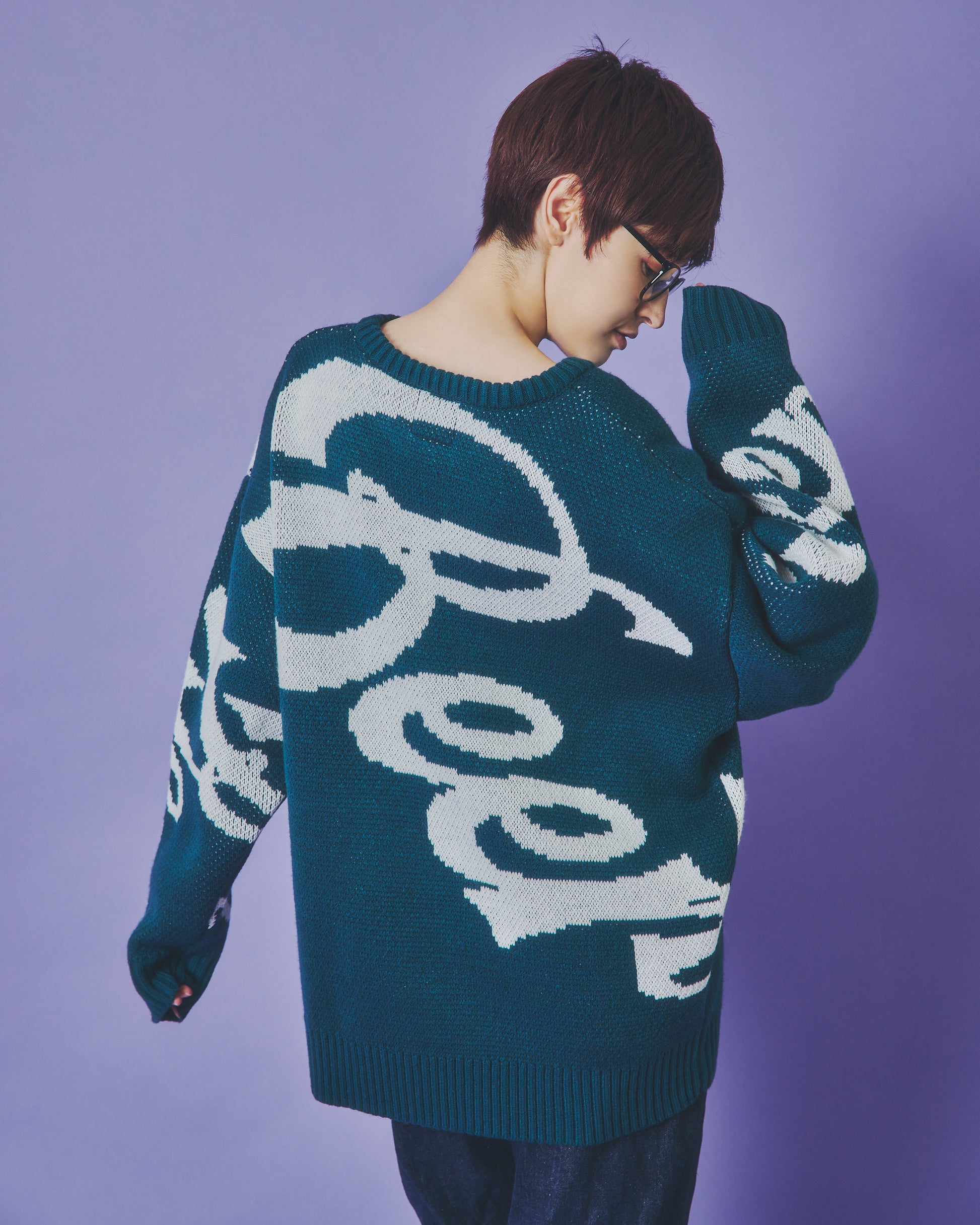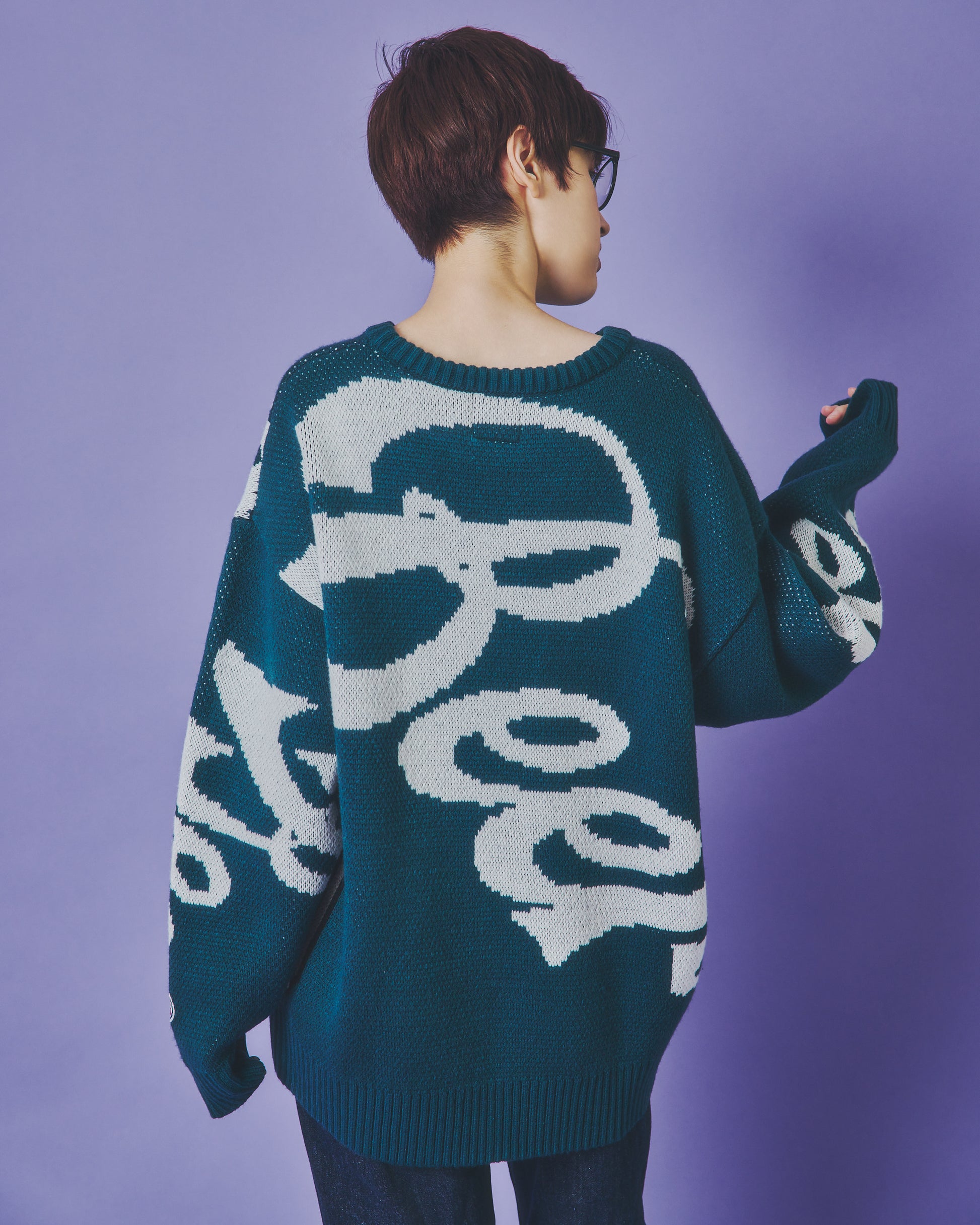 暖かみのあるニットにジャガード編みで表現したグラフィックはプリントや刺繍とは違った柔らかさがあり、エッジの効いたデザインもソフトな印象に。