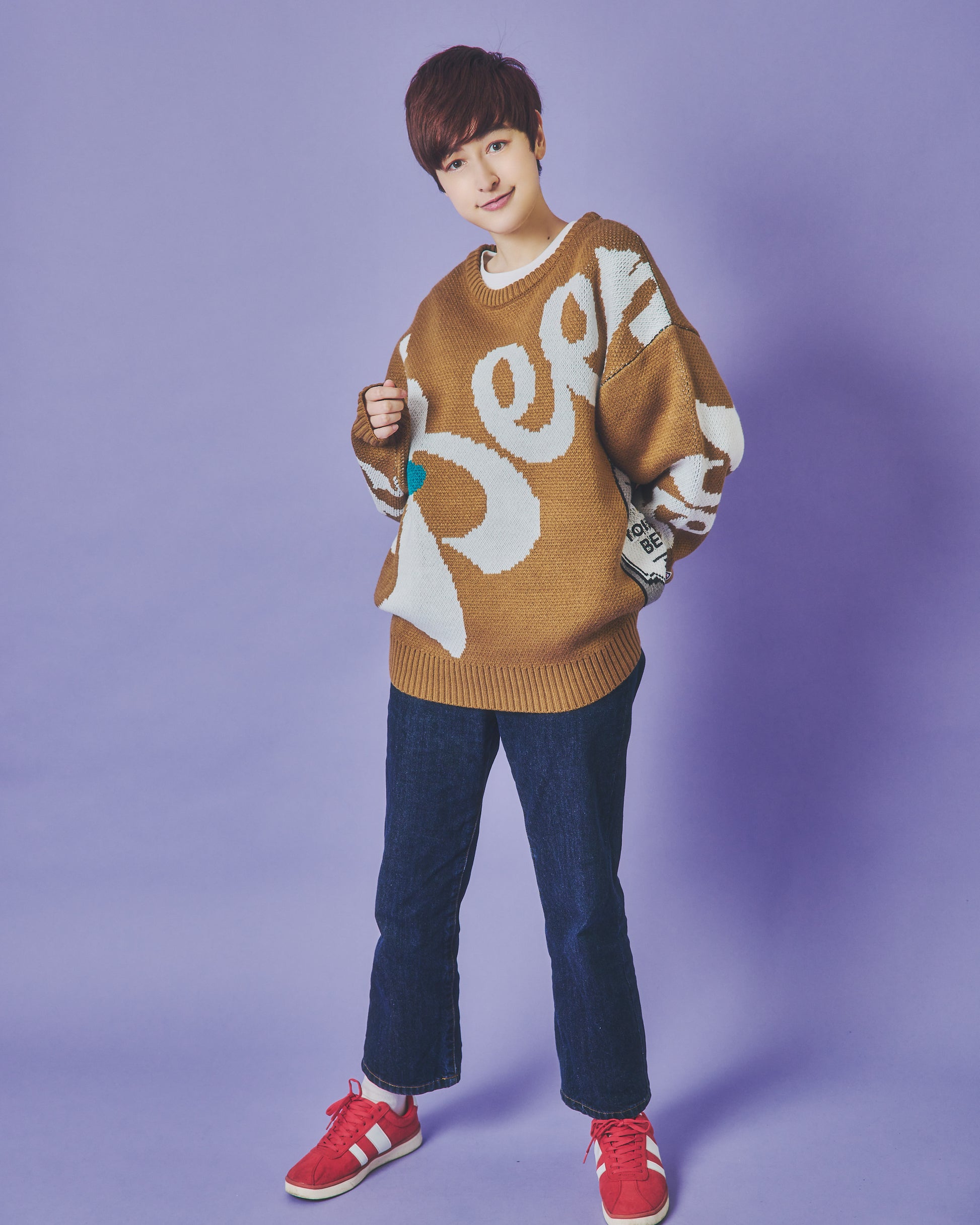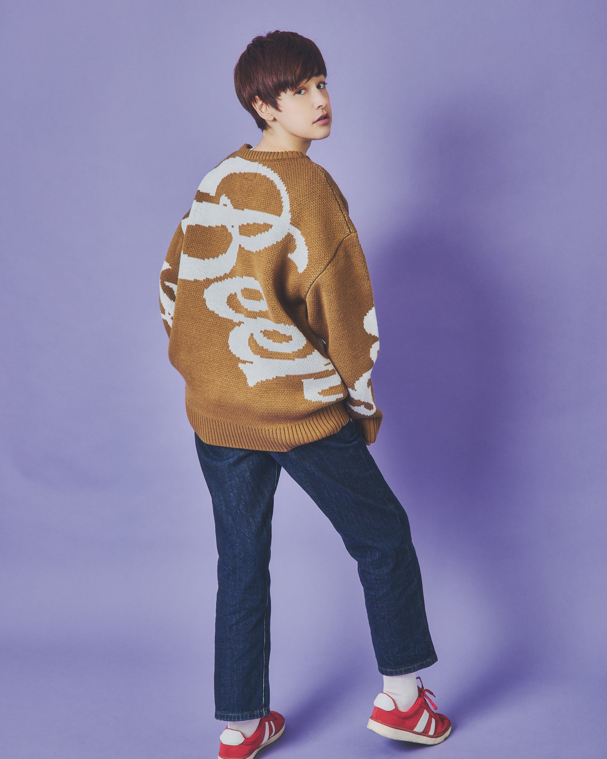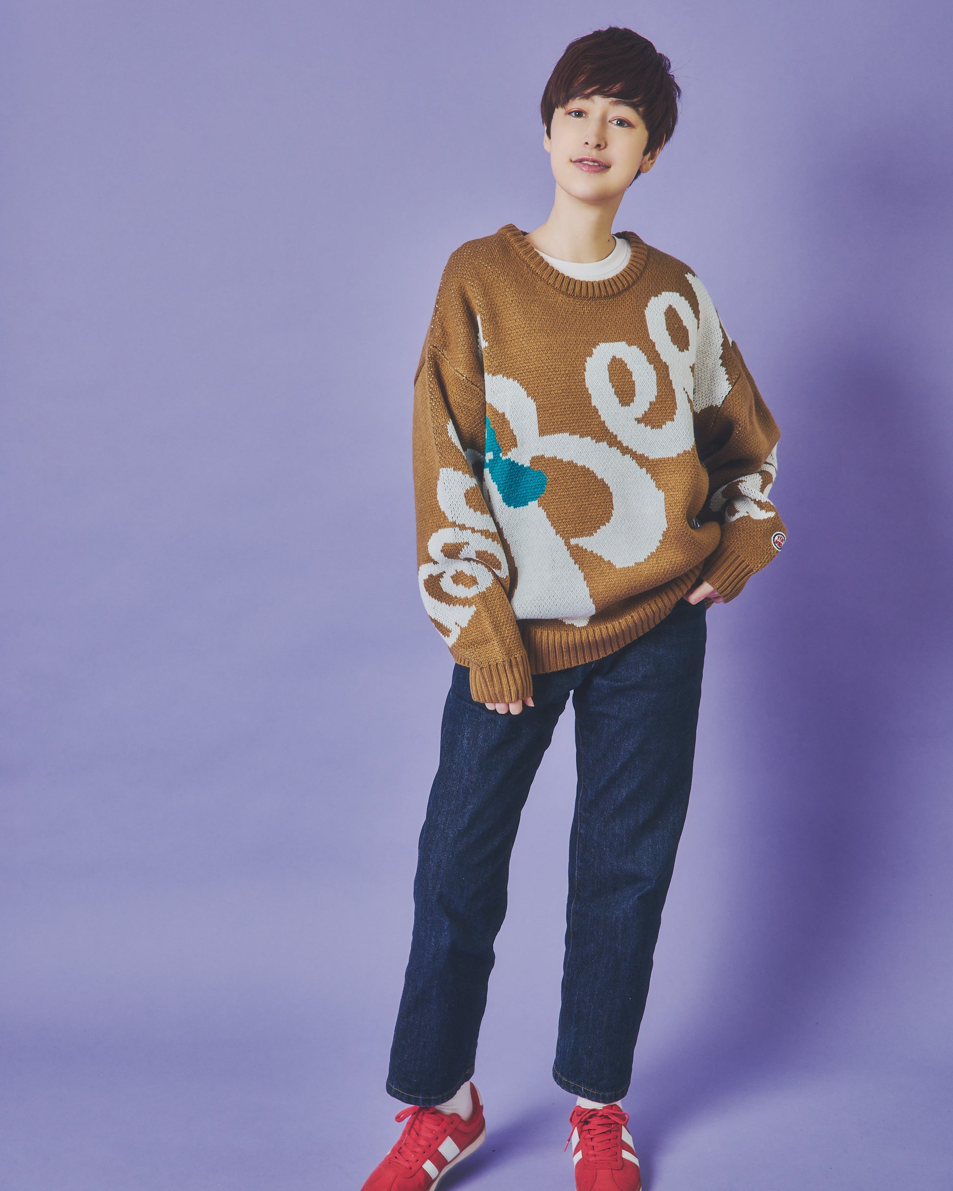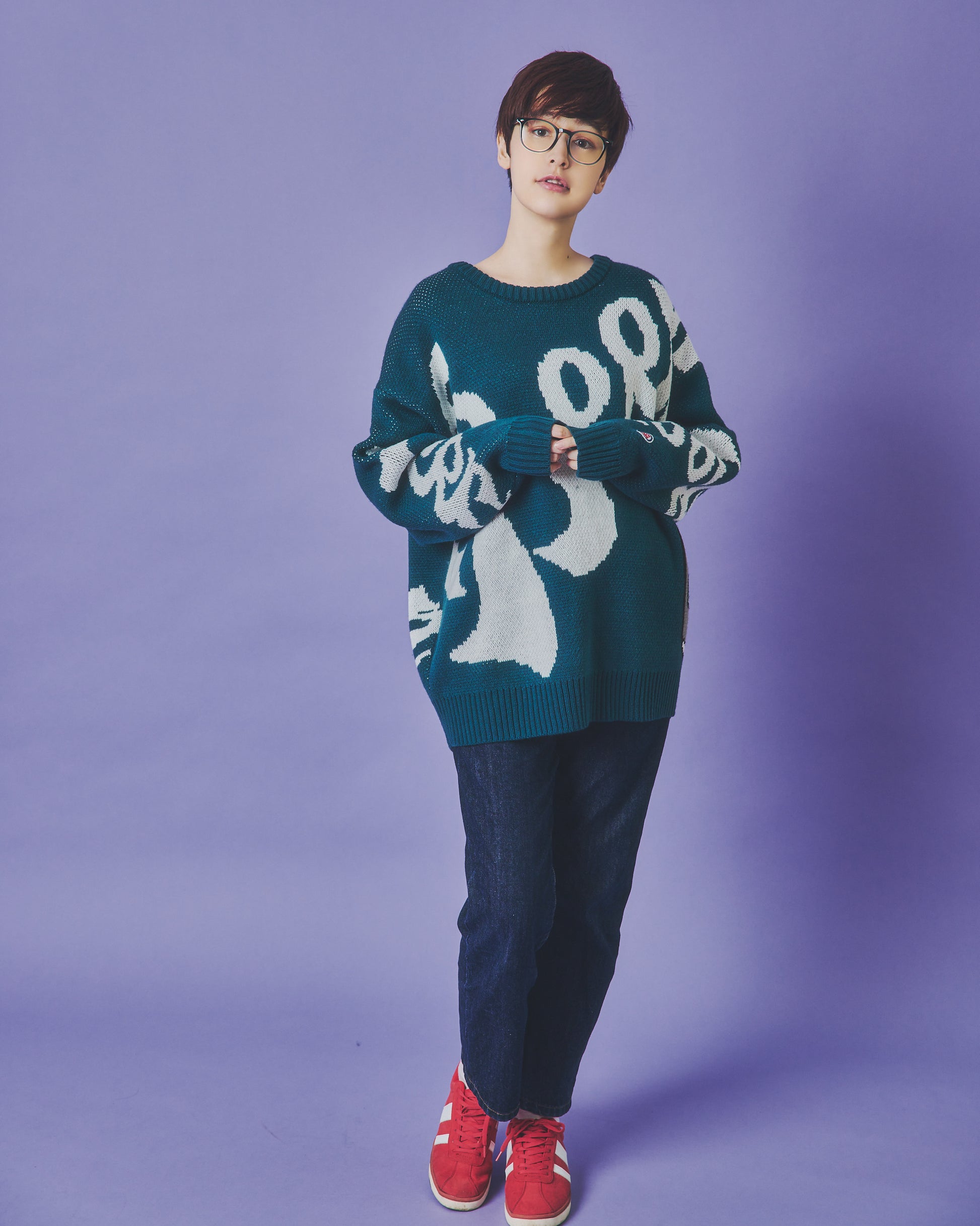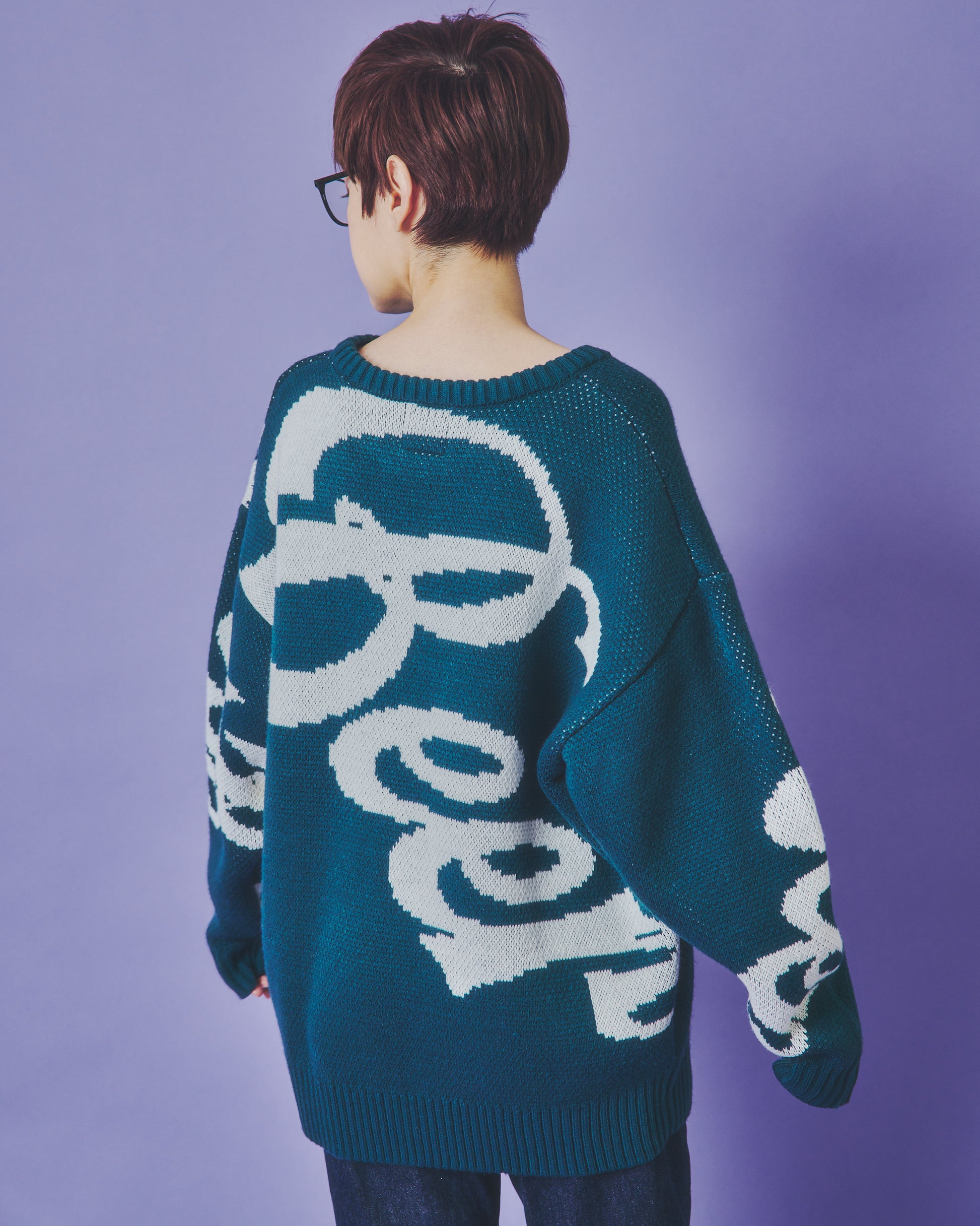 暖かみのあるニットにジャガード編みで表現したグラフィックはプリントや刺繍とは違った柔らかさがあり、エッジの効いたデザインもソフトな印象に。