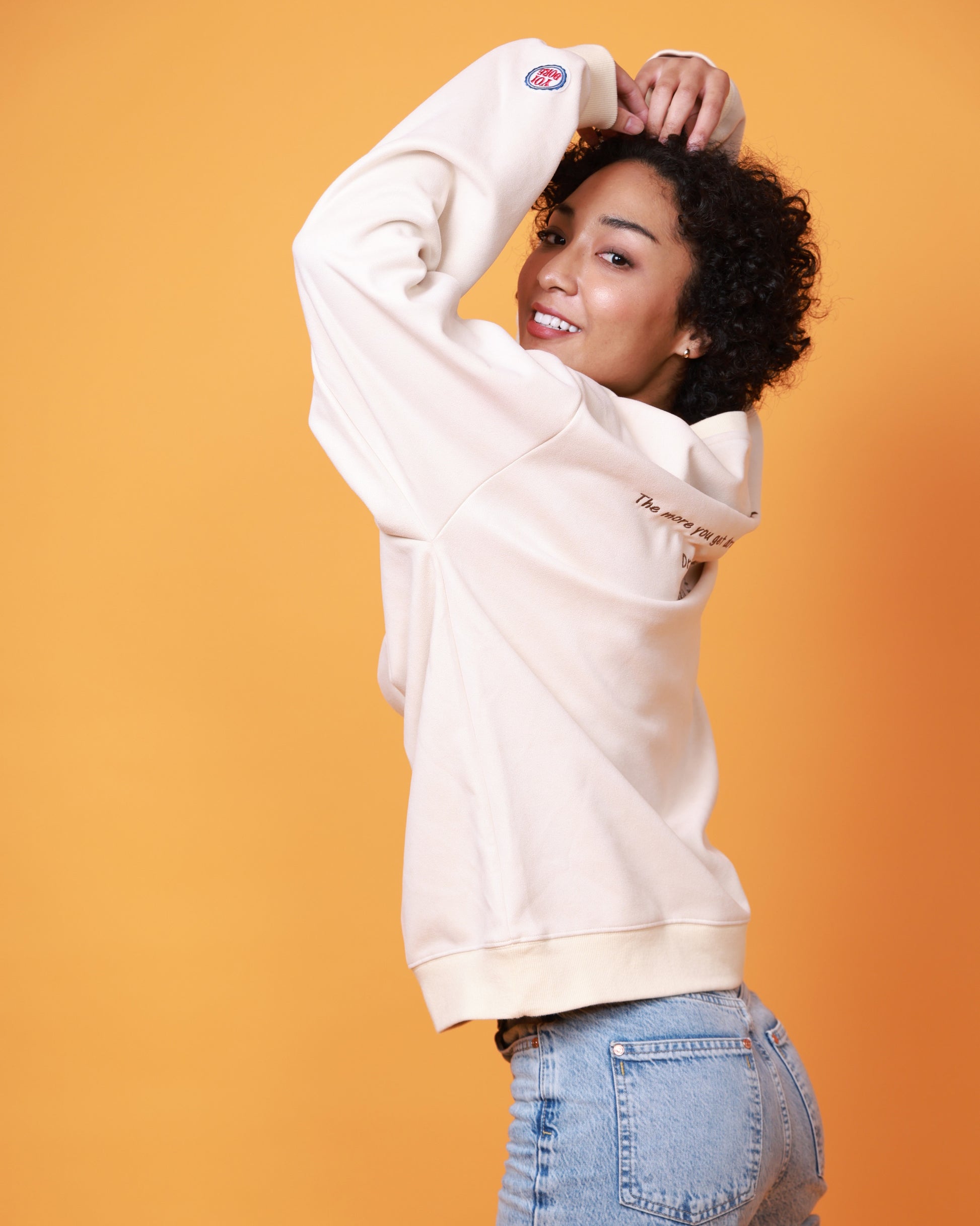 ボディは滑らかな風合いのフェイクスエード生地を採用し、ただのスウェットとは一味違った高級感があります。