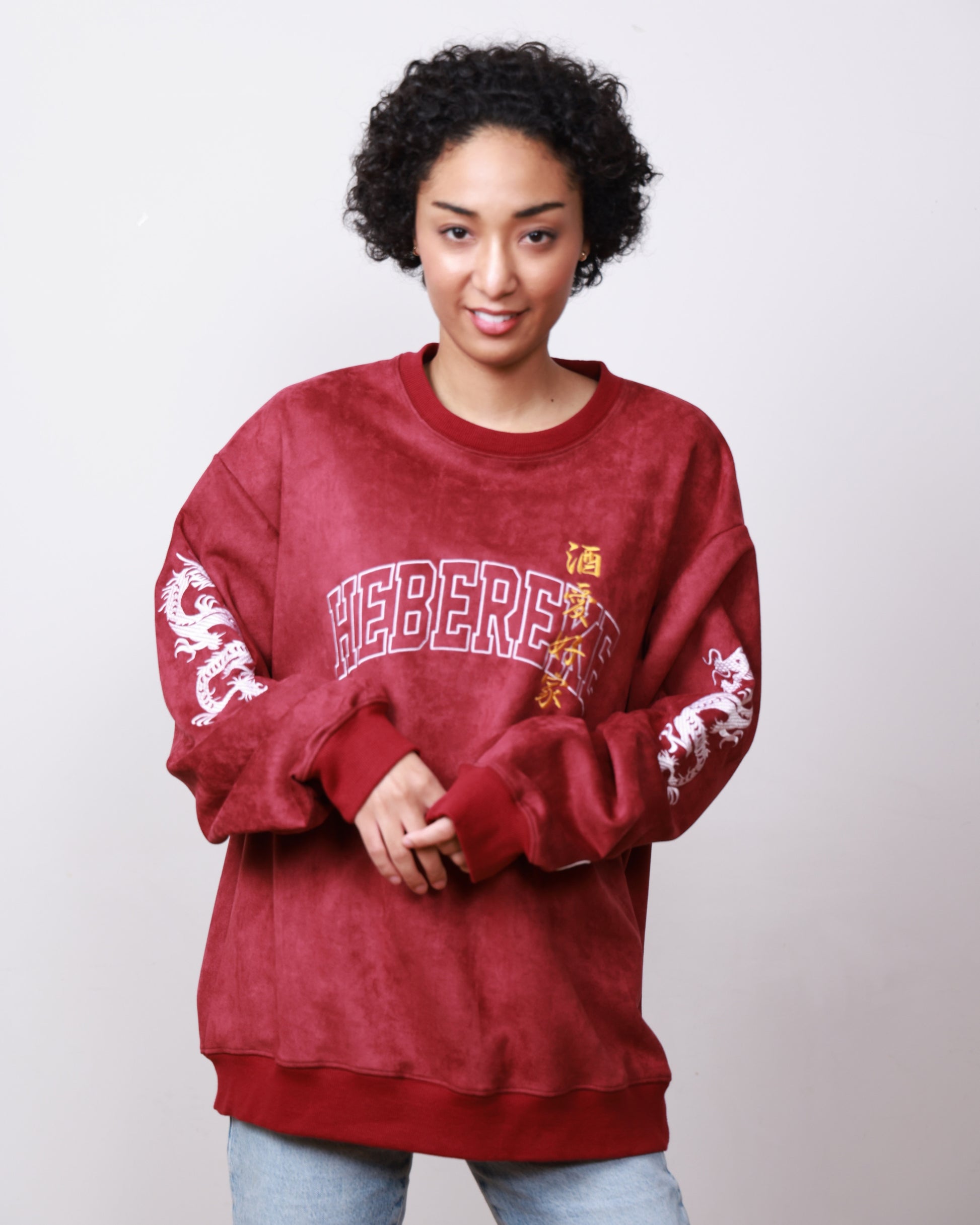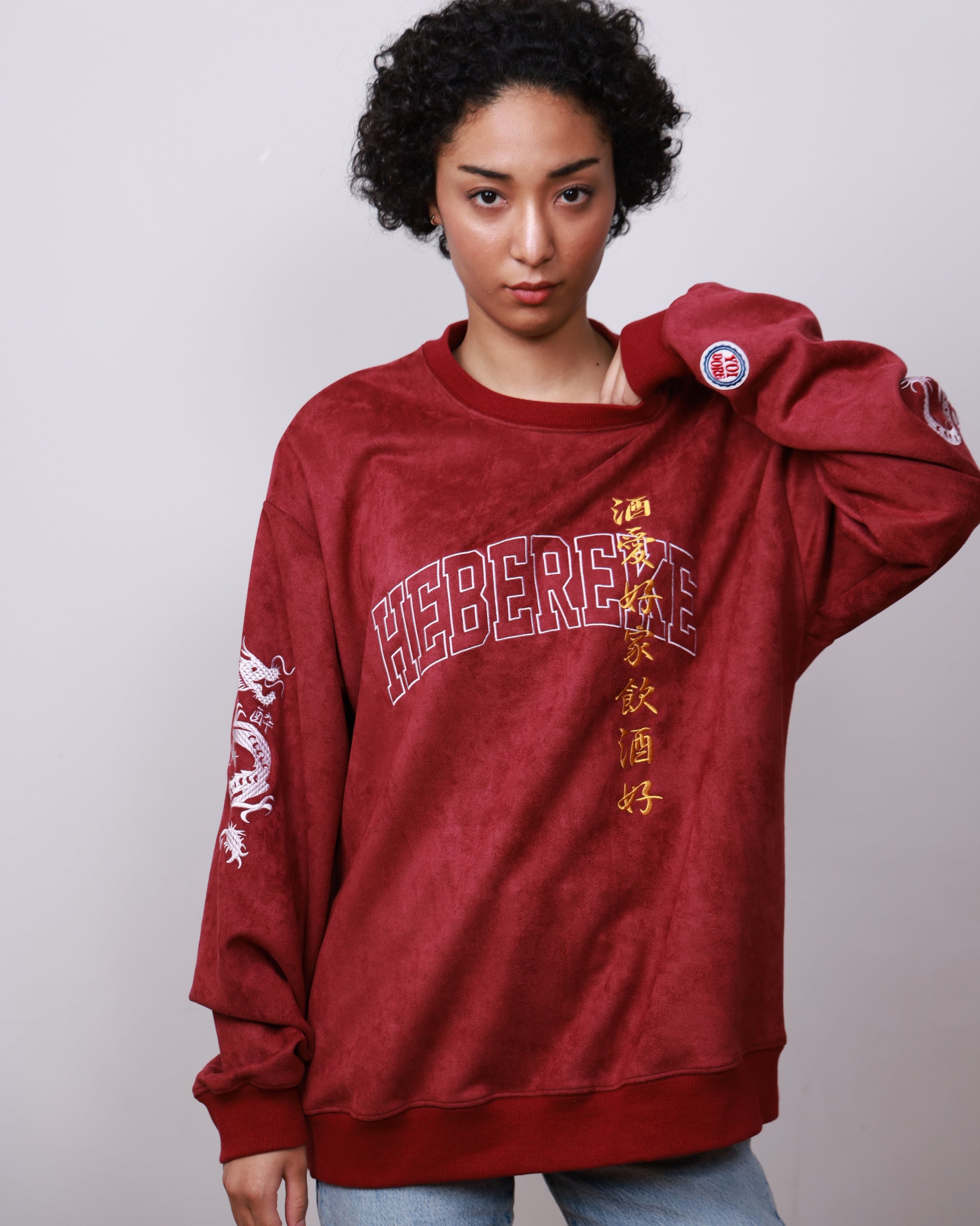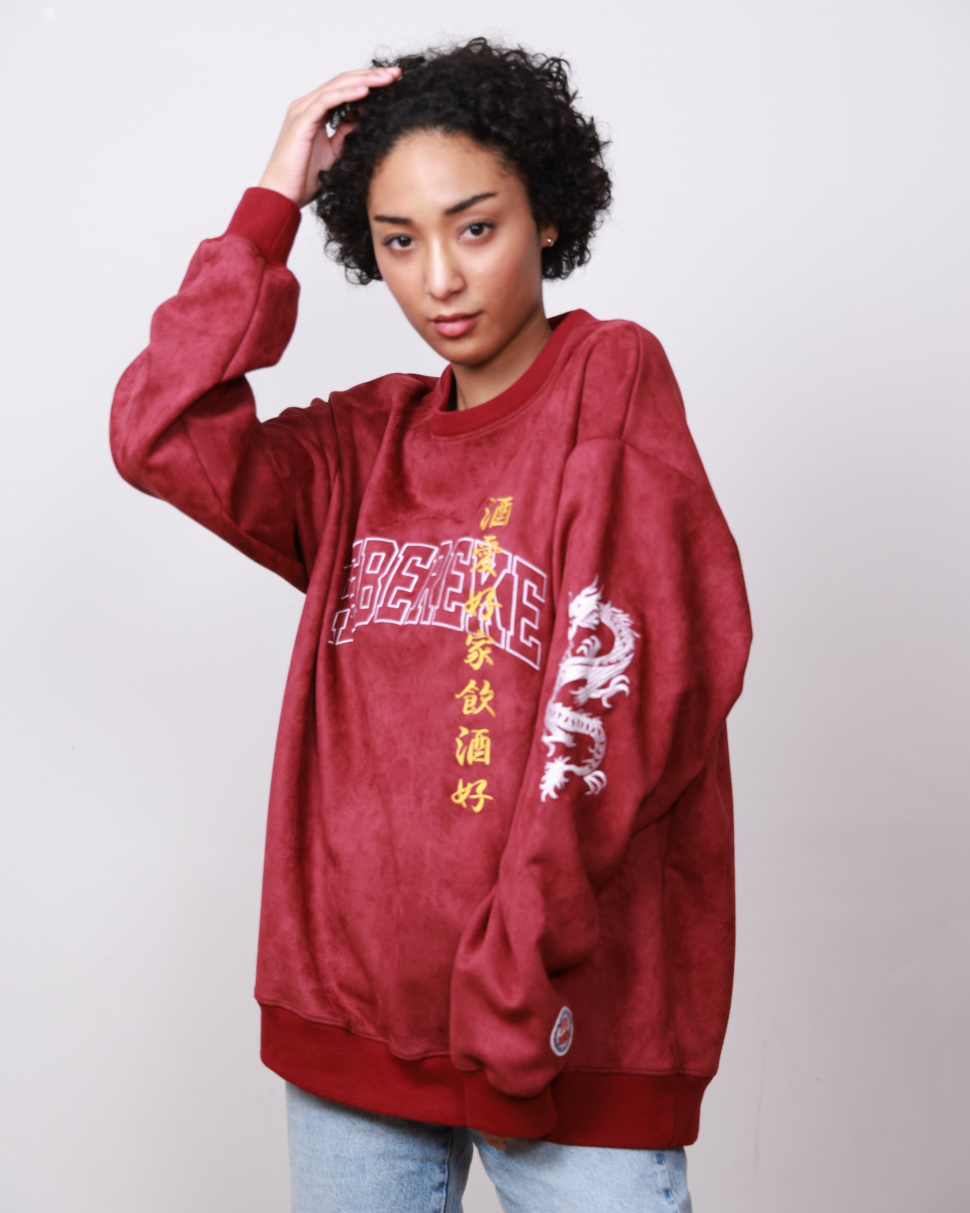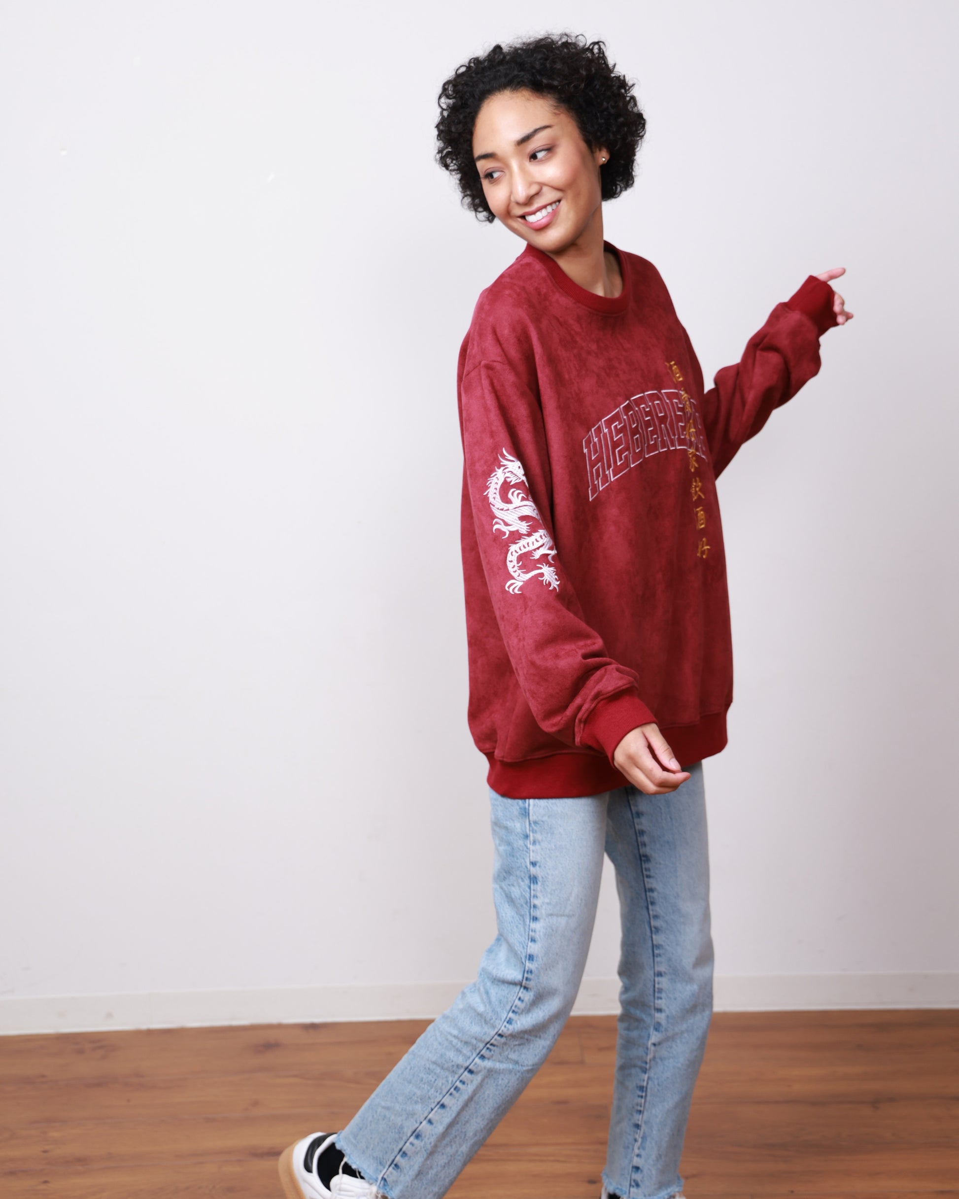 ボディは滑らかな風合いのフェイクスエード生地を採用し、ただのスウェットとは一味違った高級感があります。