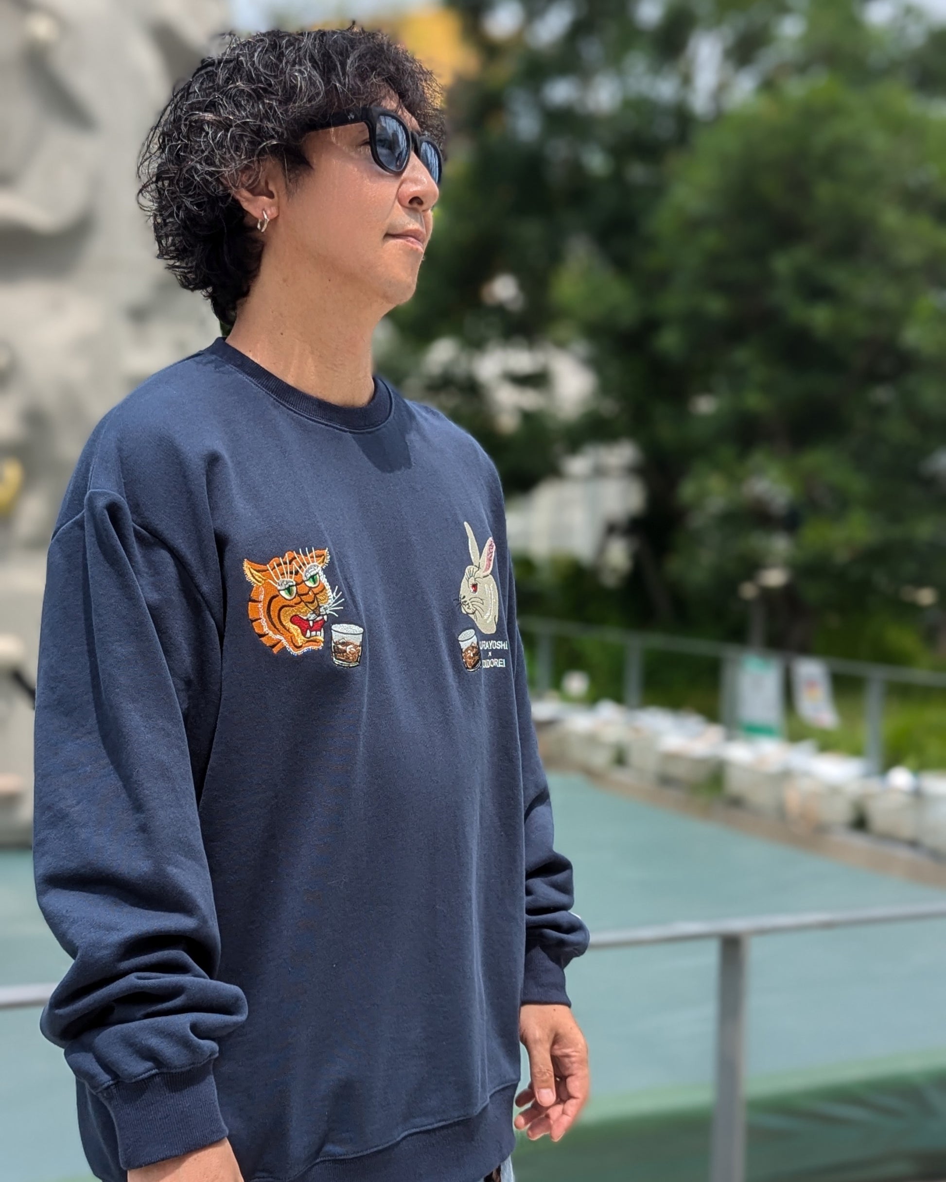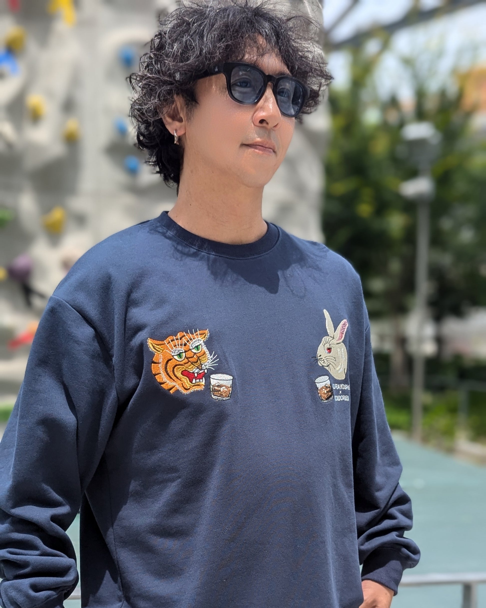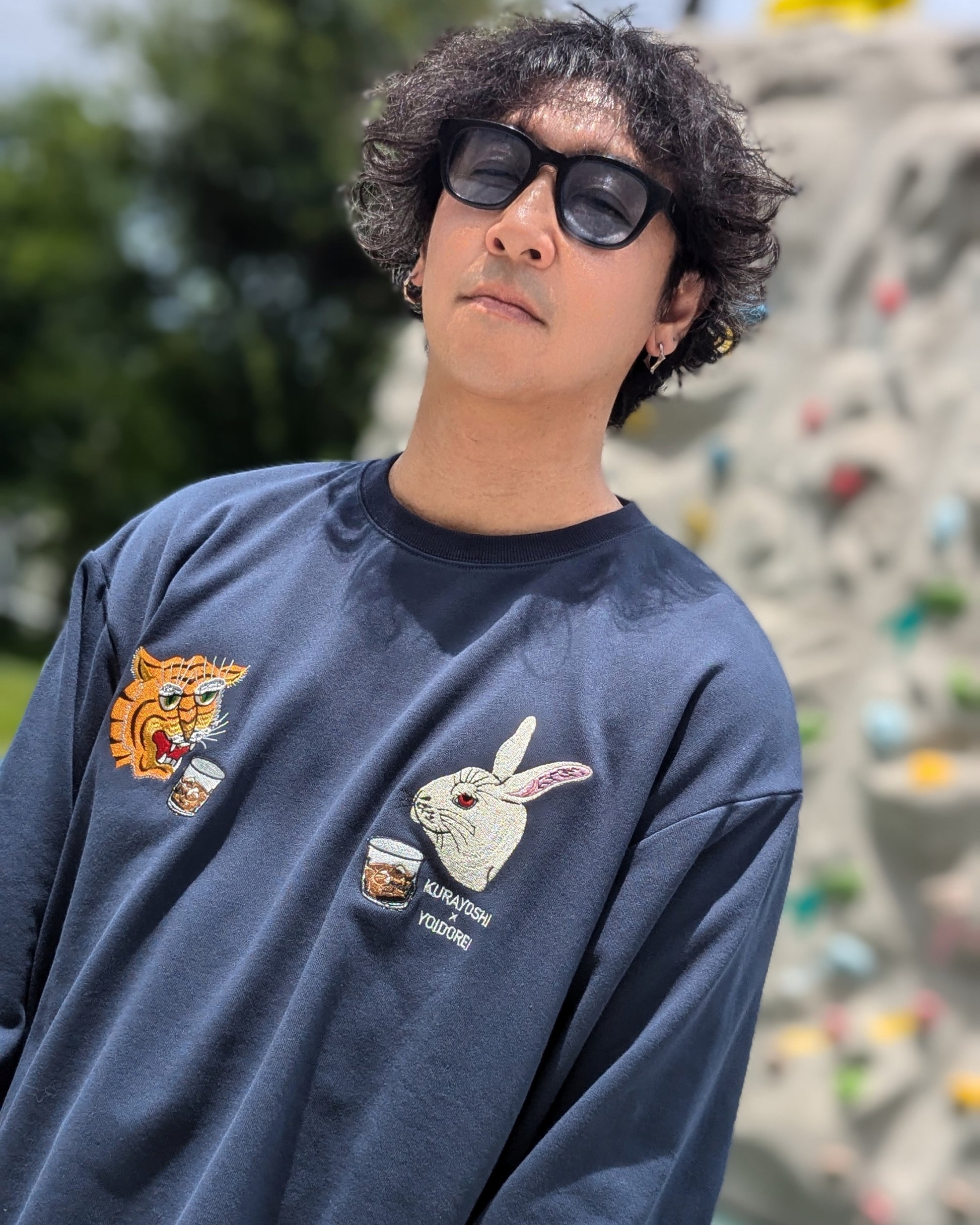 フロントの右胸にはYOIDOREのイメージアニマル酔虎、左胸には鳥取にある白兎神社や松井酒造合名会社で展開している白兎というジンにちなんでウサギの刺繍を施しています。