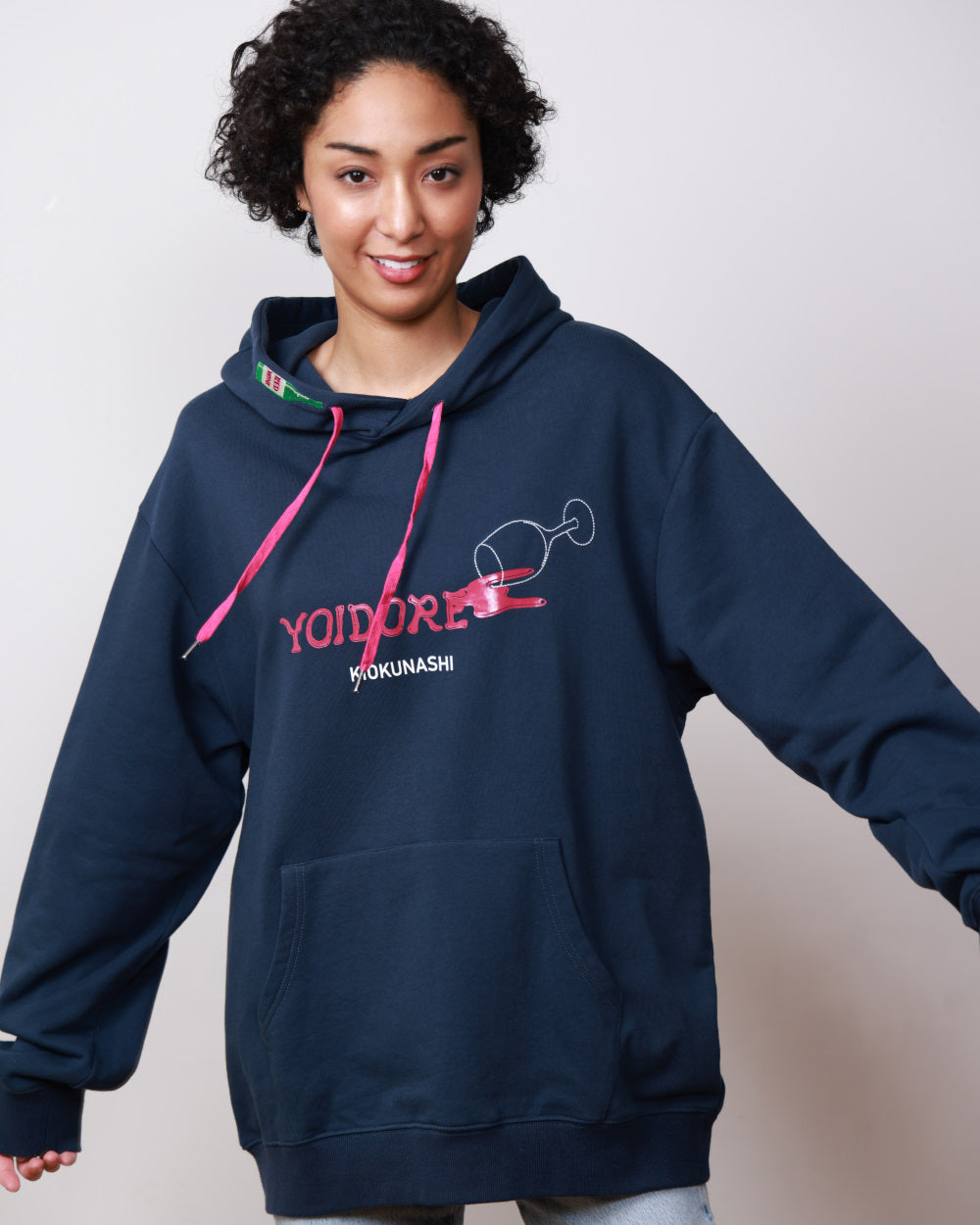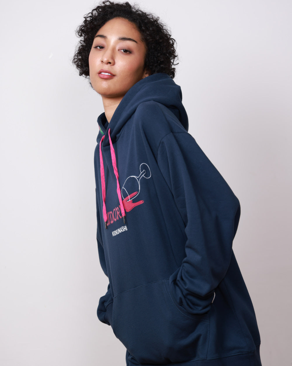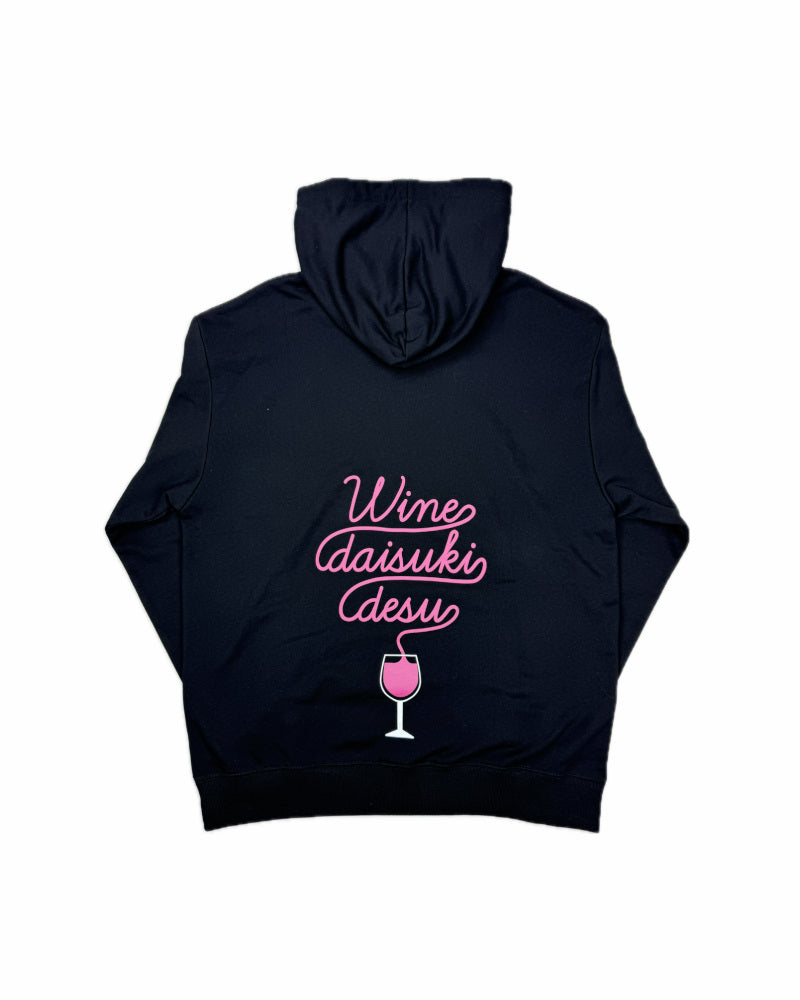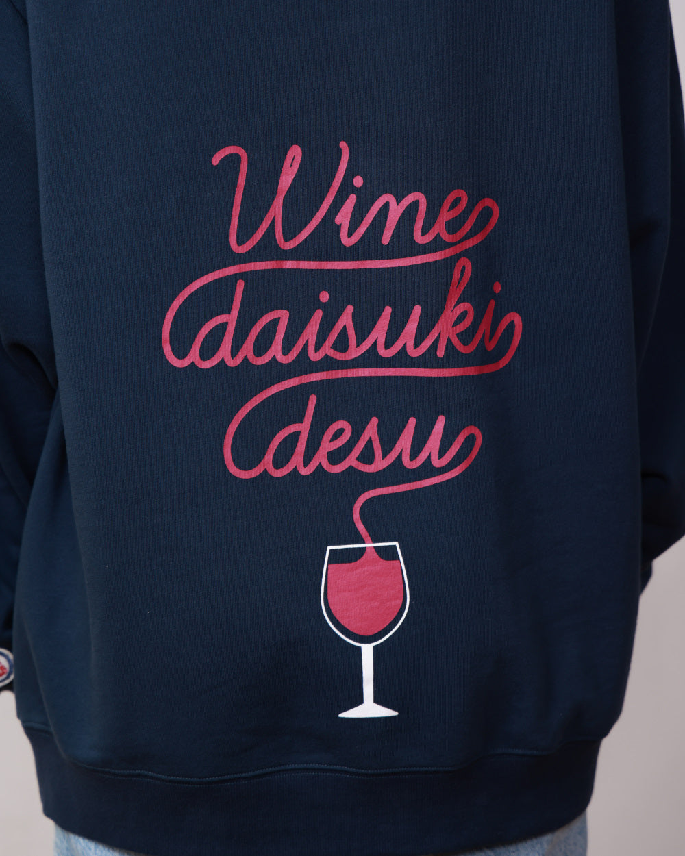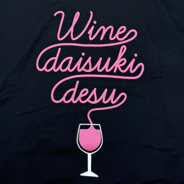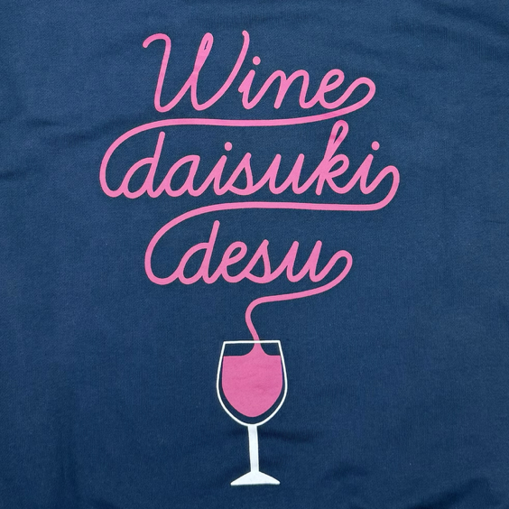 フロントのグラスは刺繍、こぼれたワインYOIDOREロゴはジェルプリントで液体感を表現しています。