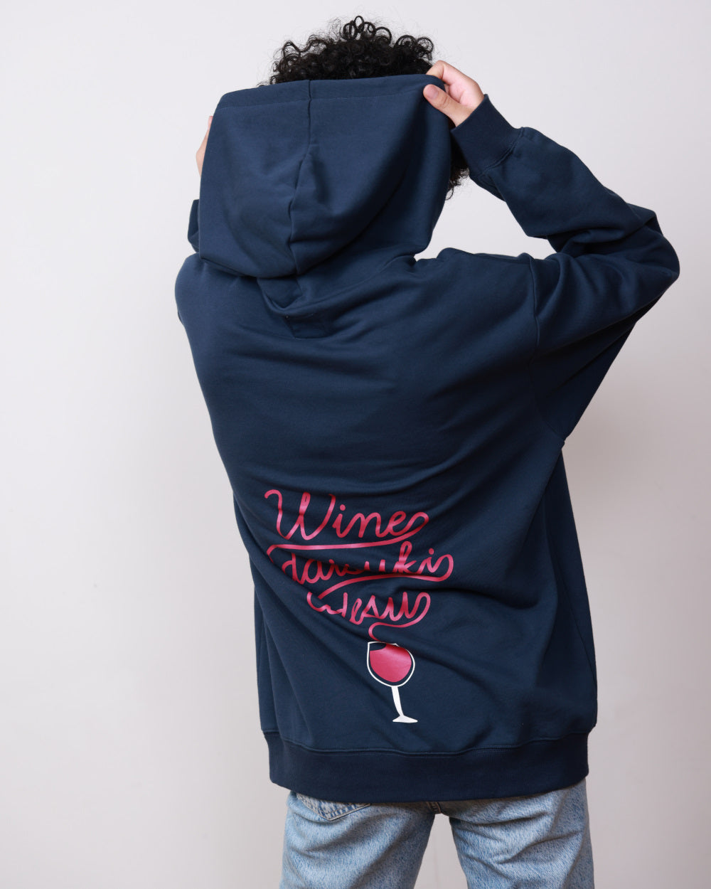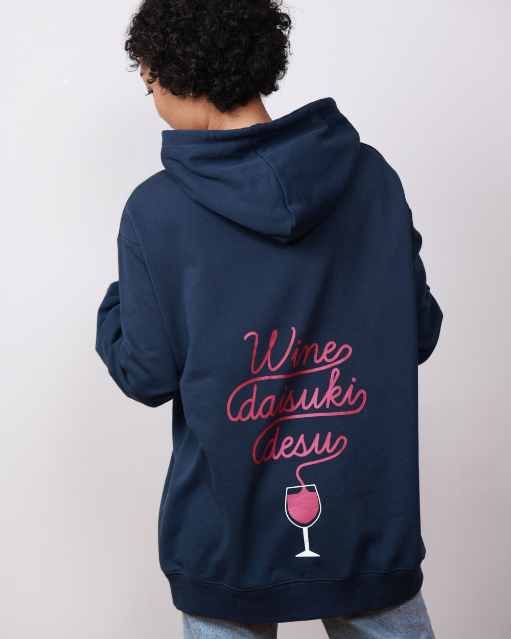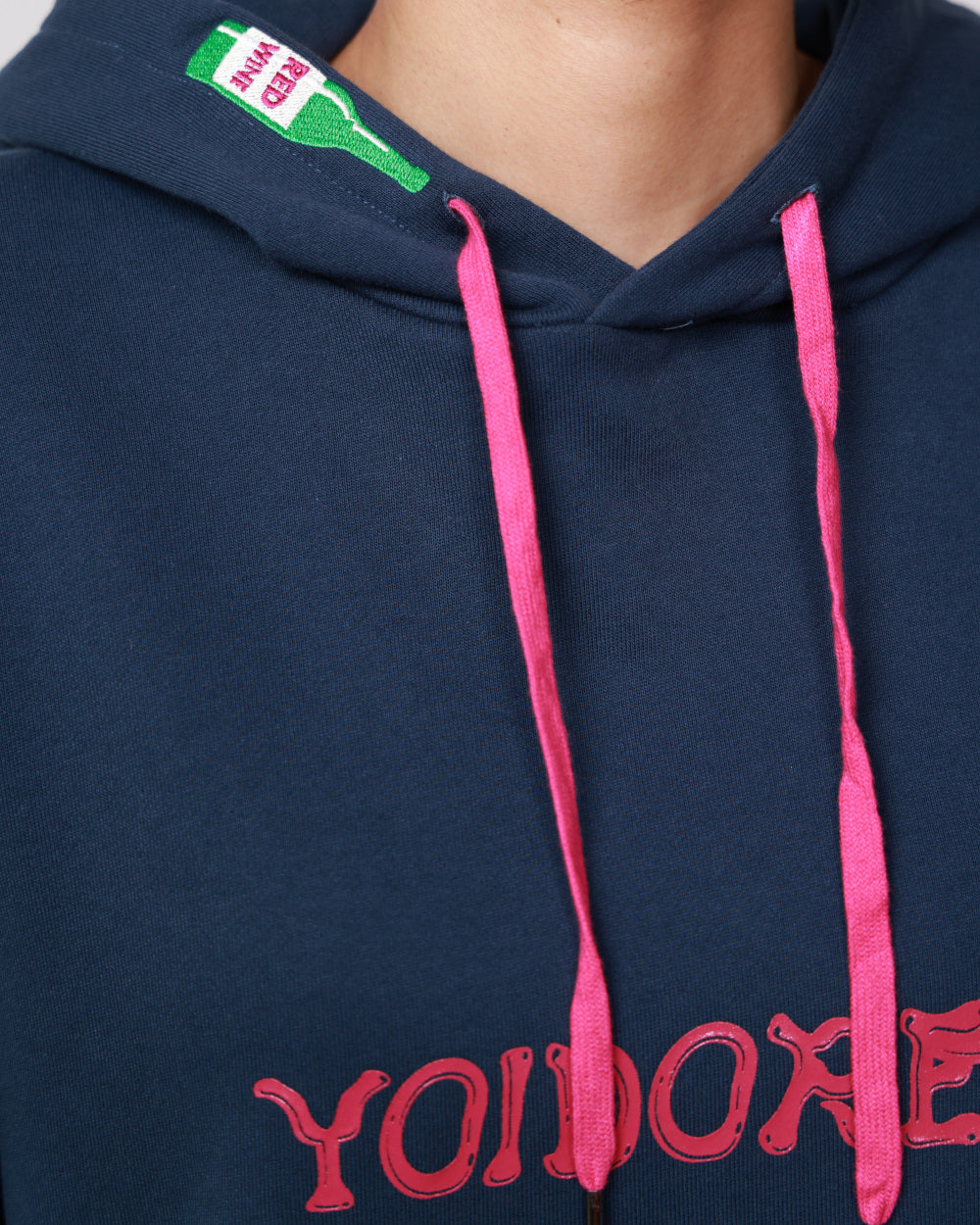 フロントのグラスは刺繍、こぼれたワインYOIDOREロゴはジェルプリントで液体感を表現しています。