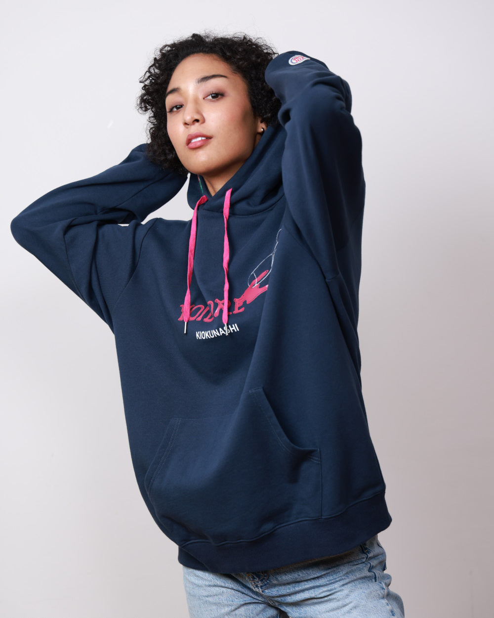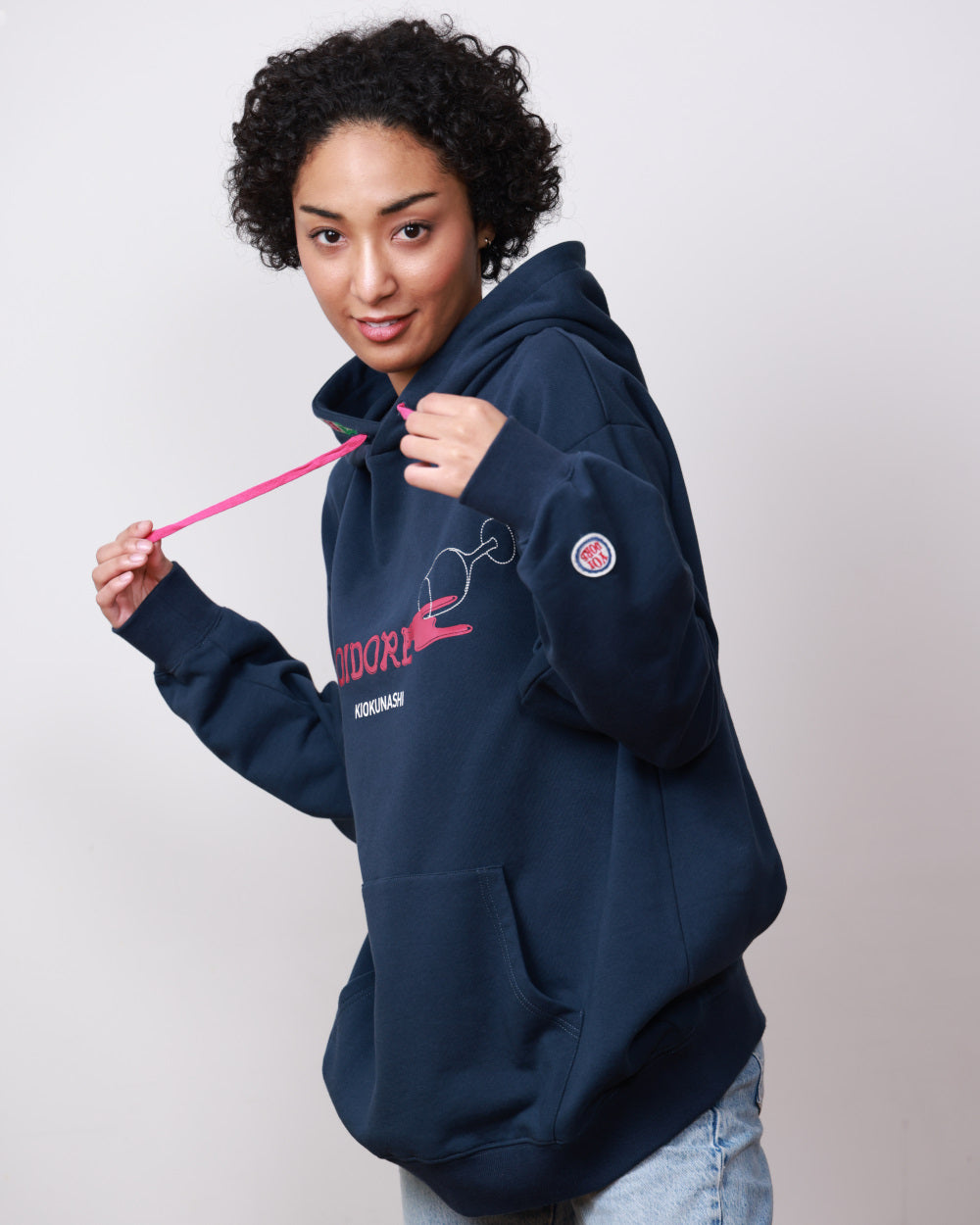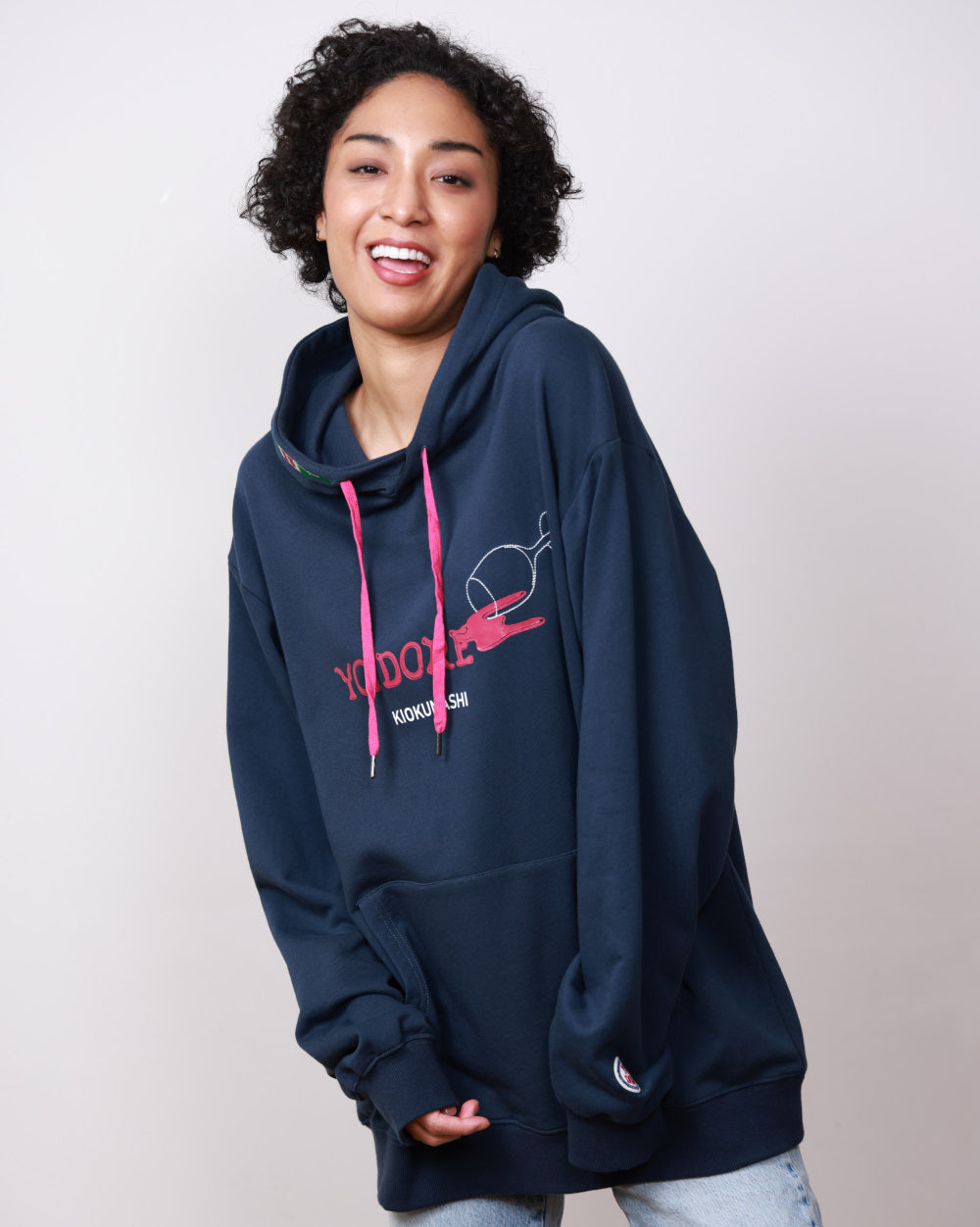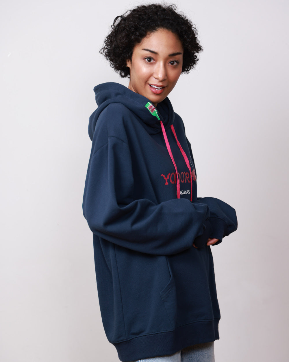 フロントのグラスは刺繍、こぼれたワインYOIDOREロゴはジェルプリントで液体感を表現しています。