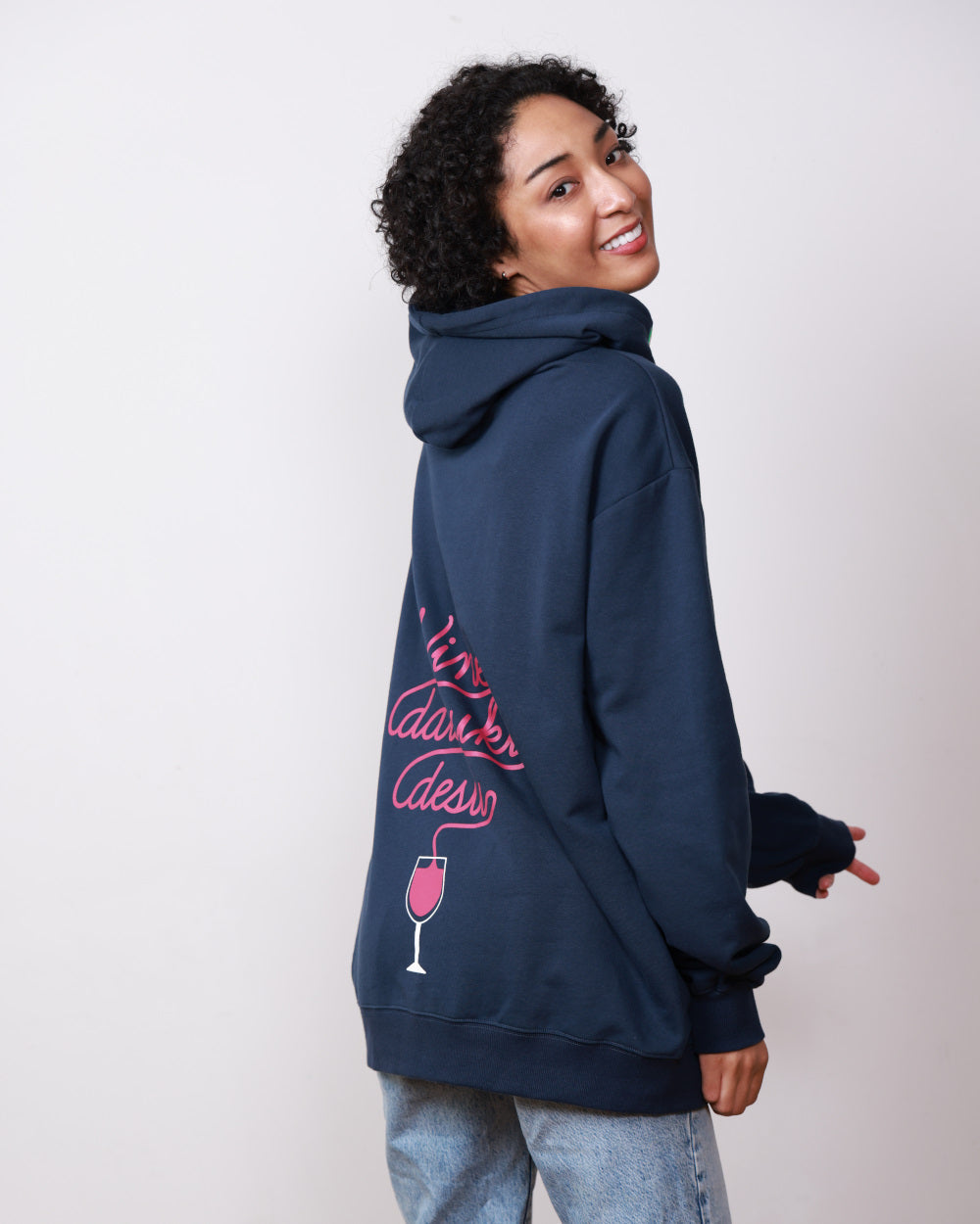 ワインボトルの刺繍から新たに注がれるワイン。フードスピンドルを注がれるワインに見立てたユニークなデザインです。