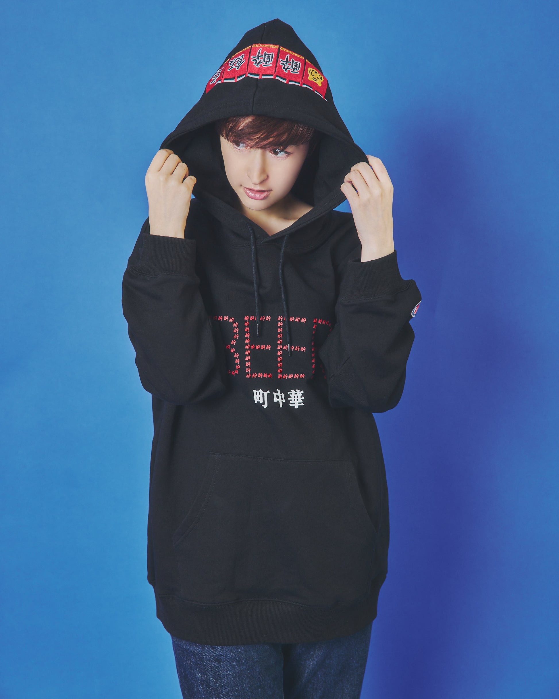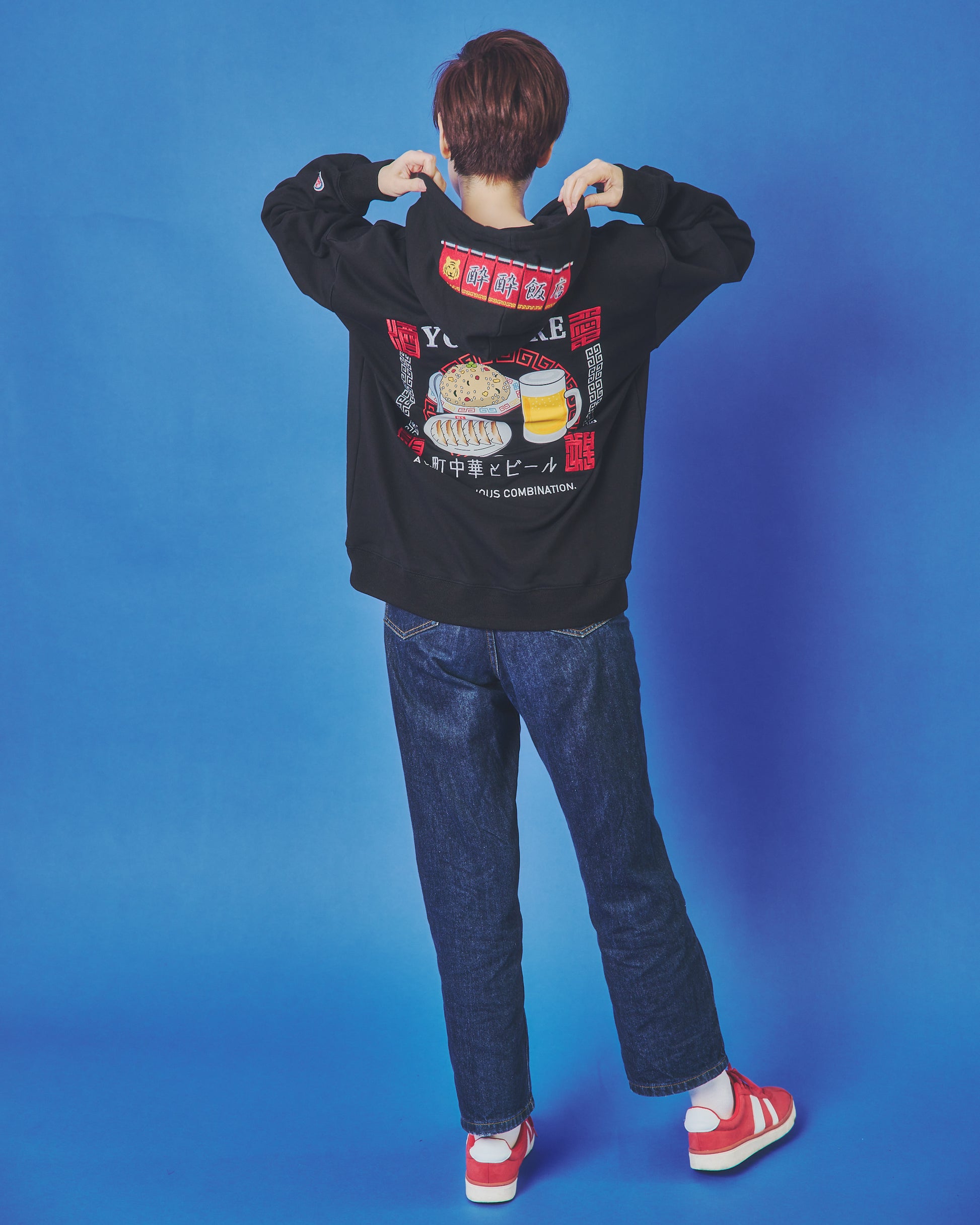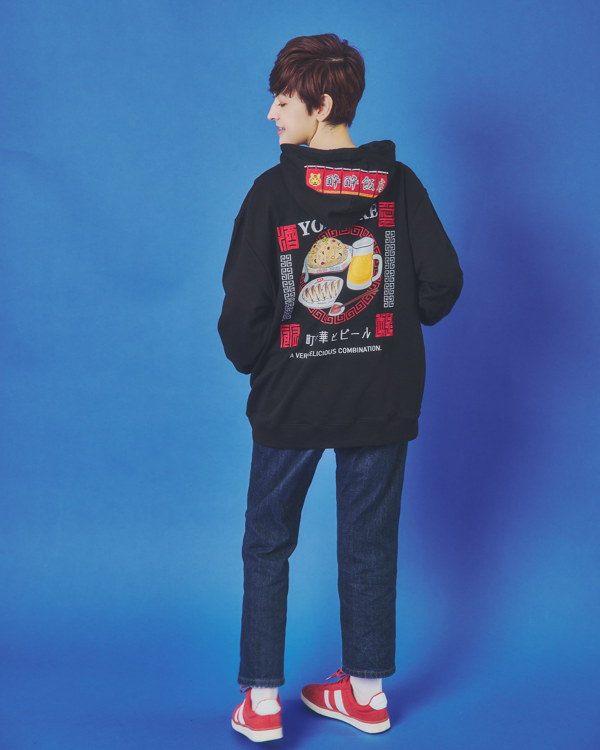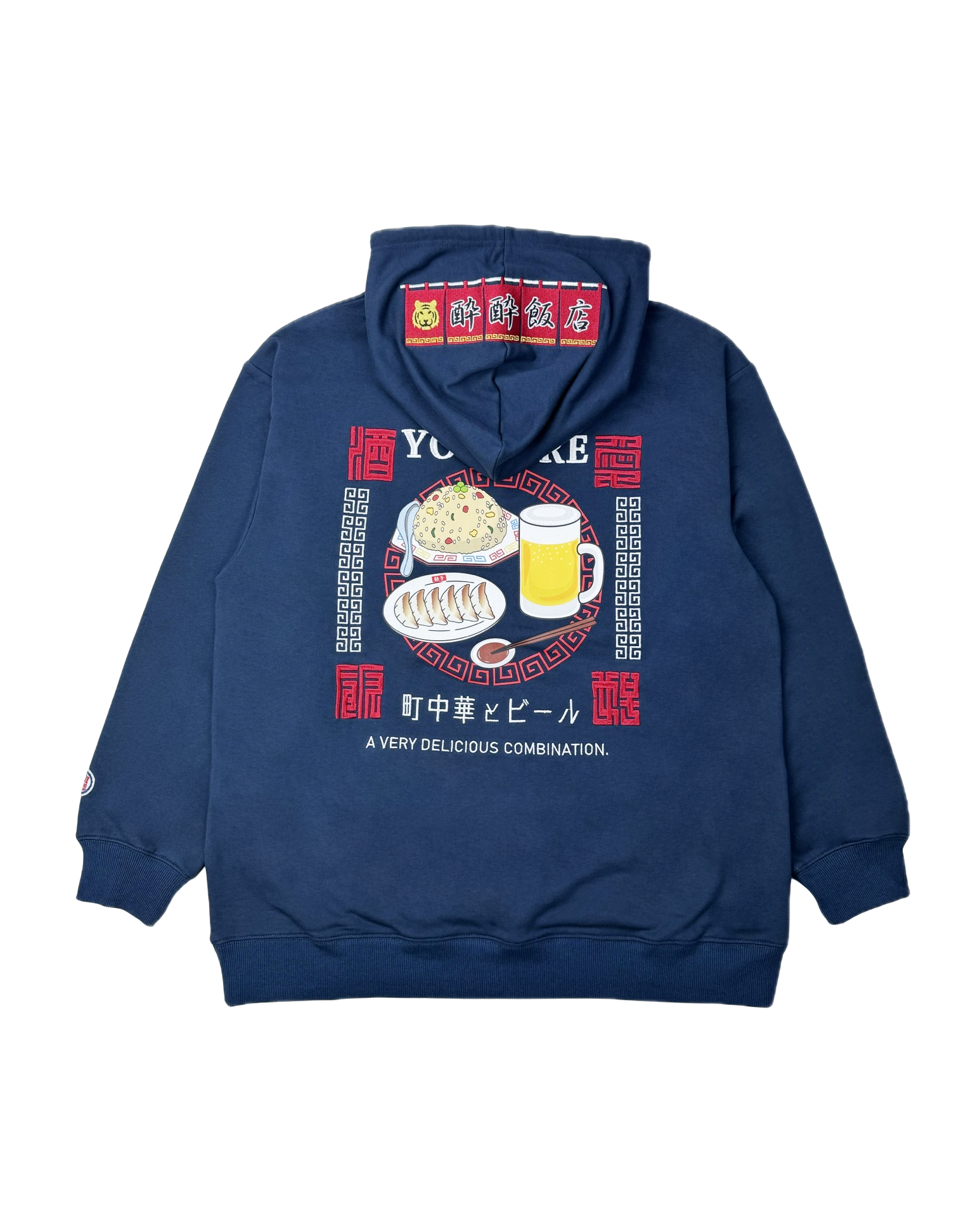 フードには架空の町中華店「酔酔飯店」の暖簾をガッチリ刺繍でアクセントに。